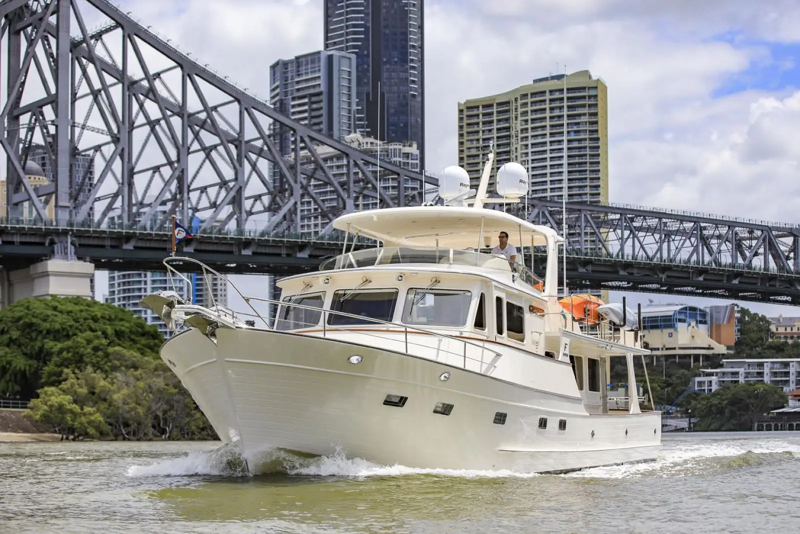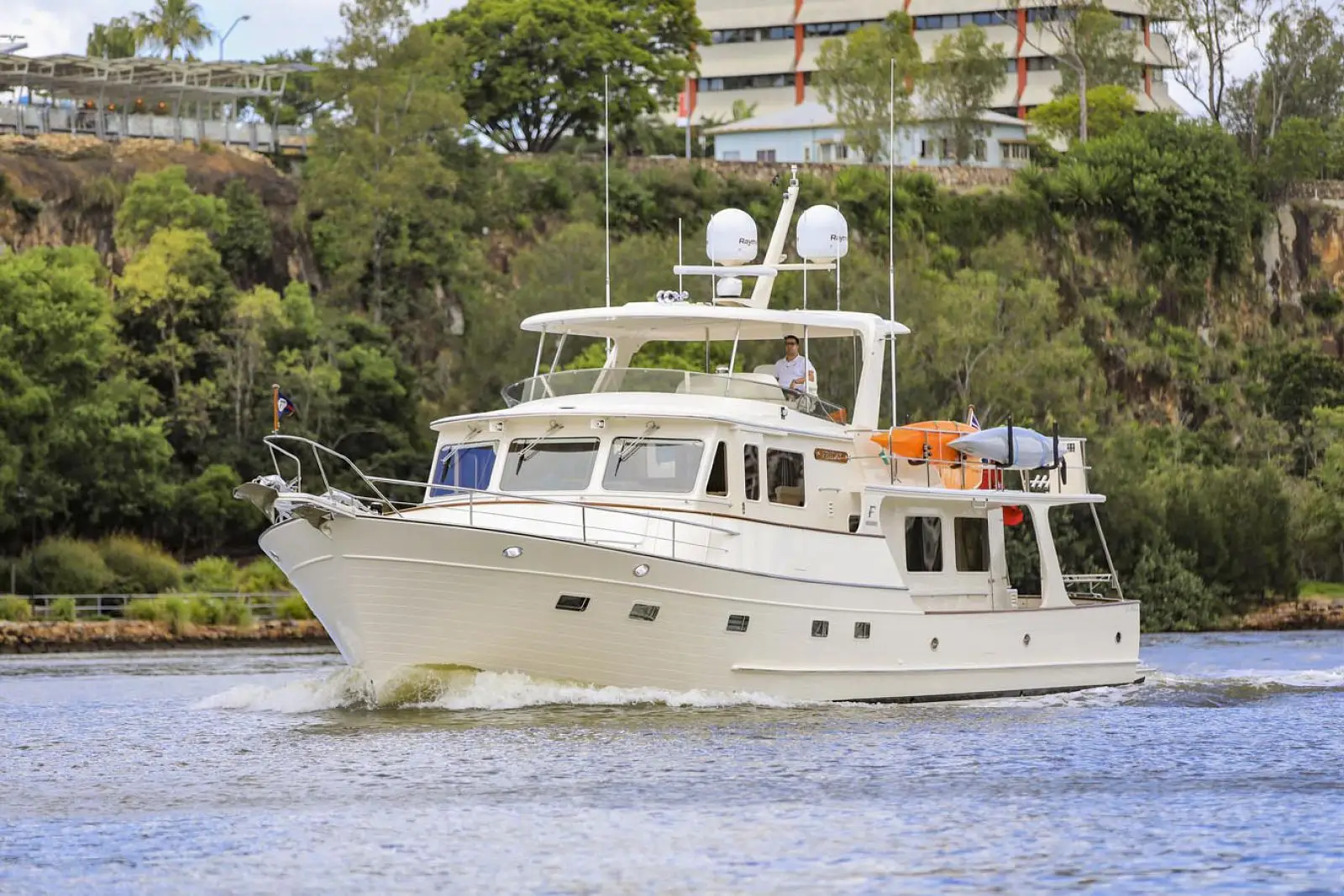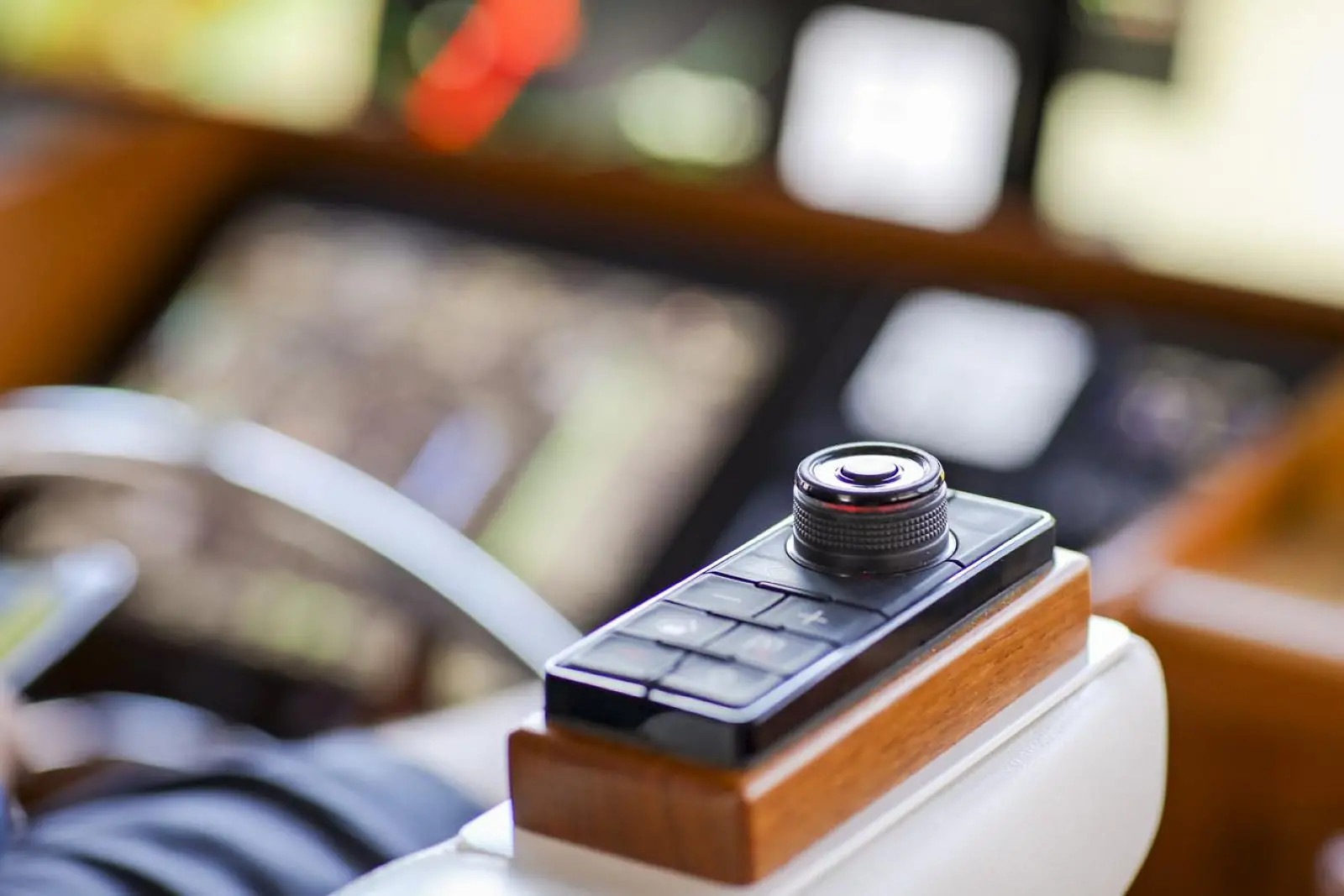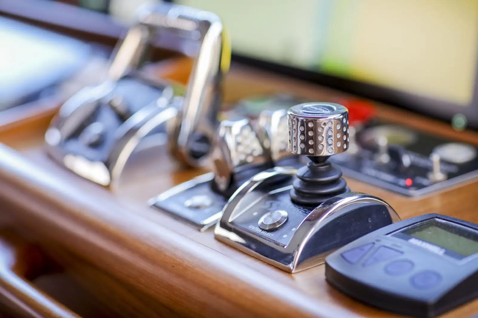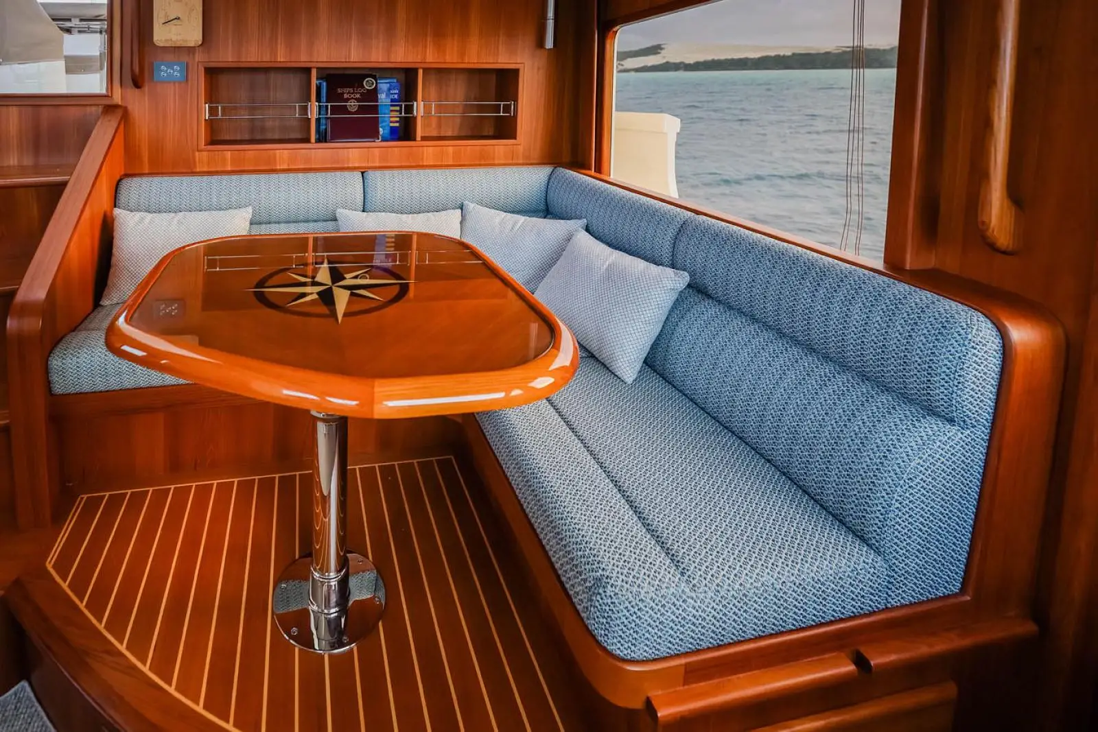 Visibility forward and to port and stbd is excellent, and two sliding doors open to the wide side decks. A traditional teak and holly sole is standard. There are large drawers and working space for charts, cruising books, navigation instruments, binoculars, cell phones and chargers, log books, flashlights and everything else a captain needs to chart and follow a safe course. A large stainless steel and teak-trimmed destroyer steering wheel fits the ambience of this ultimate cruising yacht.
