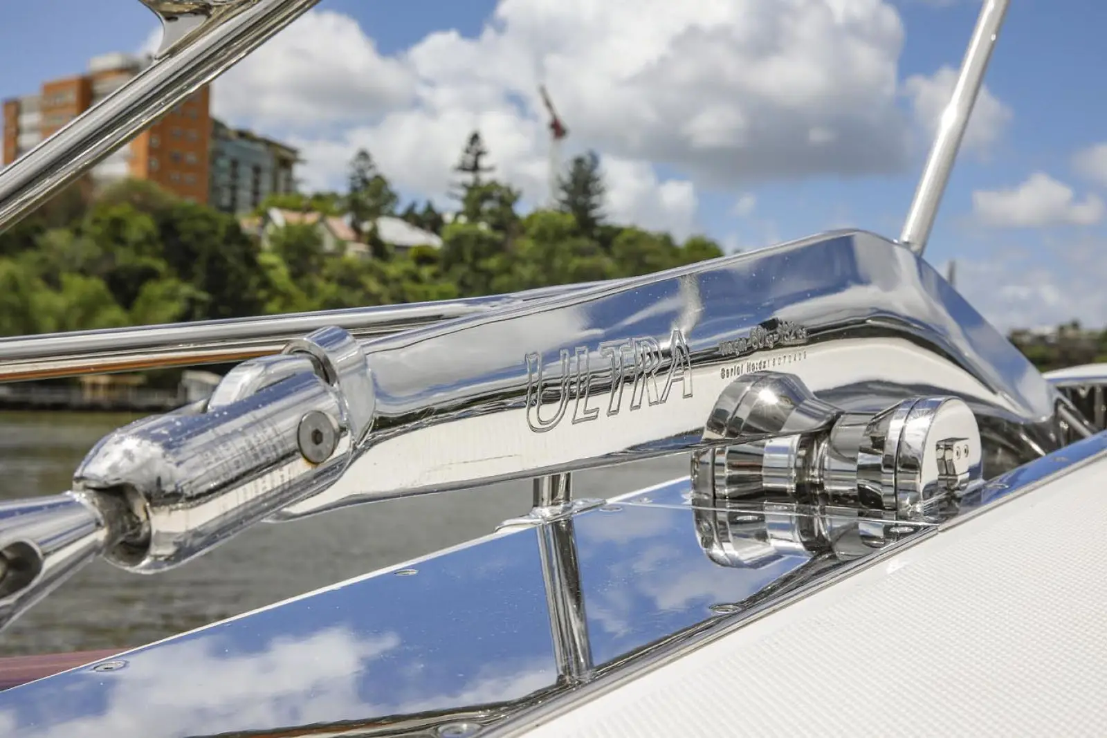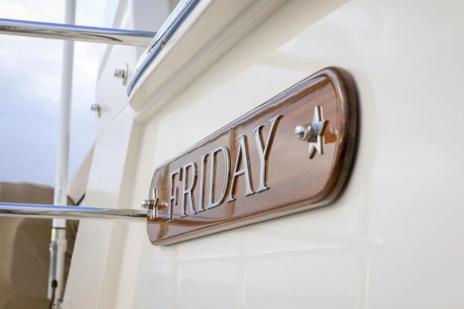A teak caprail and oval shaped stainless steel handrail are standardl. To prevent damage during docking, the handrail is located slightly inboard of the bulwark. Moving aft, the cabin top features four built-in storage lockers, ideal for stowing lines and fenders. The lockers and the deck drains into specially designed, hidden manifolds, which exit just above the waterline, keeping the topside free of dark streaks.