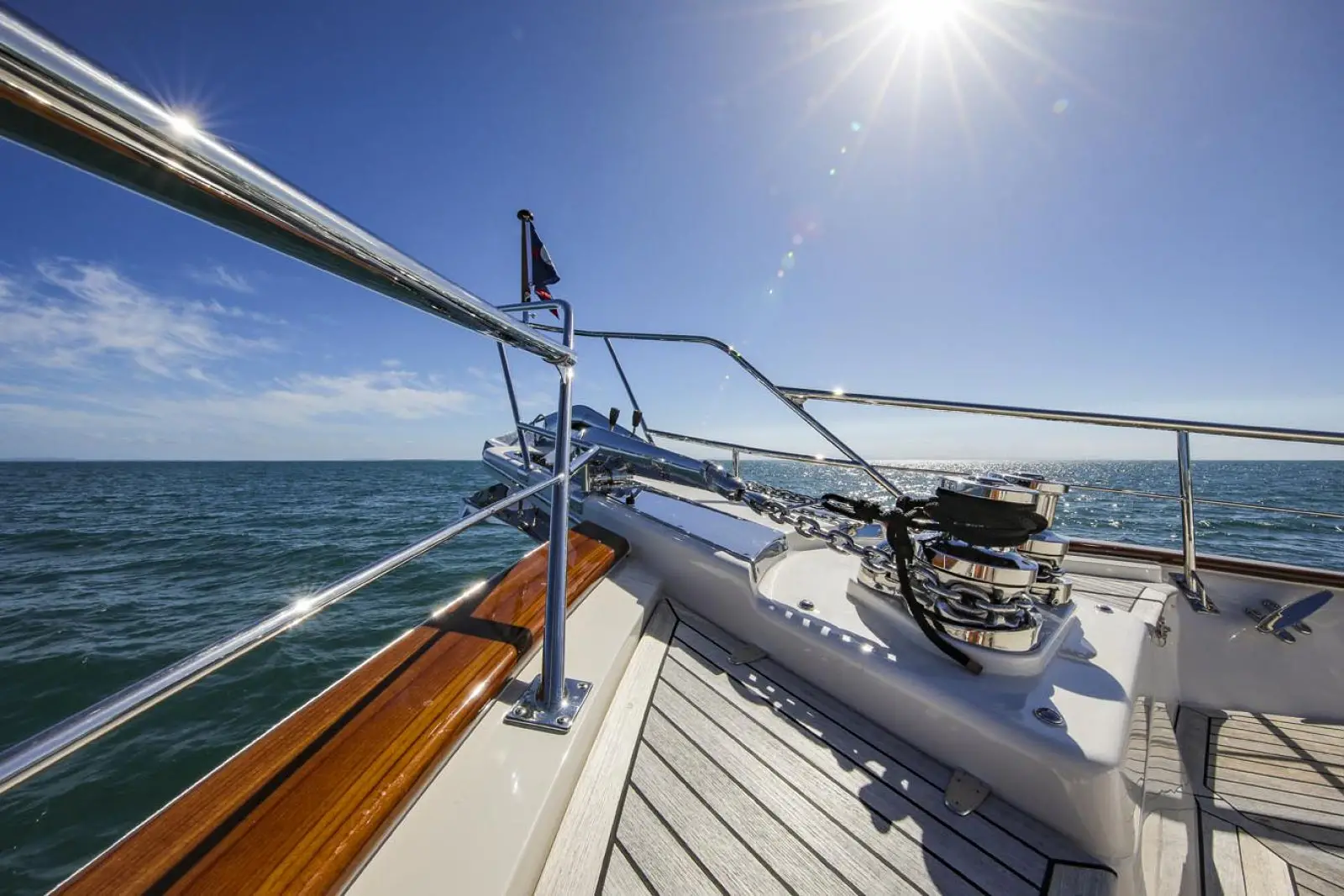 Protection against heavy weather is provided by the Portuguese Bridge, which features port and stbd gates for access between the foredeck and the side decks. Deck level LED courtesy lighting enhances safety after dark. The aft section of the Portuguese Bridge features built-in storage lockers for a variety of cruising gear.