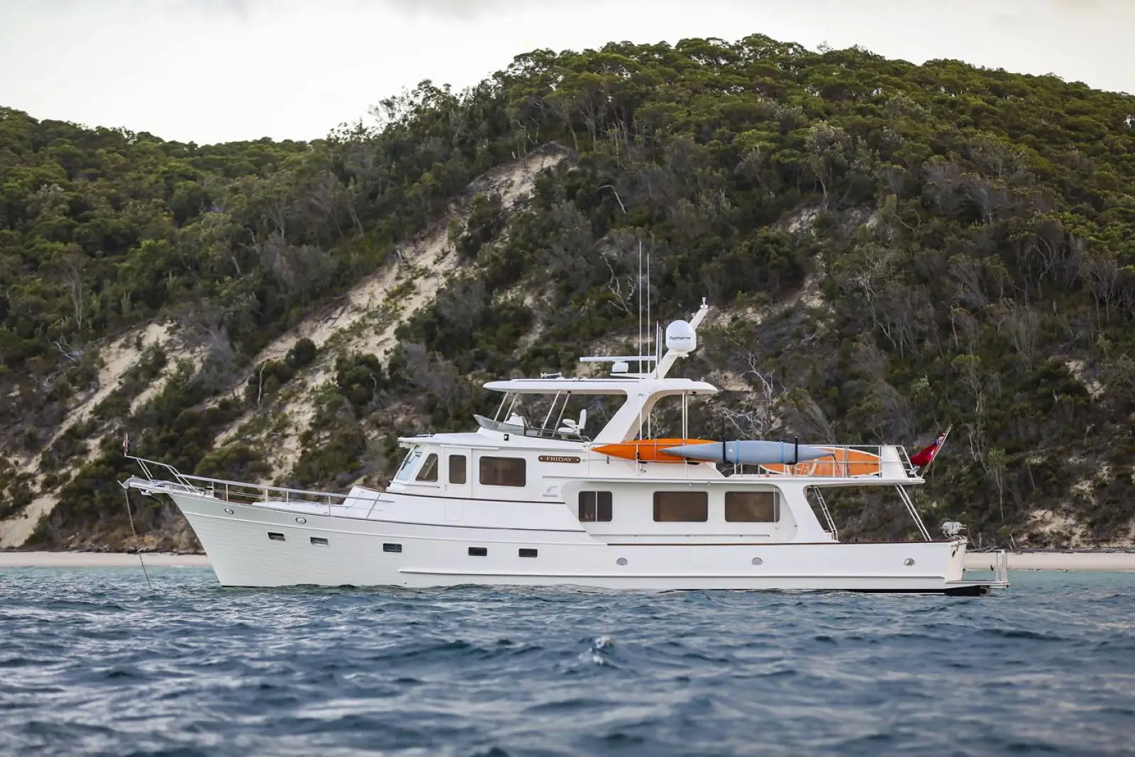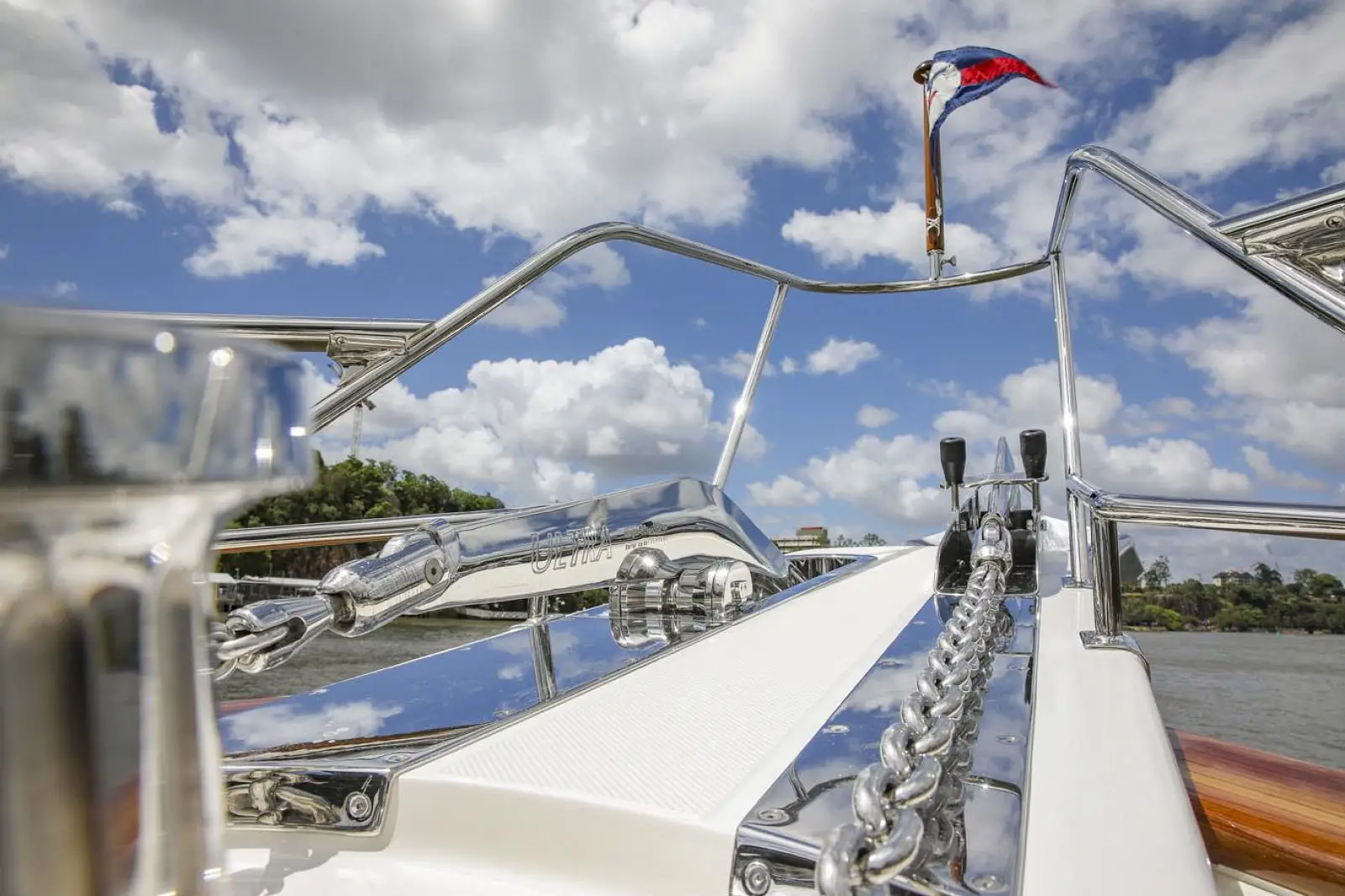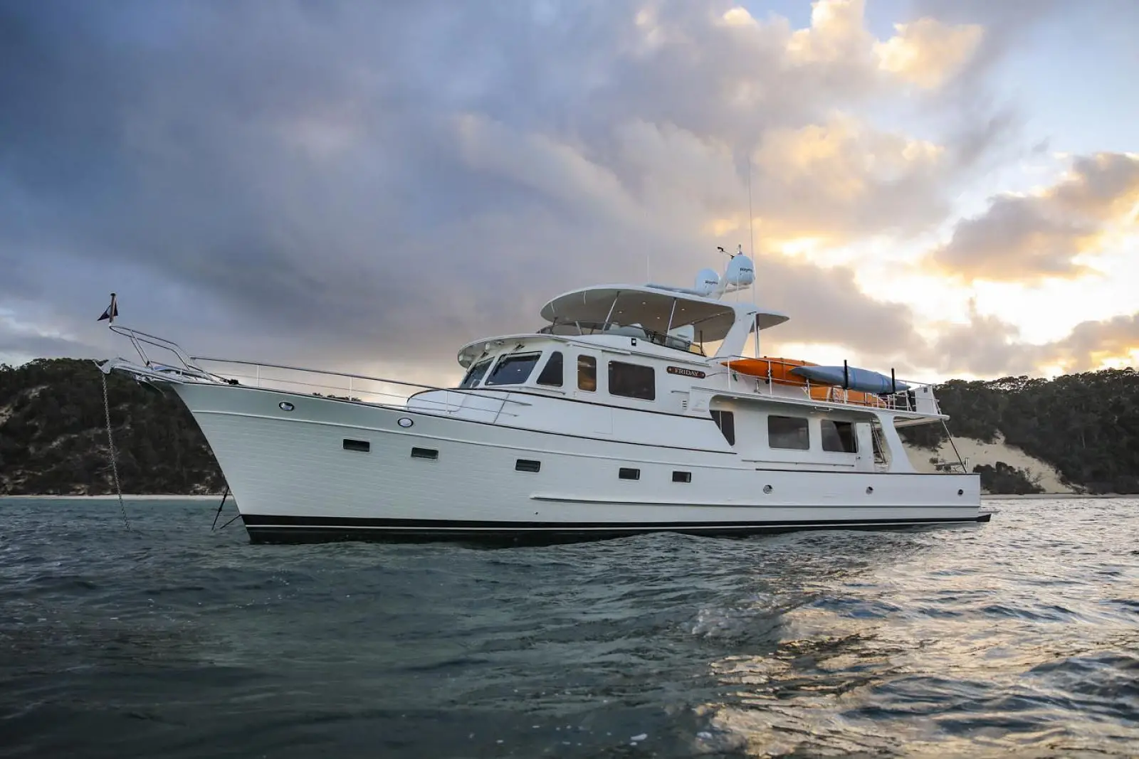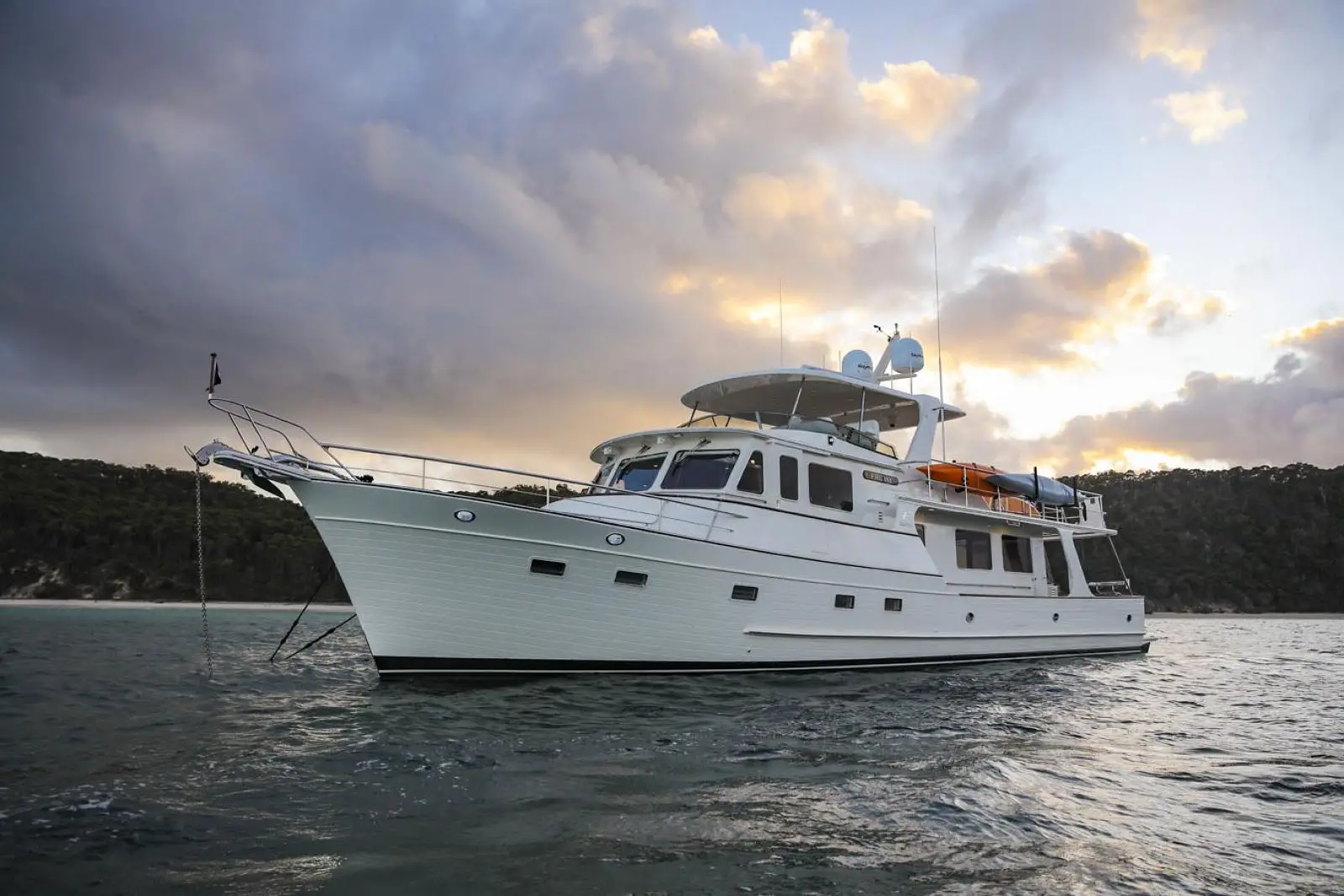 As with all Flemings, special attention has been paid to the ease and safety in which the heavy duty ground tackle is set and retrieved. Originally designed for the Fleming 75, the 65's anchor platform is especially large and robust. The anchor platform accepts two 132 lbs. (60Kg) Ultra anchors, each of which can be controlled by a handheld unit at the platform or by windlass controls at both pilothouse and flying bridge stations. A pair of hydraulically powered Maxwell RC12 vertical windlasses with capstans are standard equipment, as is a 300ft (91m) length of Grade-60 stainless steel chain.Â