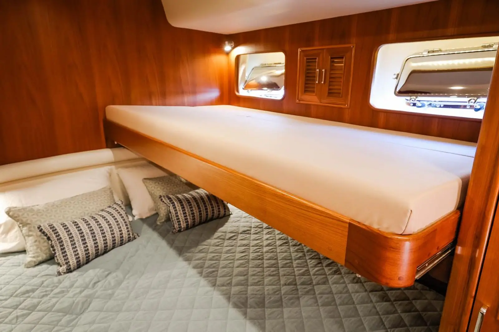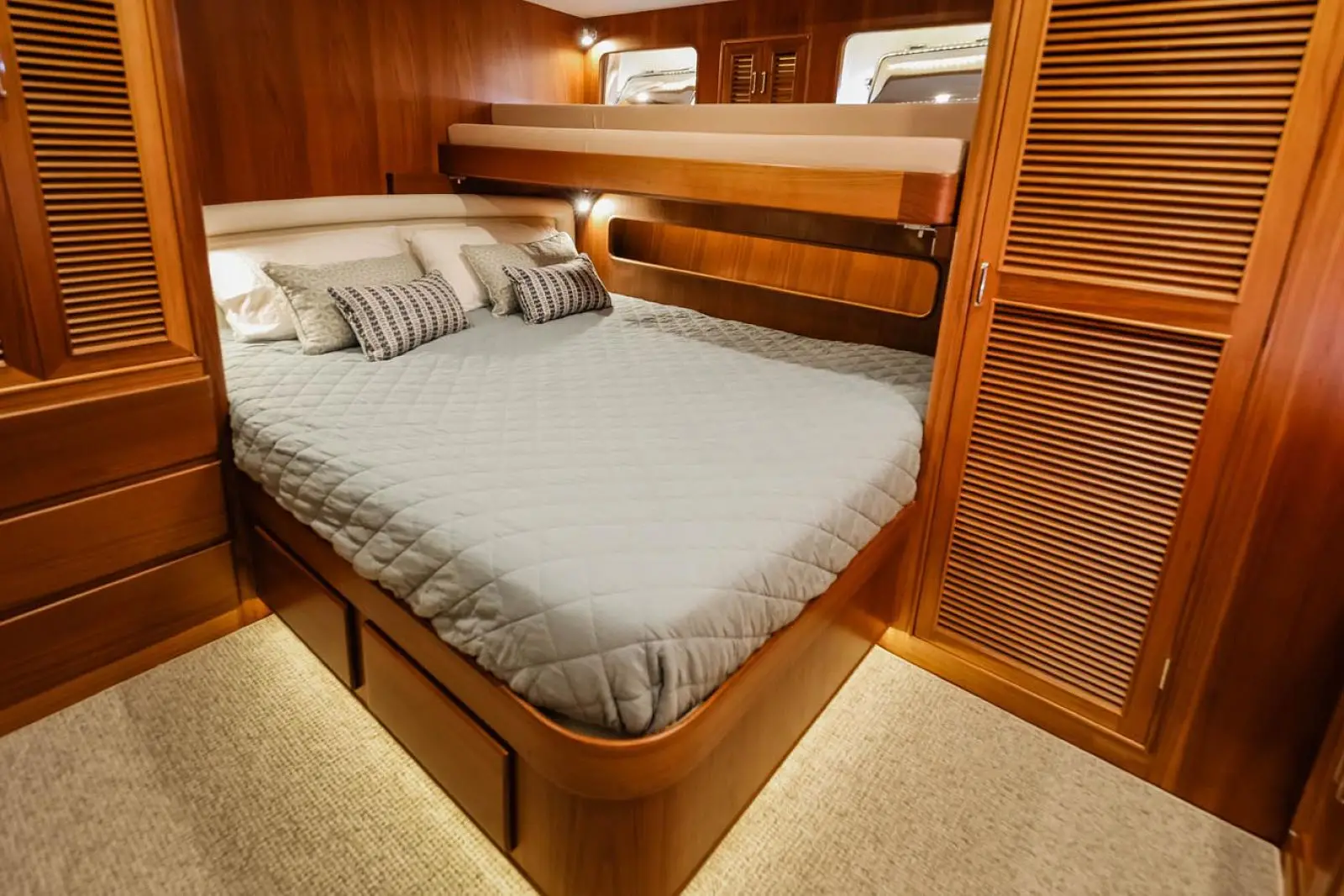 In most cases, the owner's stateroom is located forward and features an island berth that lifts for easy storage beneath, a private head, and two large hanging lockers.