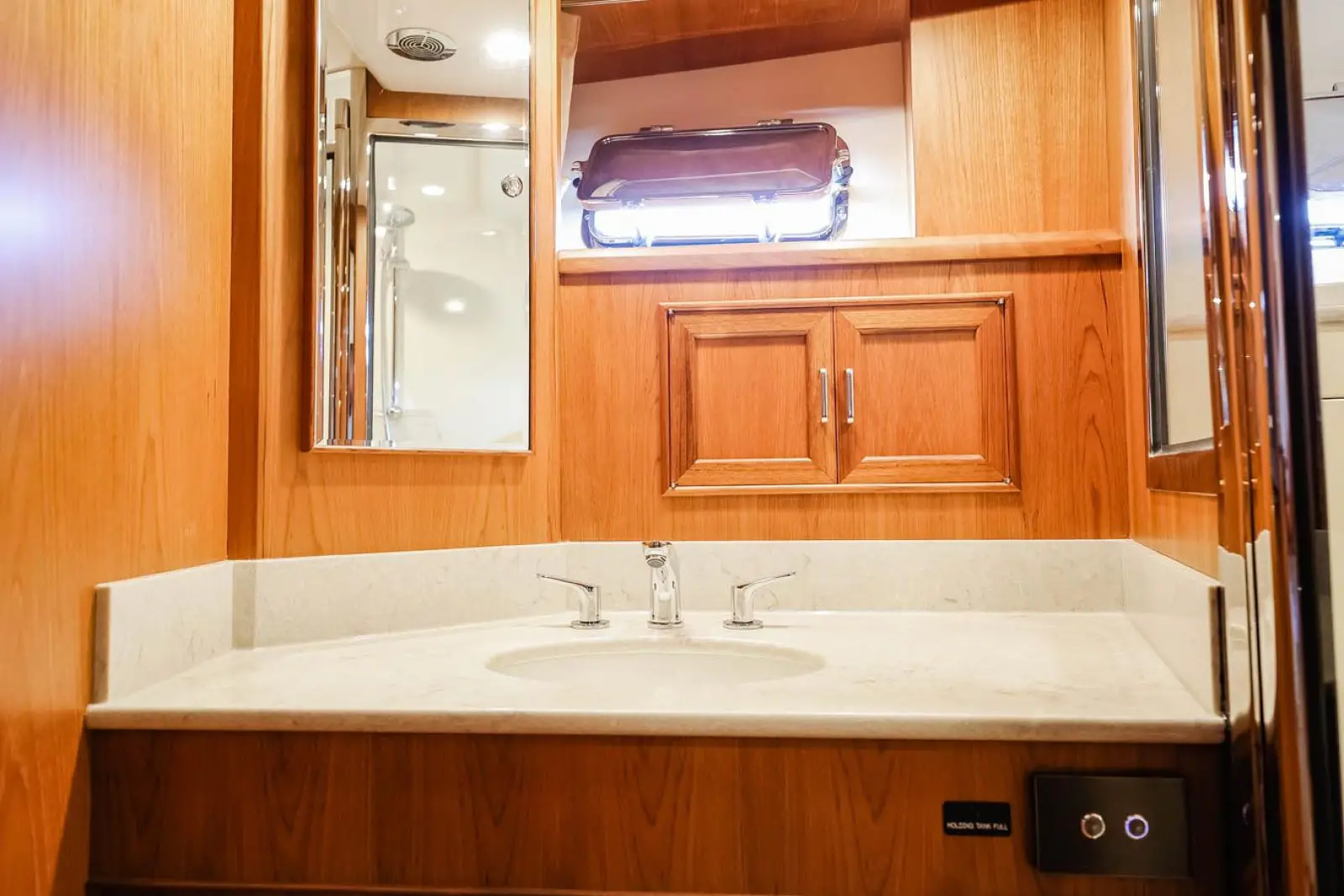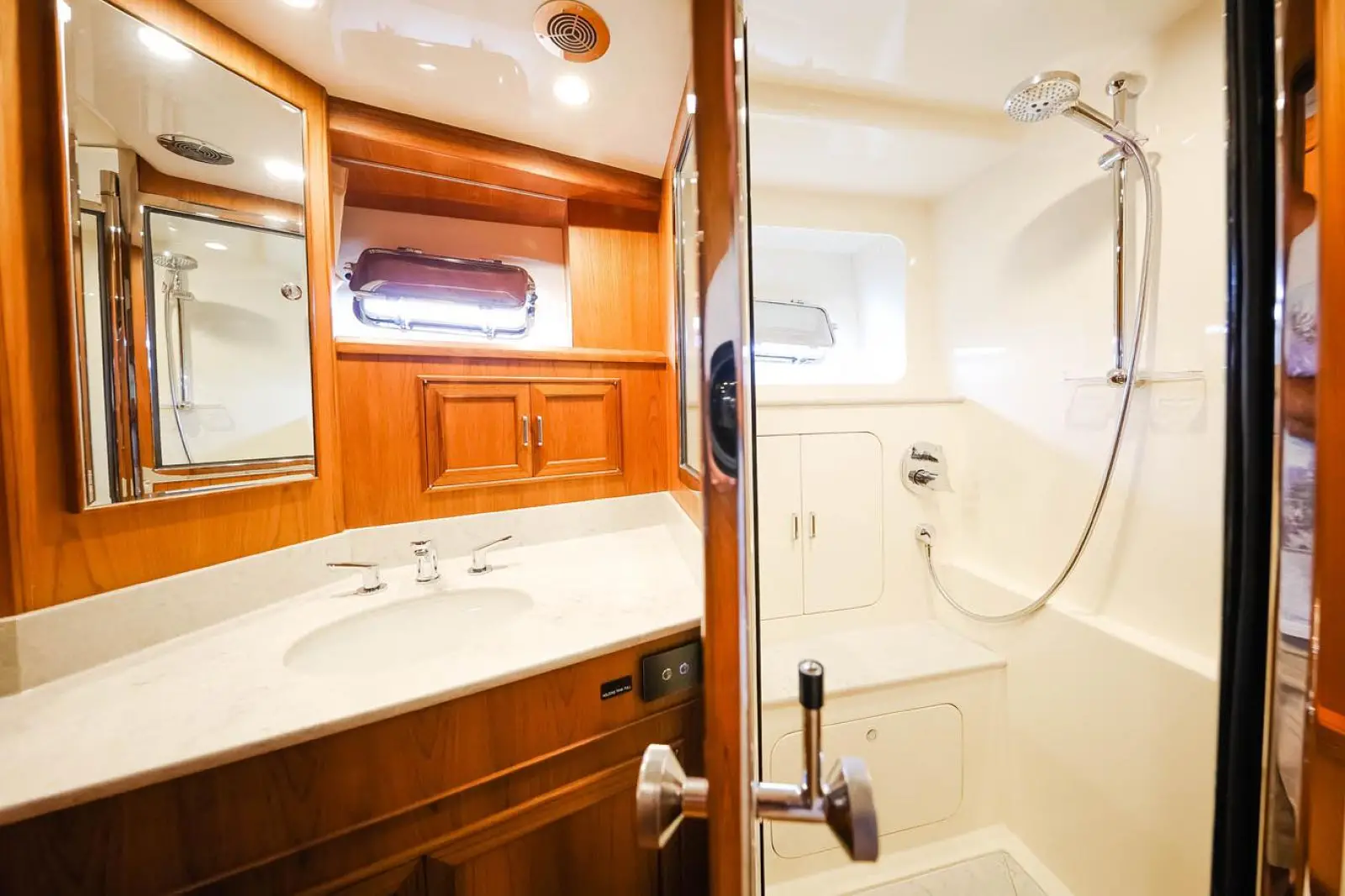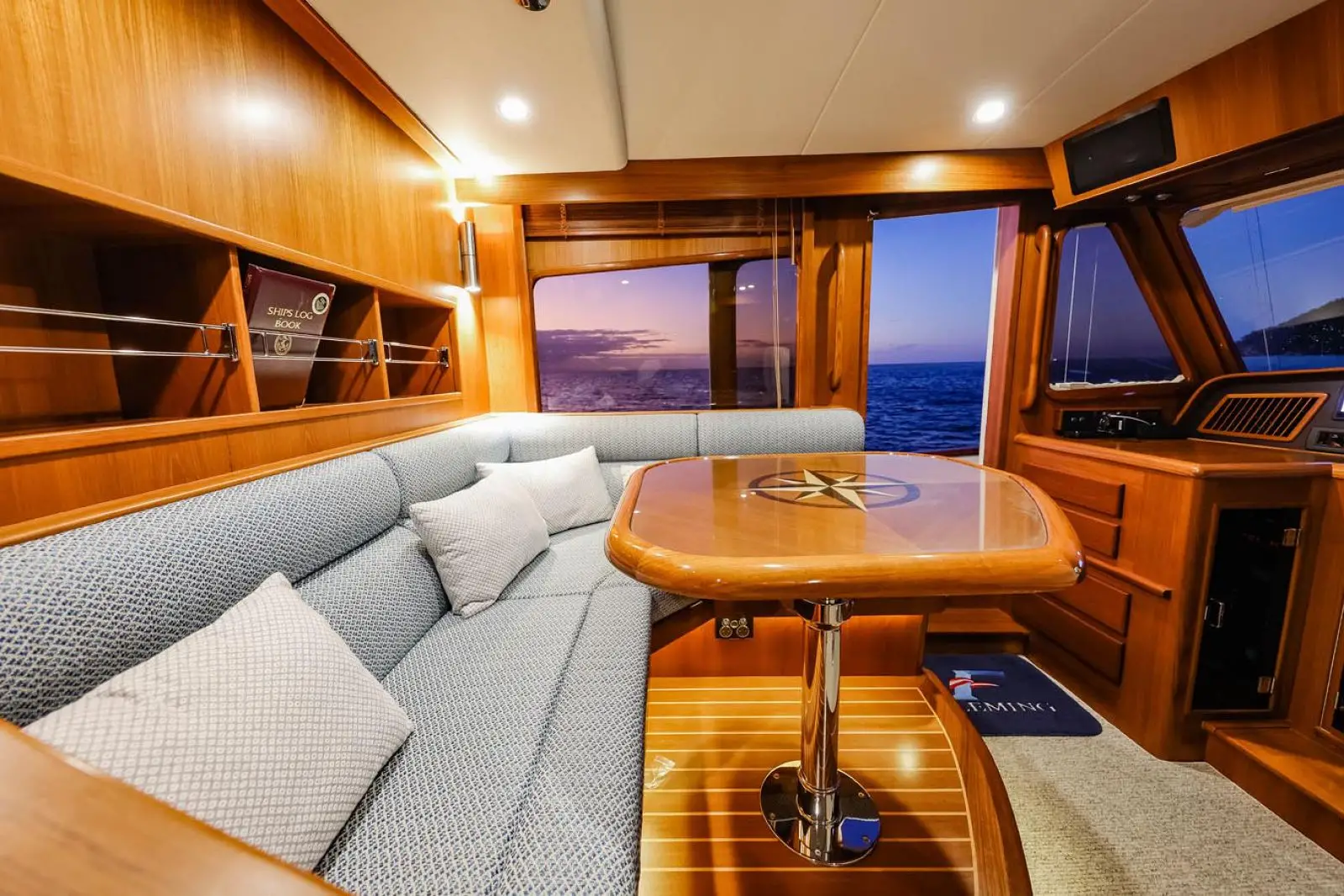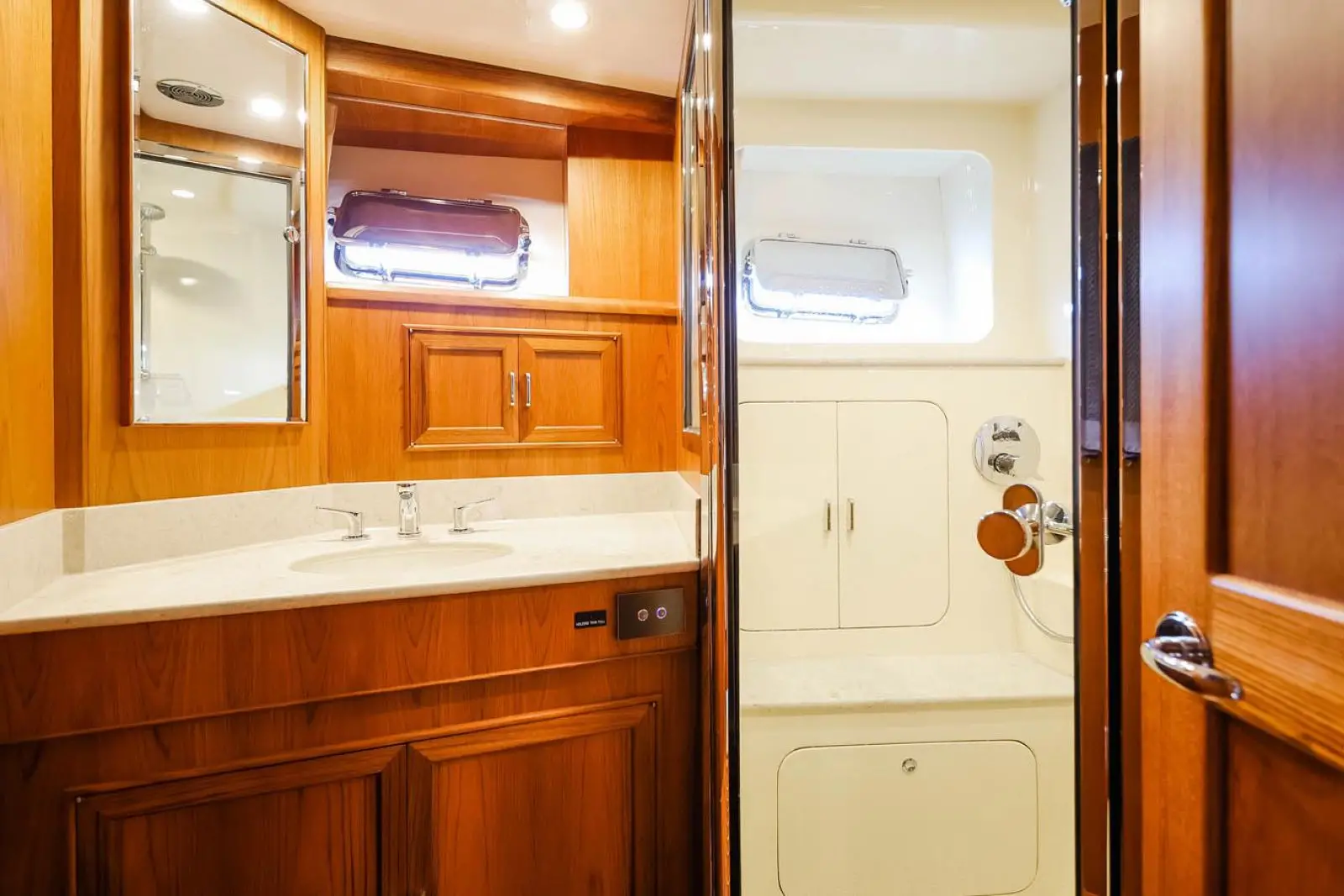 In the aft, port corner, the owner has a choice of a wet bar with refrigerator and wine cooler or more cabinet space with glass doors. Wooden blinds recessed into the window frames are standard. LED lighting is used throughout, including on the inside of most cabinets.