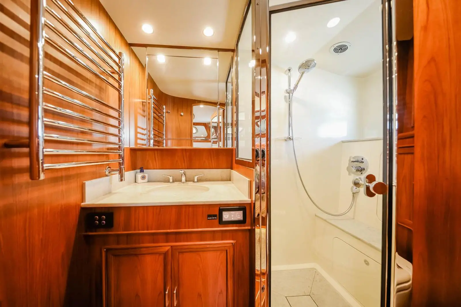 A number of layouts are available for the 3-stateroom accommodations area. Most layouts feature a central passageway, which is just 4-steps down from the main salon area. A full beam master cabin layout is also available with access from the pilothosue.