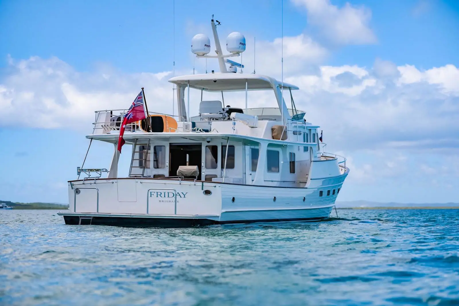 The flybridge is easily and safely accessed by the 5-step stairway from the pilothouse. The upper helm, located on the port side, is slightly raised to enhance visibility forward and features a Stidd double helm seat and a console for full instrumentation and electronics. A U-shaped settee with storage underneath and dining table that seats 6 is standard.