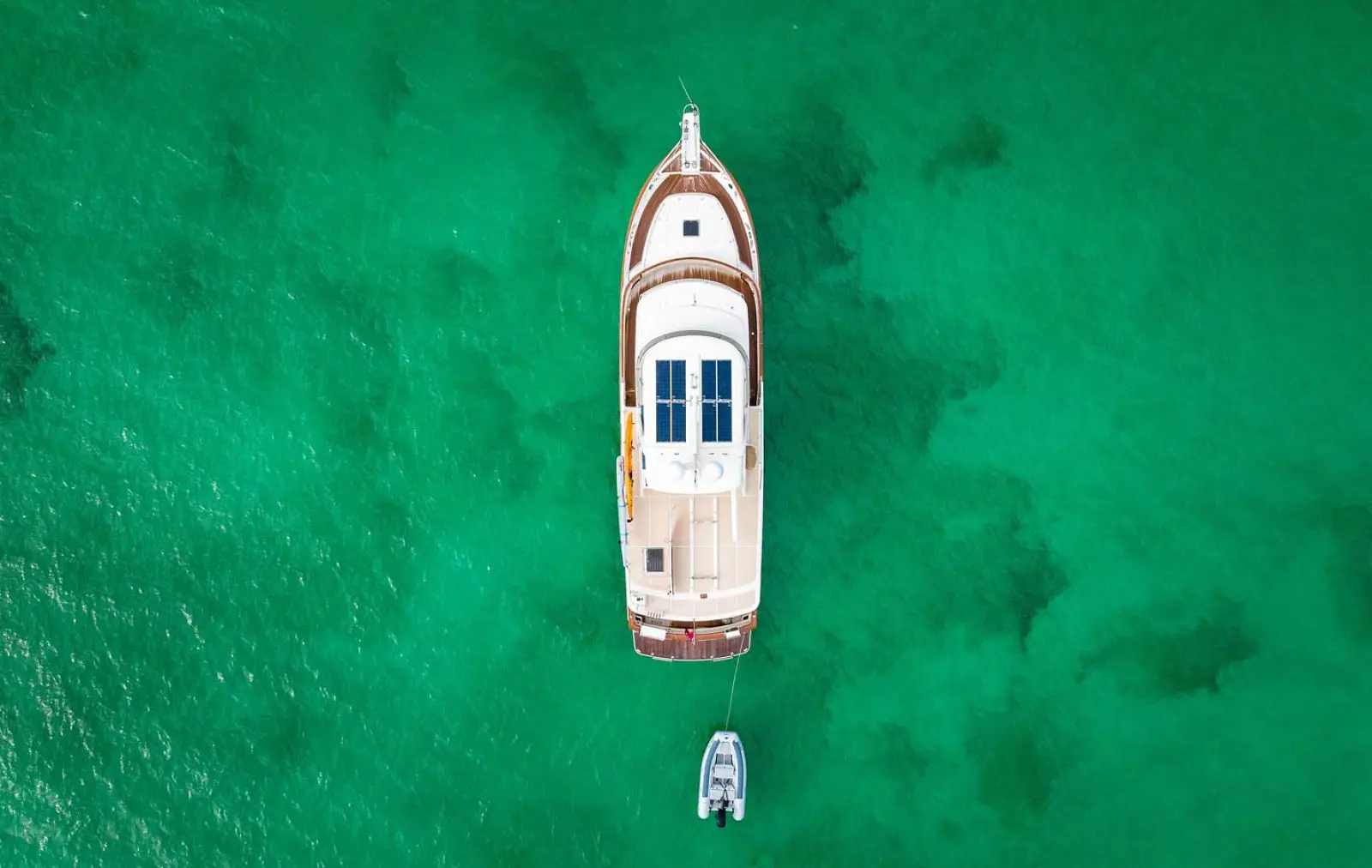 A centerline hatch opens for access to the double chain locker, which is separated from the yacht's interior by a collision bulkhead. The locker can house two 300-foot (91m) lengths of anchor chain and several hundred feet of rode. It is also big enough to stow fenders and extra lines. It drains overboard just above the waterline, keeping the bilge clean and dry.Â
