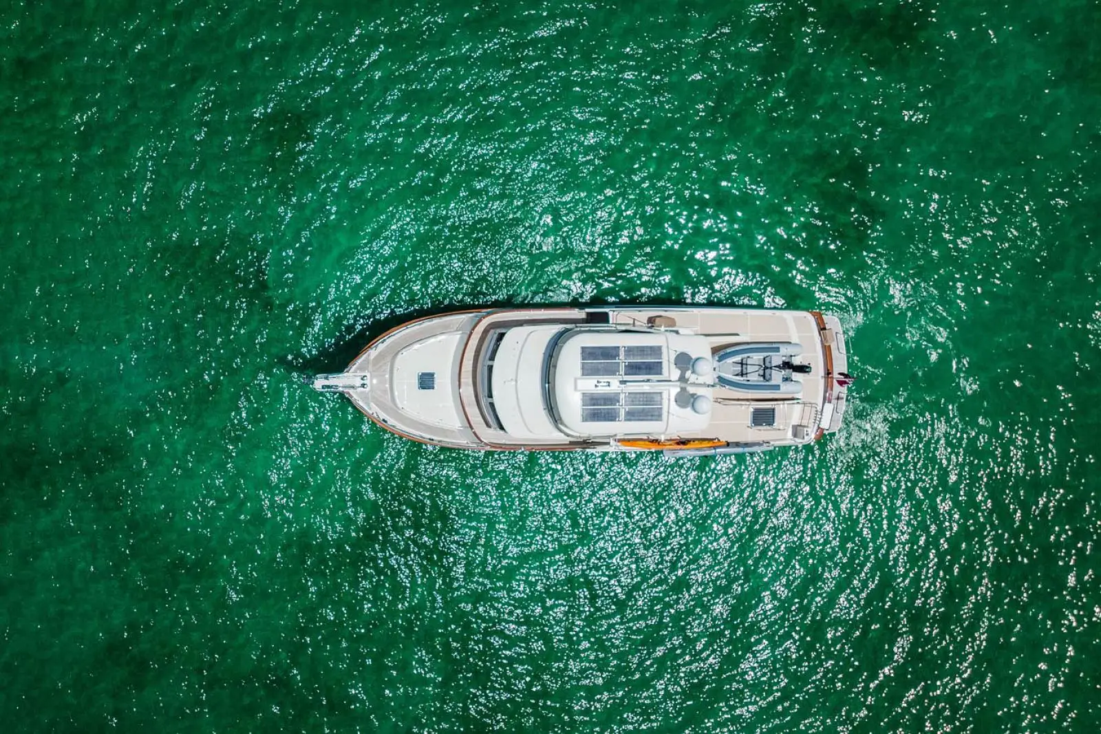 The large cockpit space is beautifully finished with teak decking for its superior non-skid properties and sound dampening qualities. While many owners prefer to keep this space open for a variety of watersports activities, others use it as an outside dining area. A dining table can be ordered that follows the contour of the transom, with seating for 8.