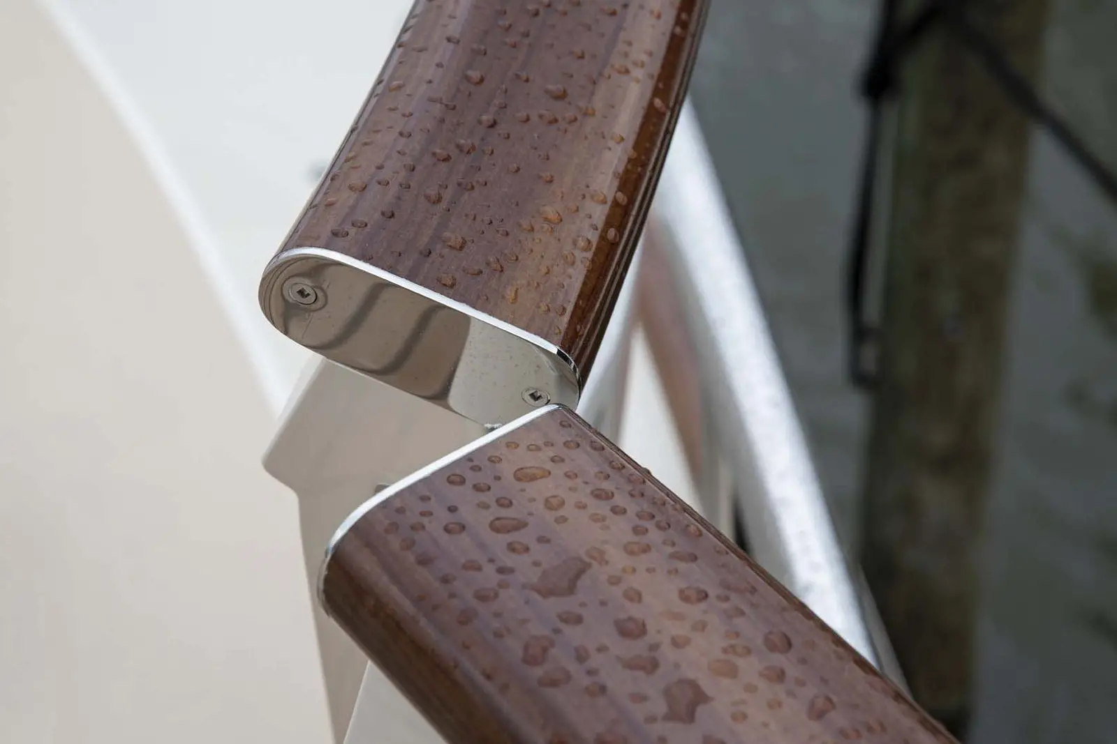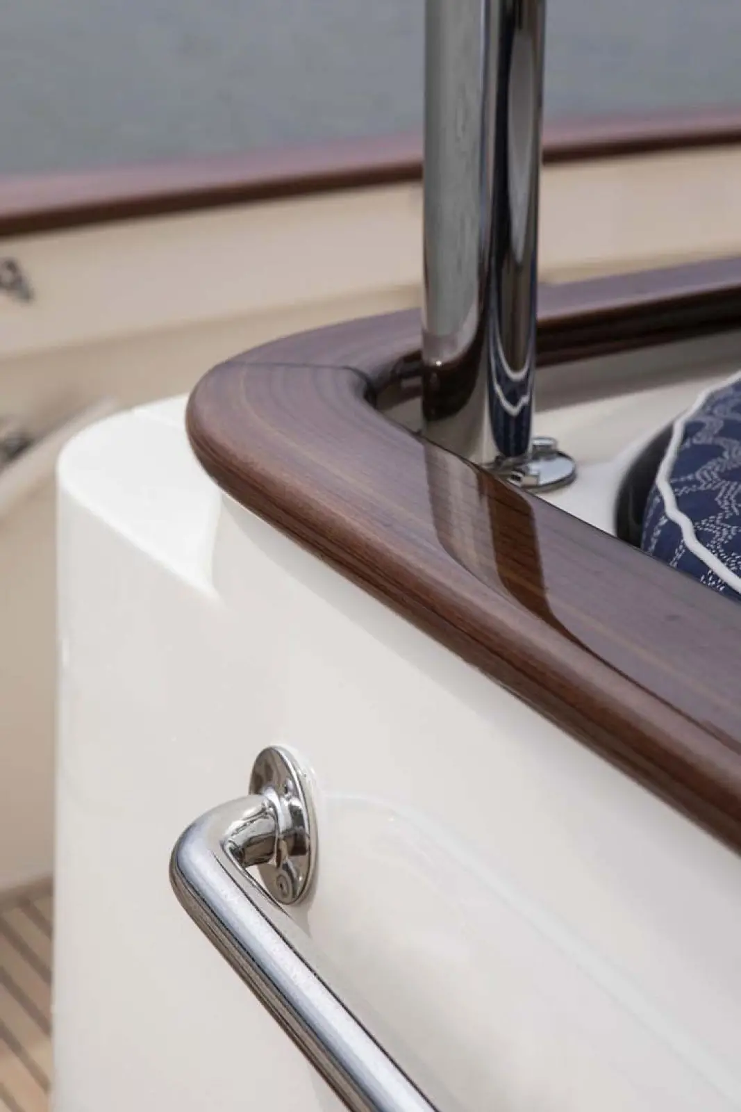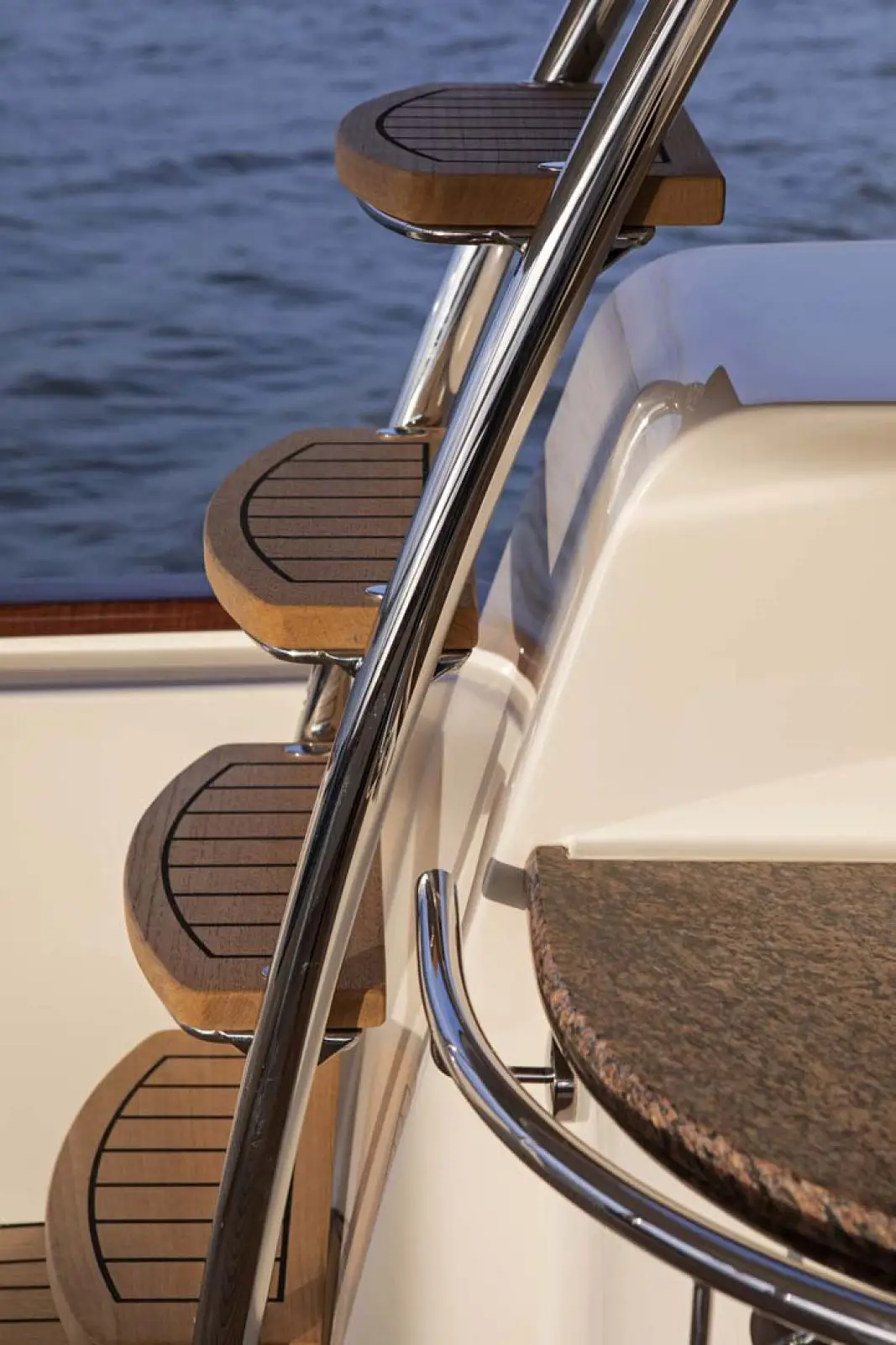 The stainless steel oval-section handrail has been brought inboard for security. Additional stainless steel handrails are provided on the top of the non-skid cabin trunk for the convenience of children as well as providing tie-down points for optional cushions.