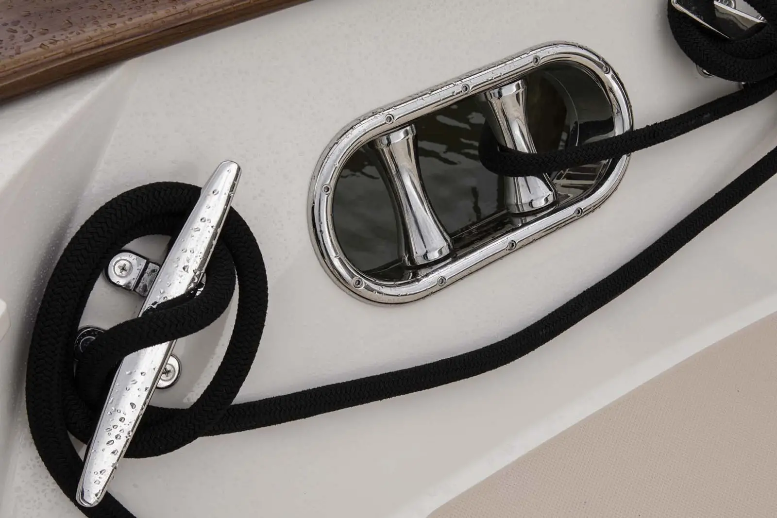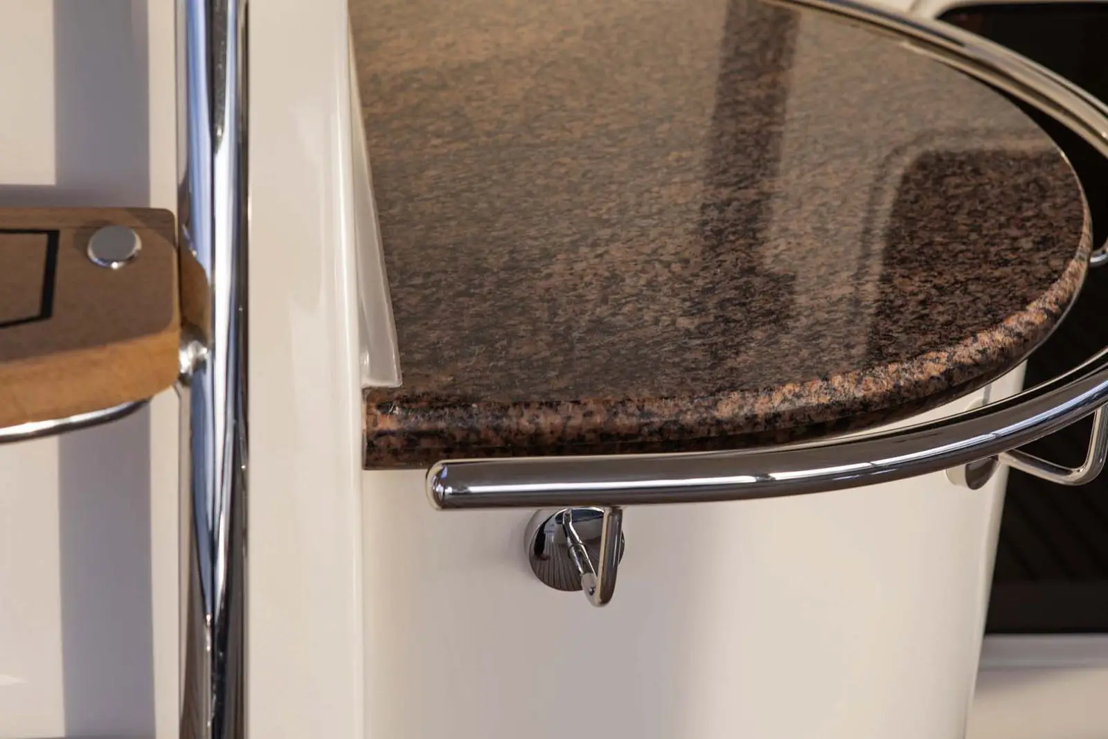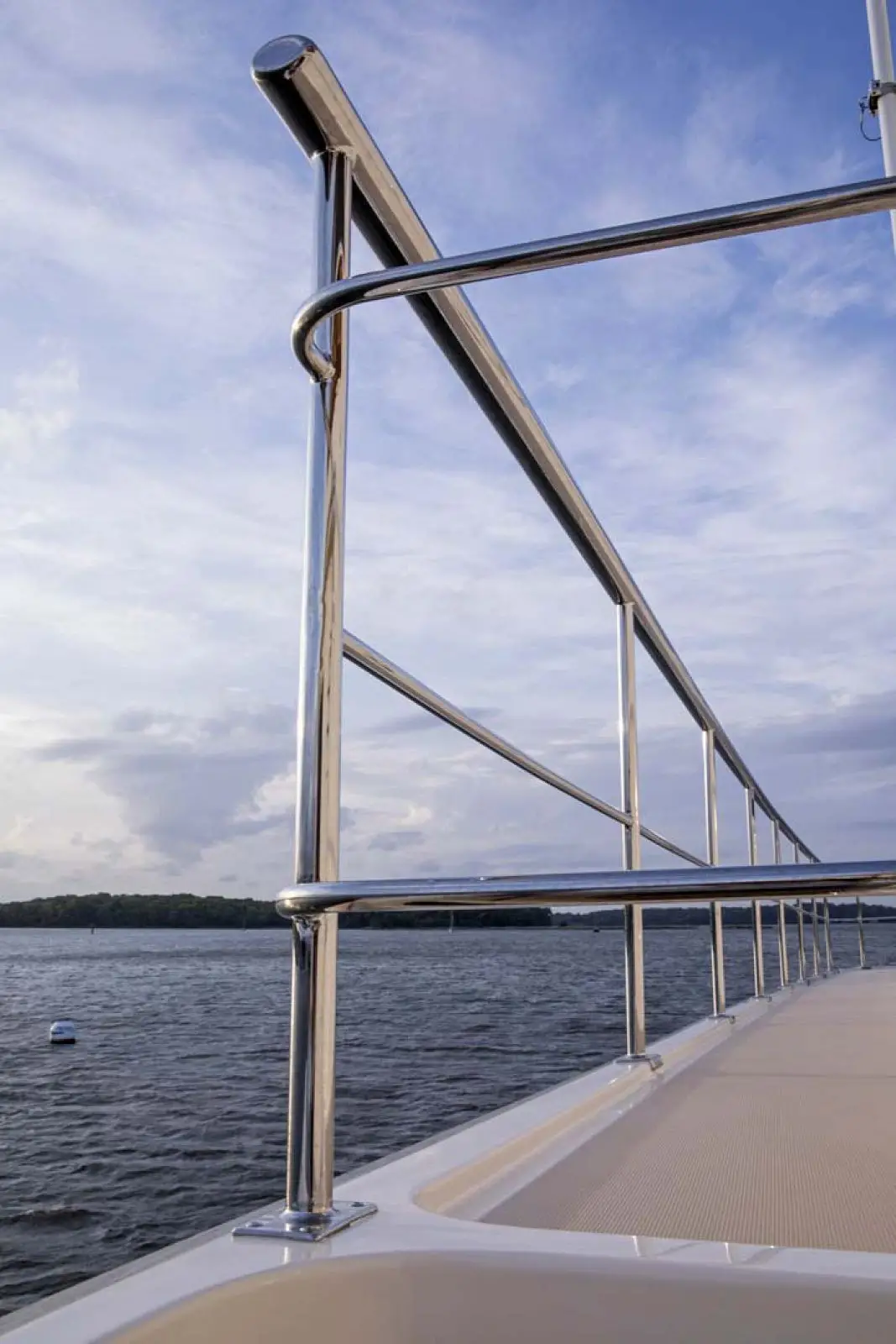 The stainless steel oval-section handrail has been brought inboard for security. Additional stainless steel handrails are provided on the top of the non-skid cabin trunk for the convenience of children as well as providing tie-down points for optional cushions.