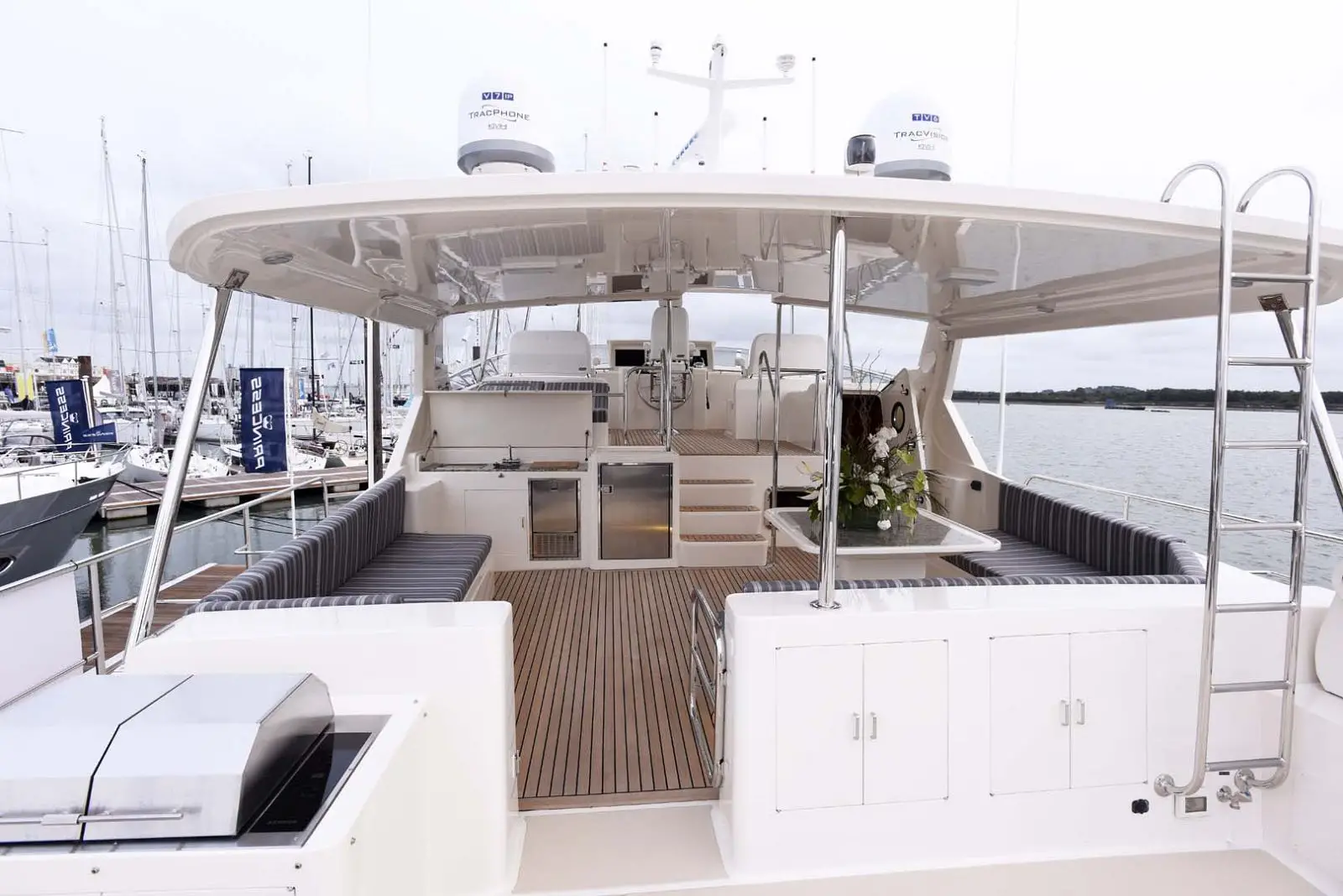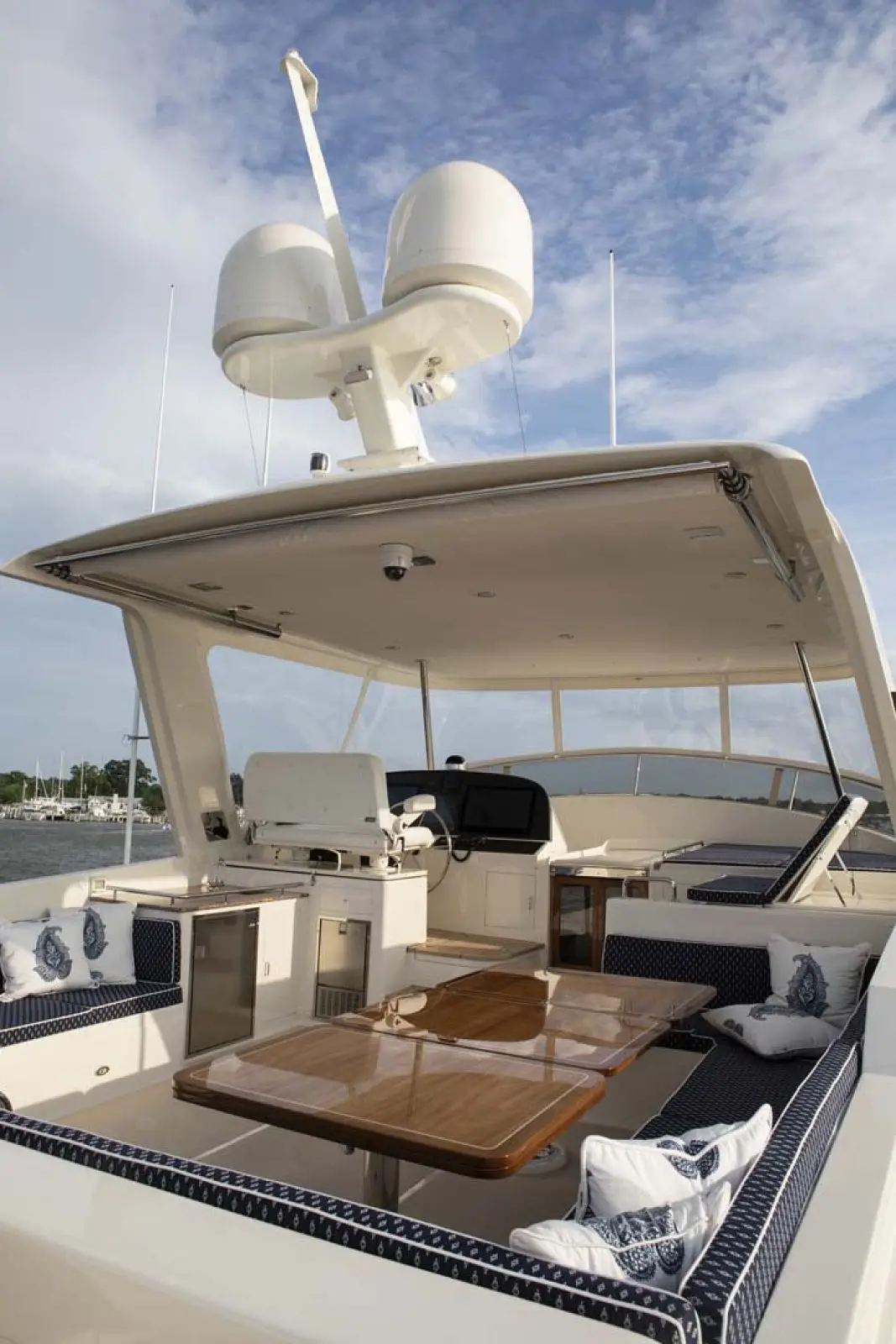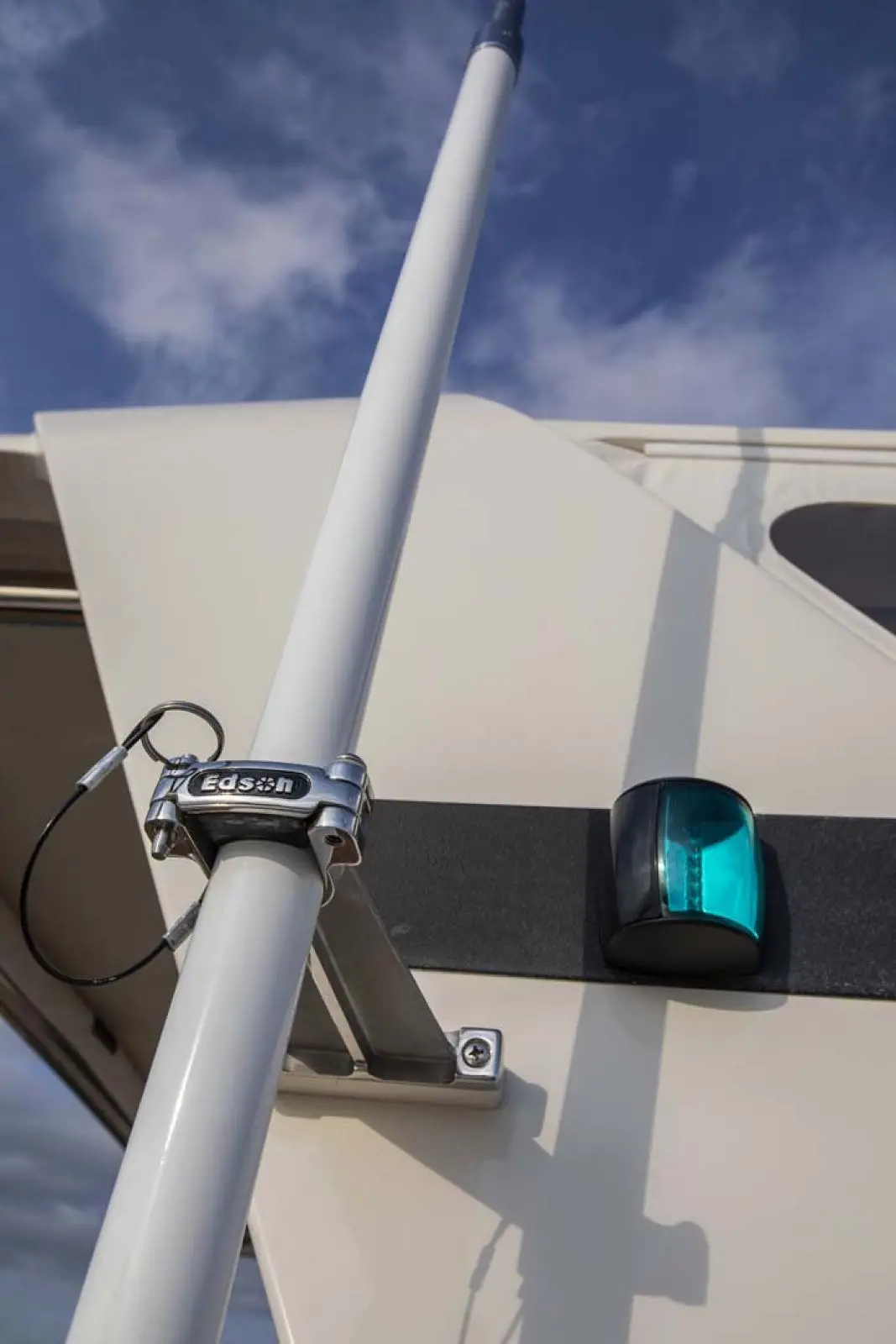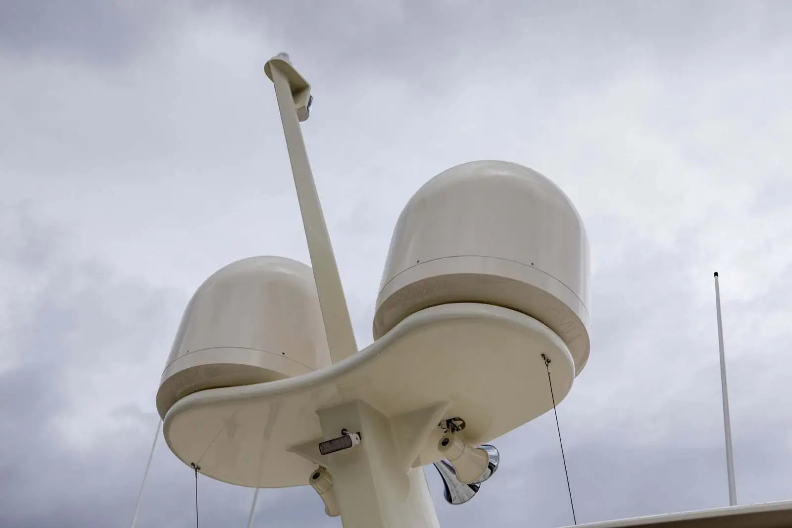 Available as options are hardtops for the upper bridge and for covering the seating area on the lower level. Also available as options are a second control station at the aft end of the boat deck and, separately, an airfoil-section yacht mast for mounting on top of the arch.