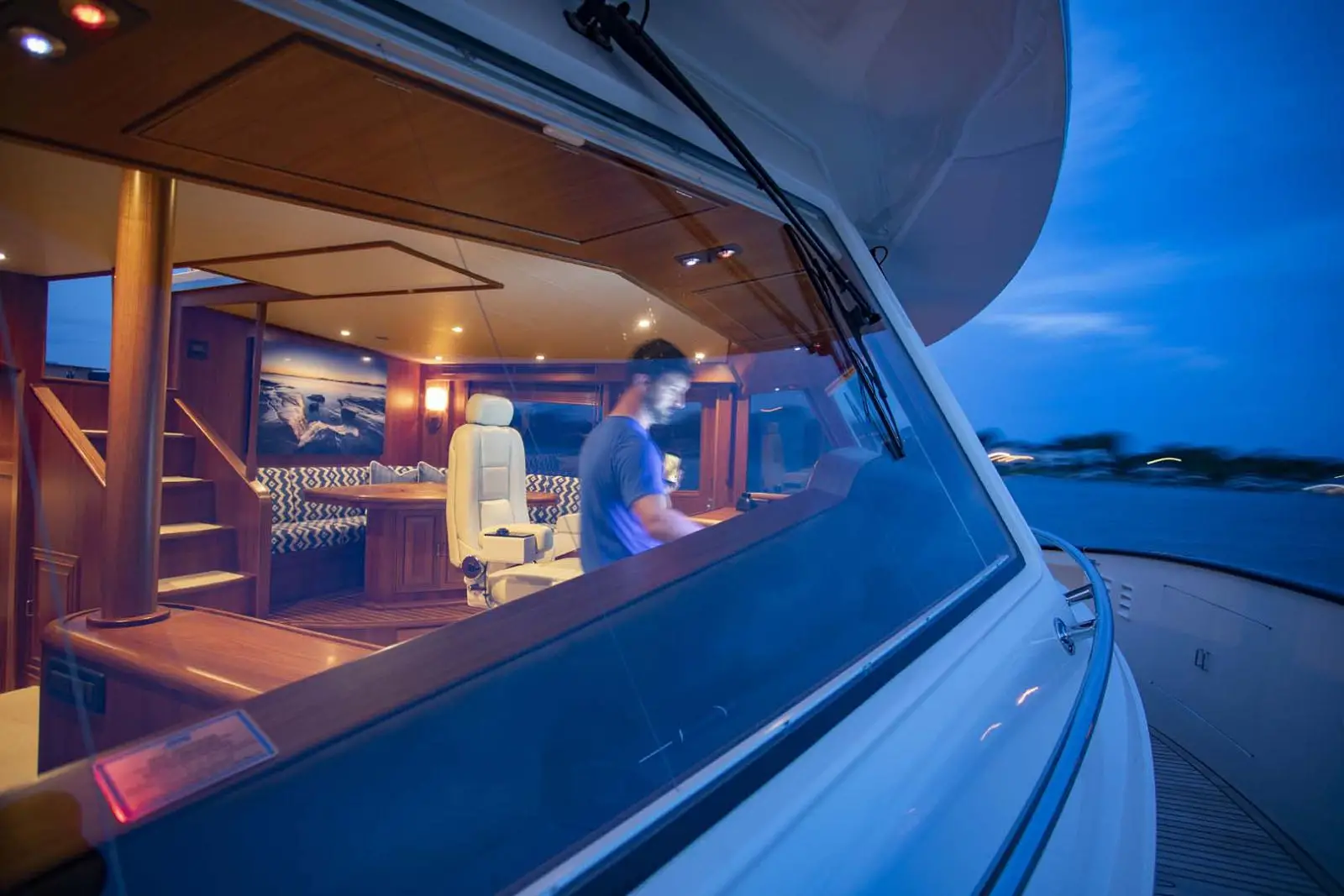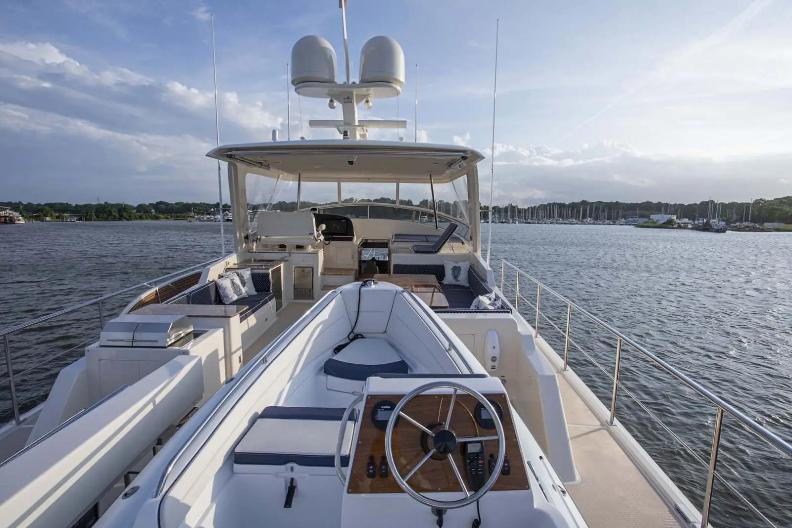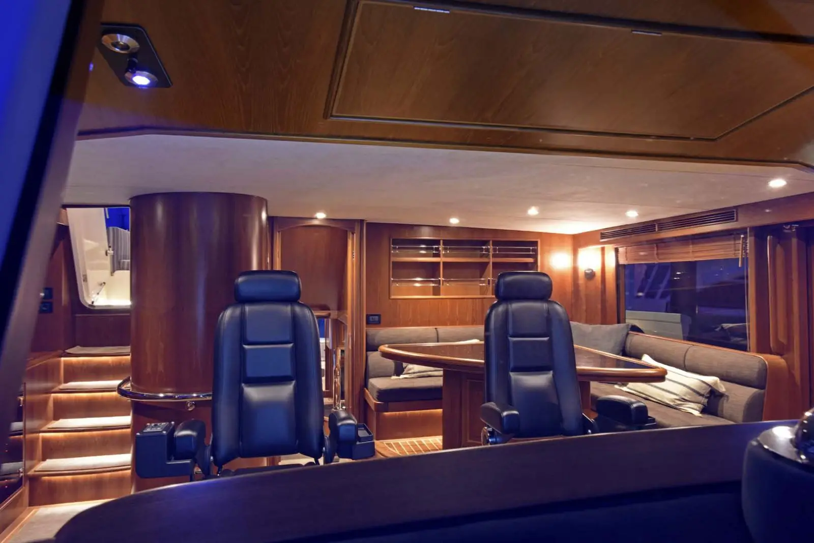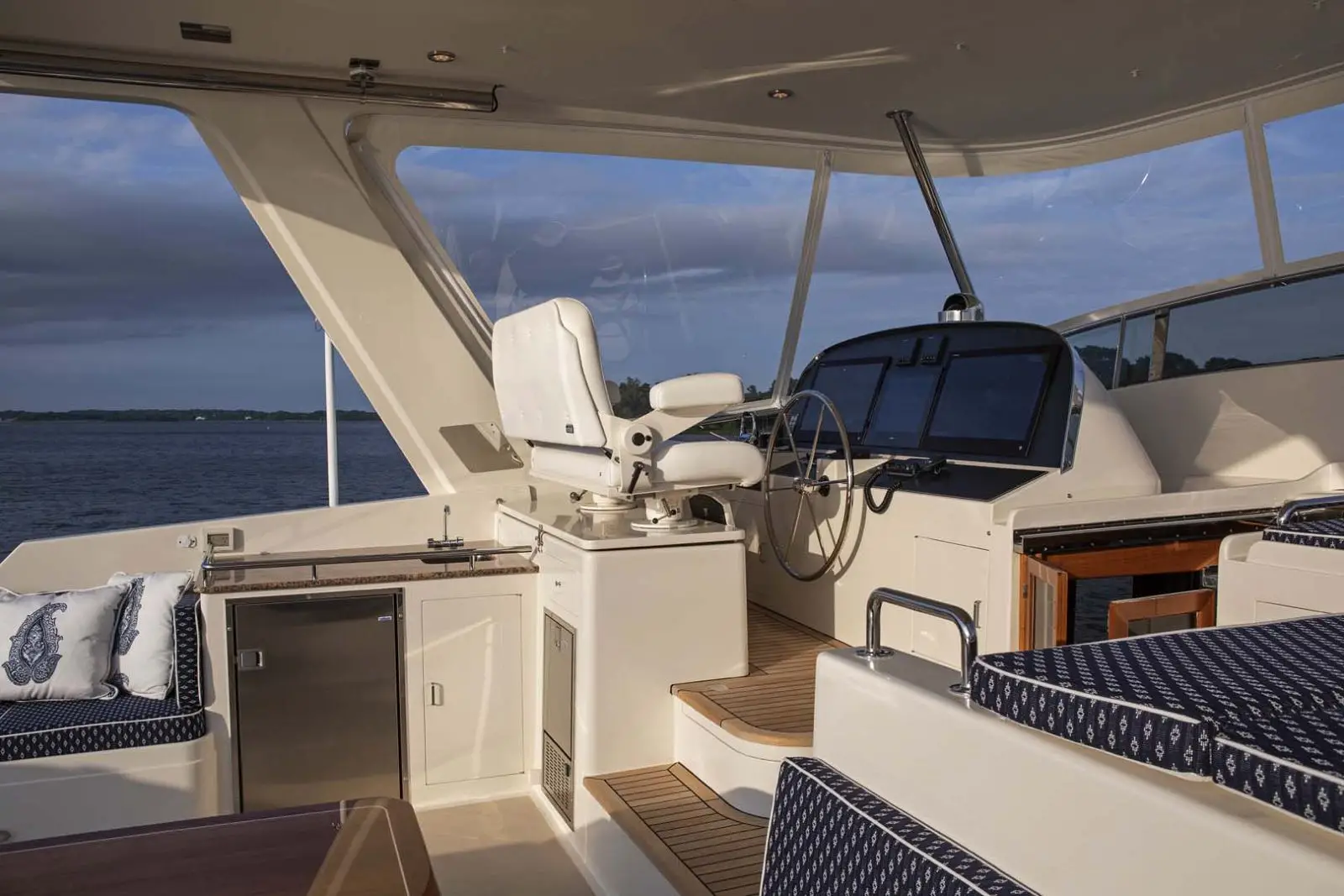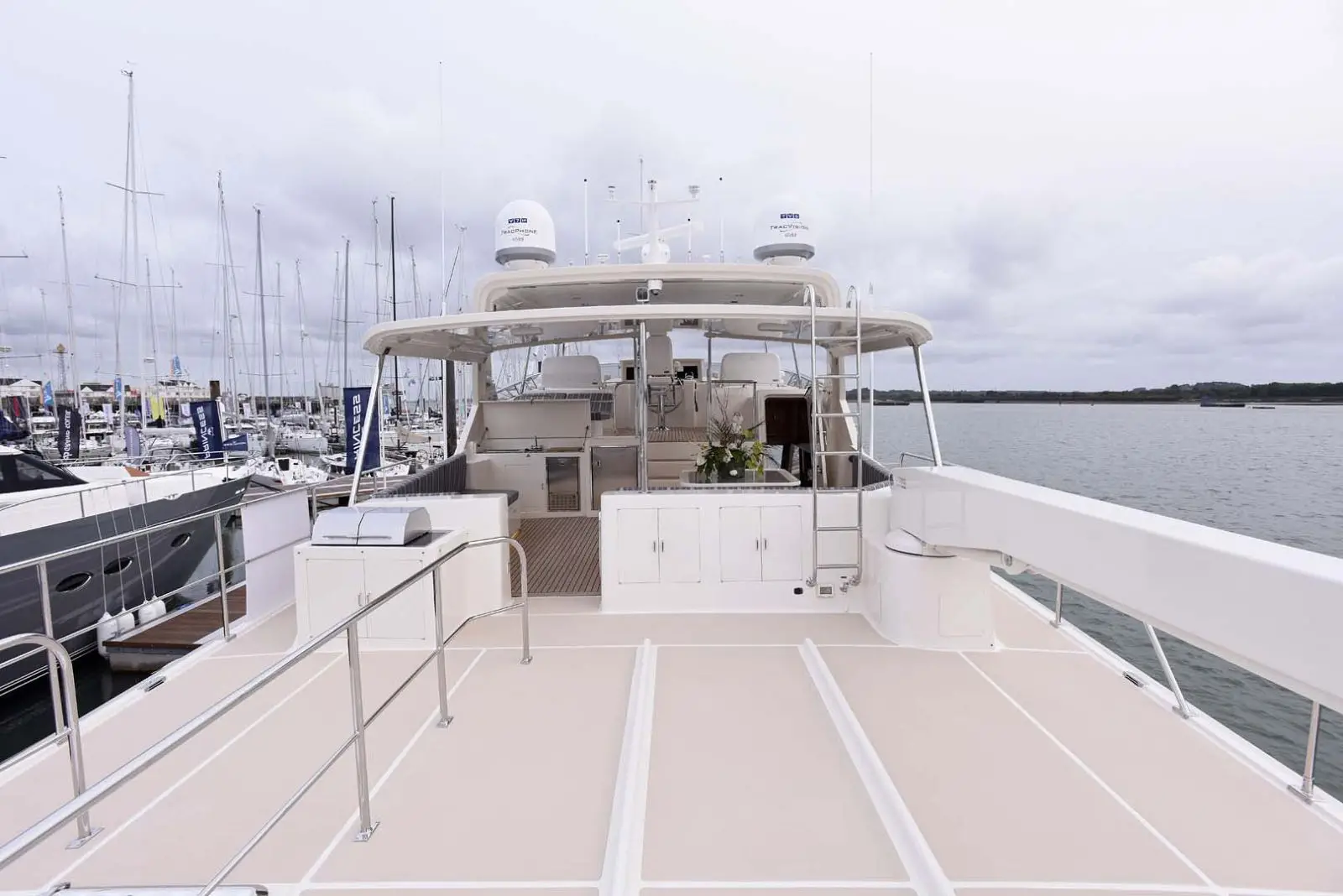 Available as options are hardtops for the upper bridge and for covering the seating area on the lower level. Also available as options are a second control station at the aft end of the boat deck and, separately, an airfoil-section yacht mast for mounting on top of the arch.