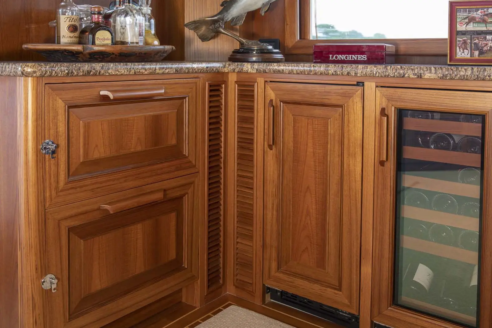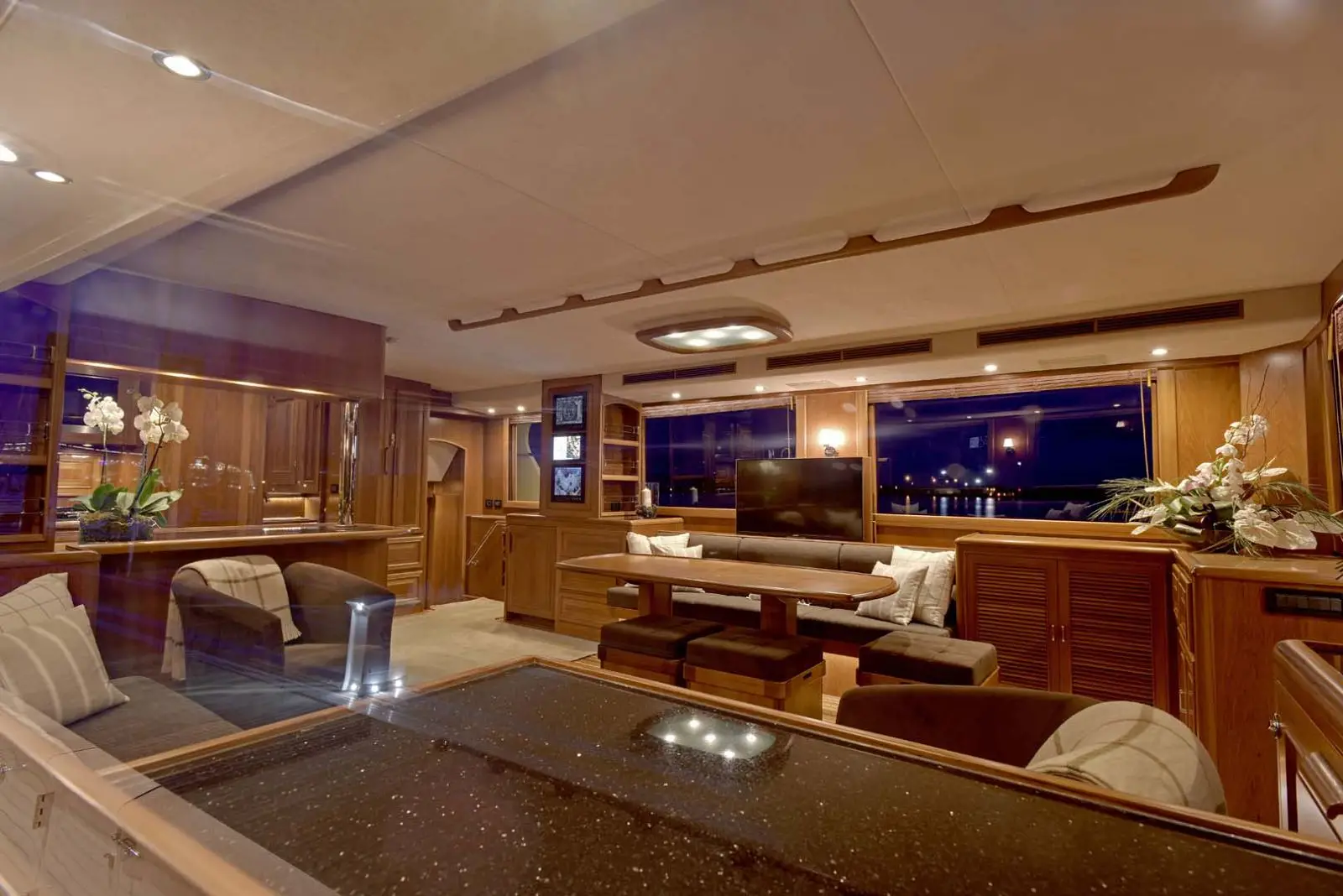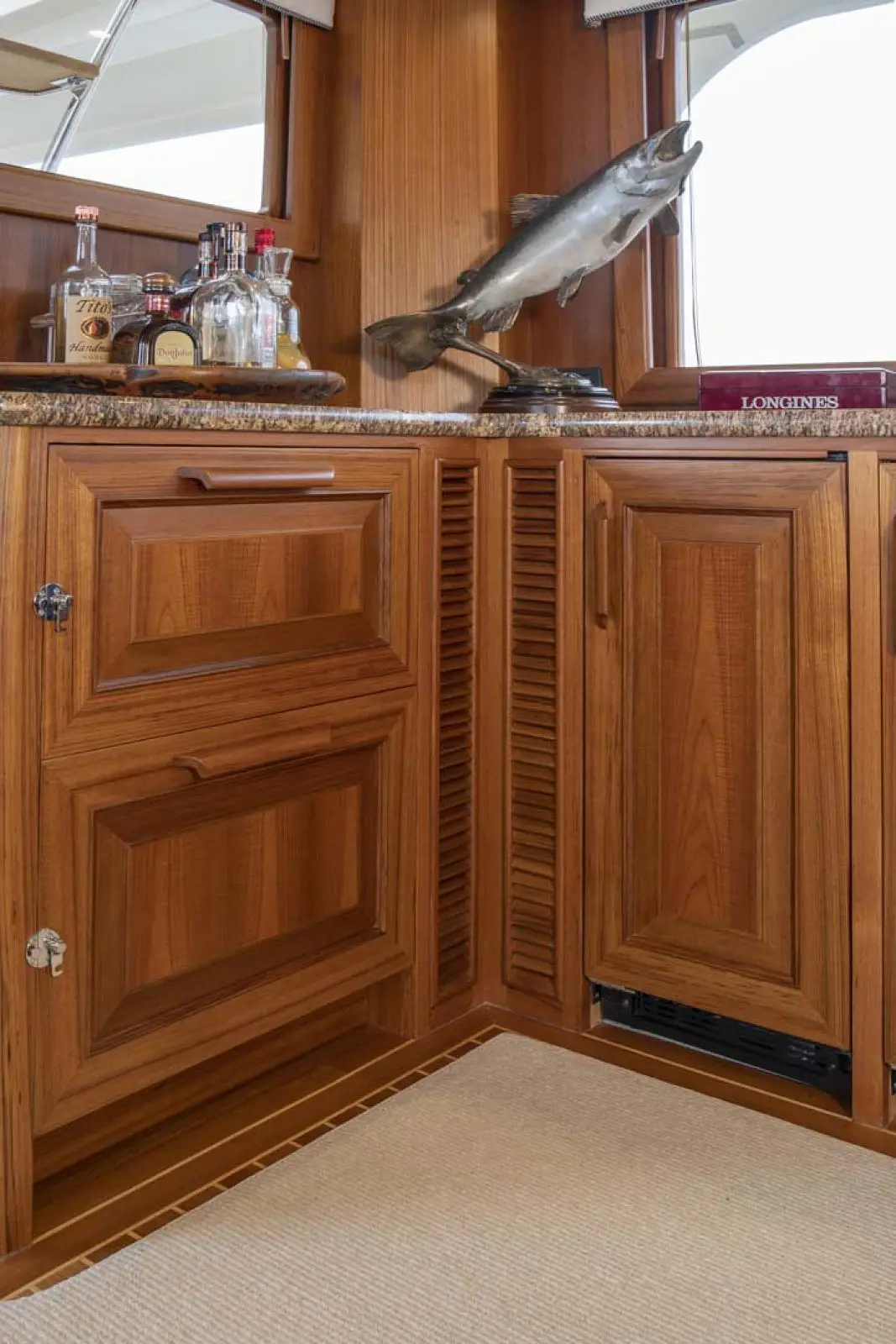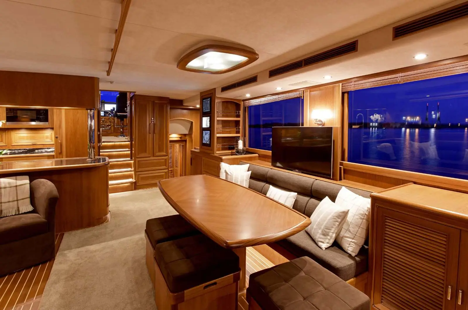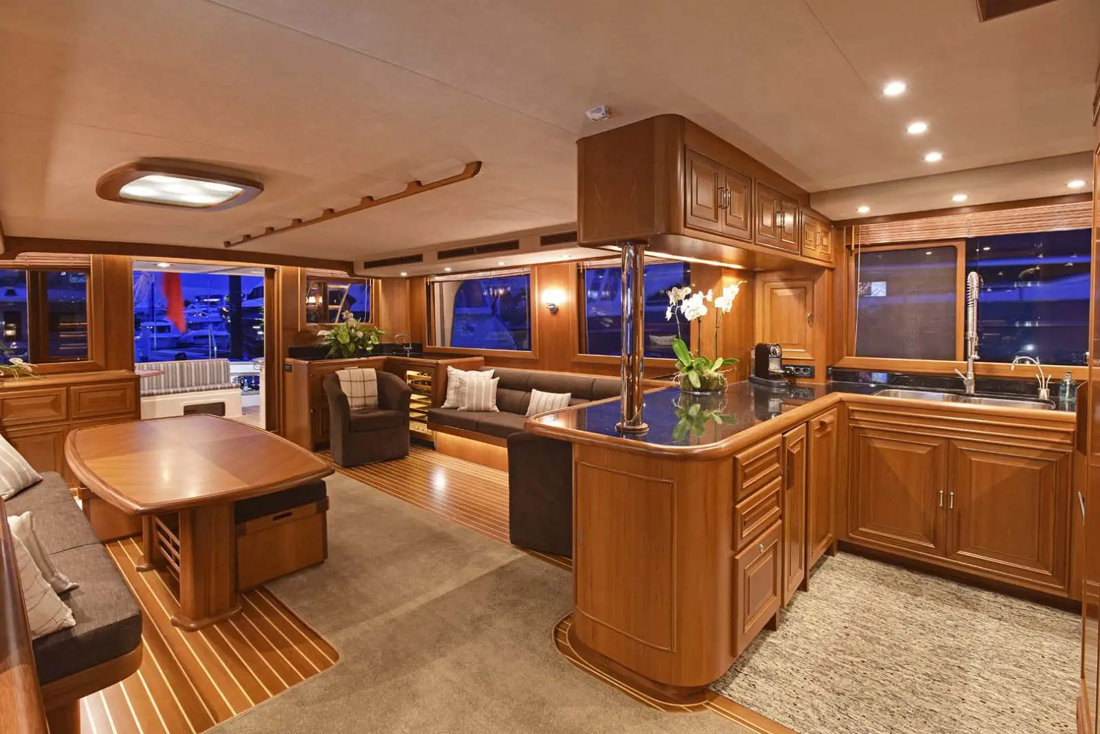 The salon can be customized to suit owners requirements. The standard salon layout includes an entertainment center with cabinets and bookshelves along the stbd side, and TV cabinet in the starboard aft corner with a powered TV Lift. To port is an L-settee with Fleming oval teak coffee table with storage locker. Aft to port is a bar cabinet with granite counter top, sink, combo fridge/icemaker, and bottle storage.