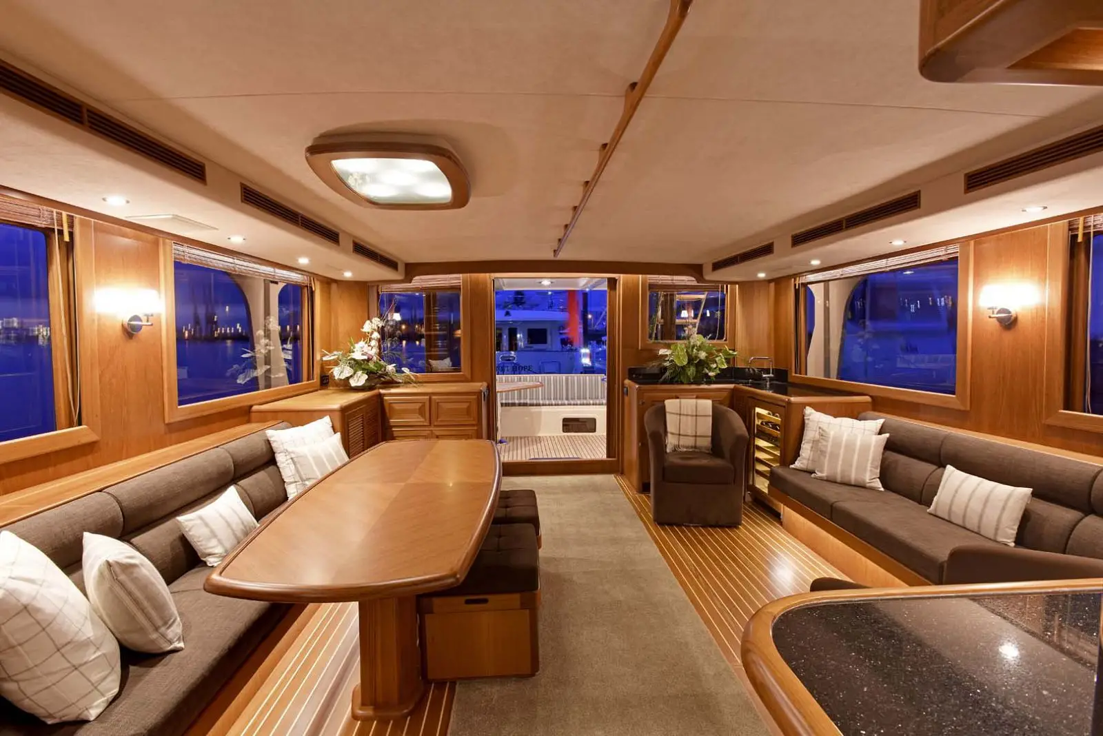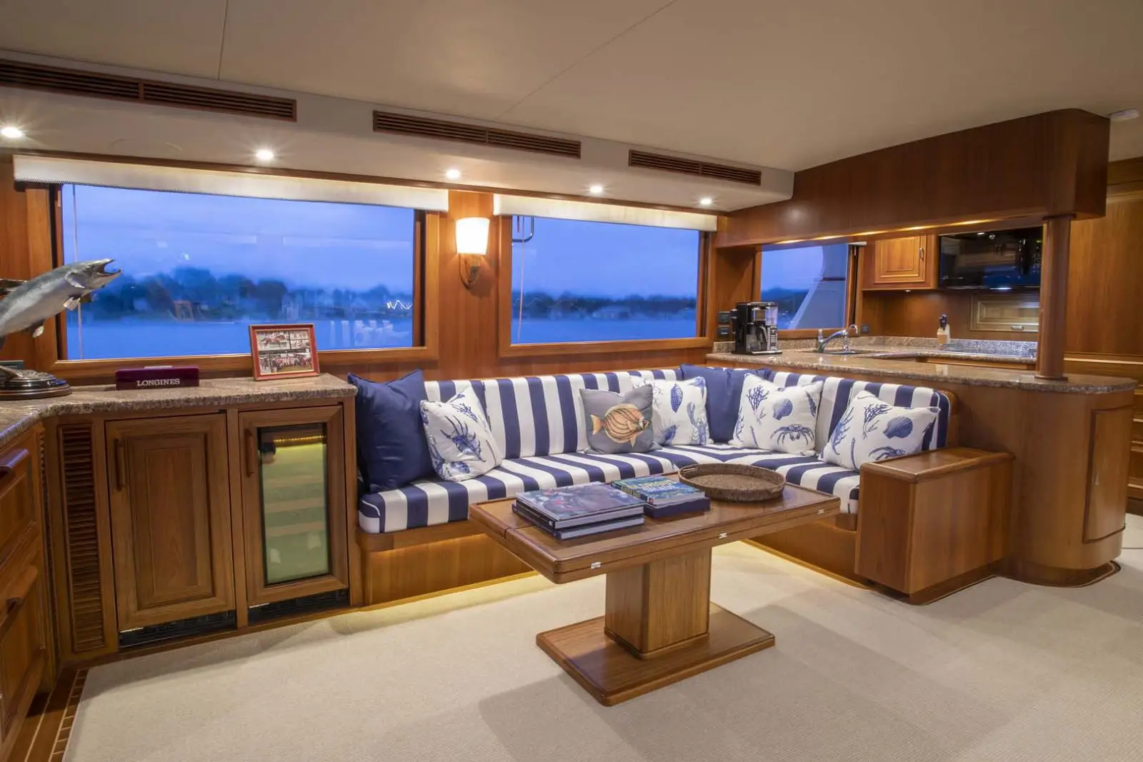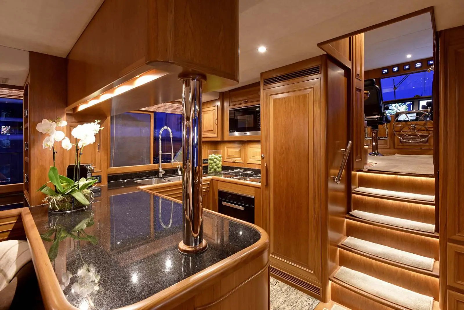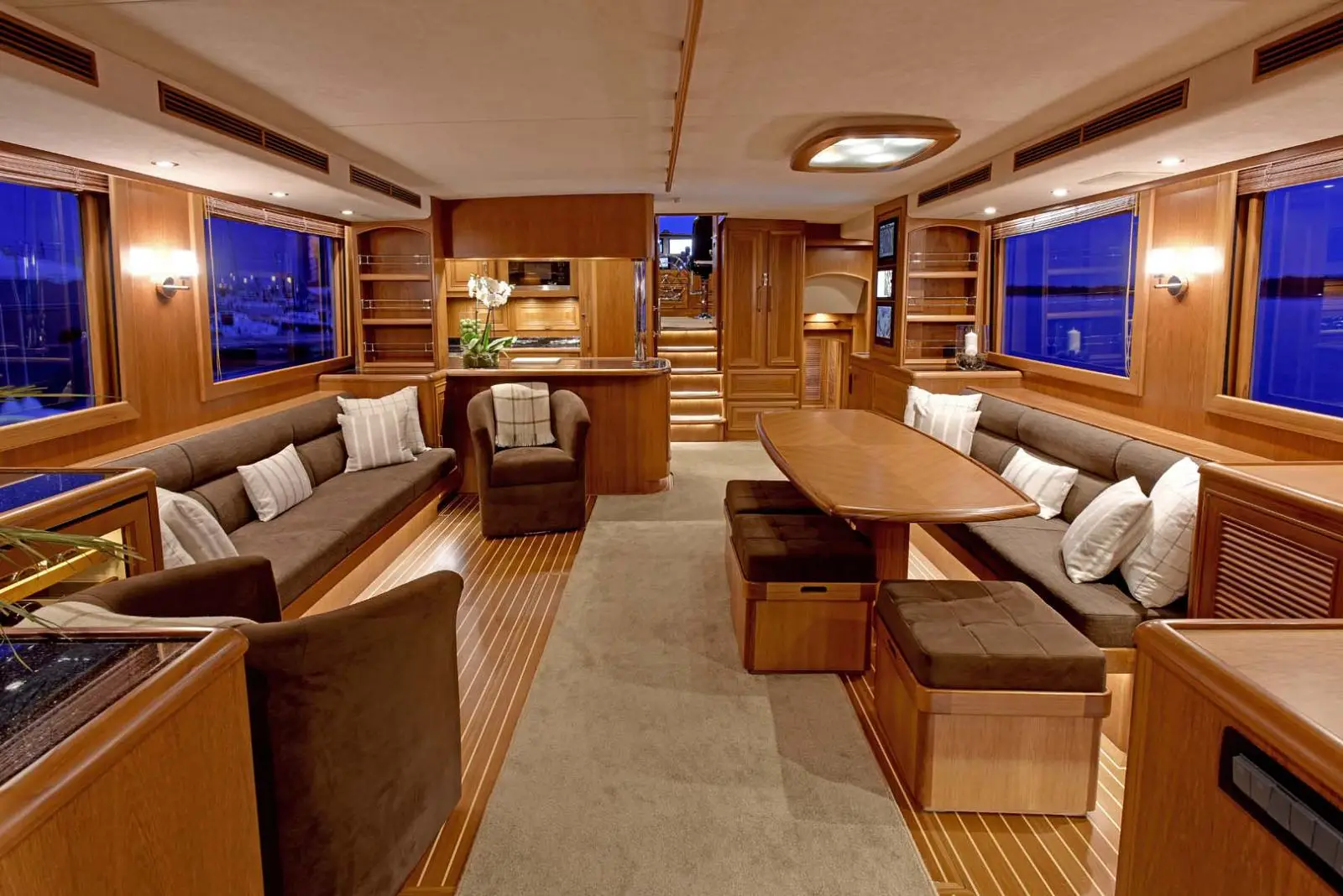 The salon can be customized to suit owners requirements. The standard salon layout includes an entertainment center with cabinets and bookshelves along the stbd side, and TV cabinet in the starboard aft corner with a powered TV Lift. To port is an L-settee with Fleming oval teak coffee table with storage locker. Aft to port is a bar cabinet with granite counter top, sink, combo fridge/icemaker, and bottle storage.