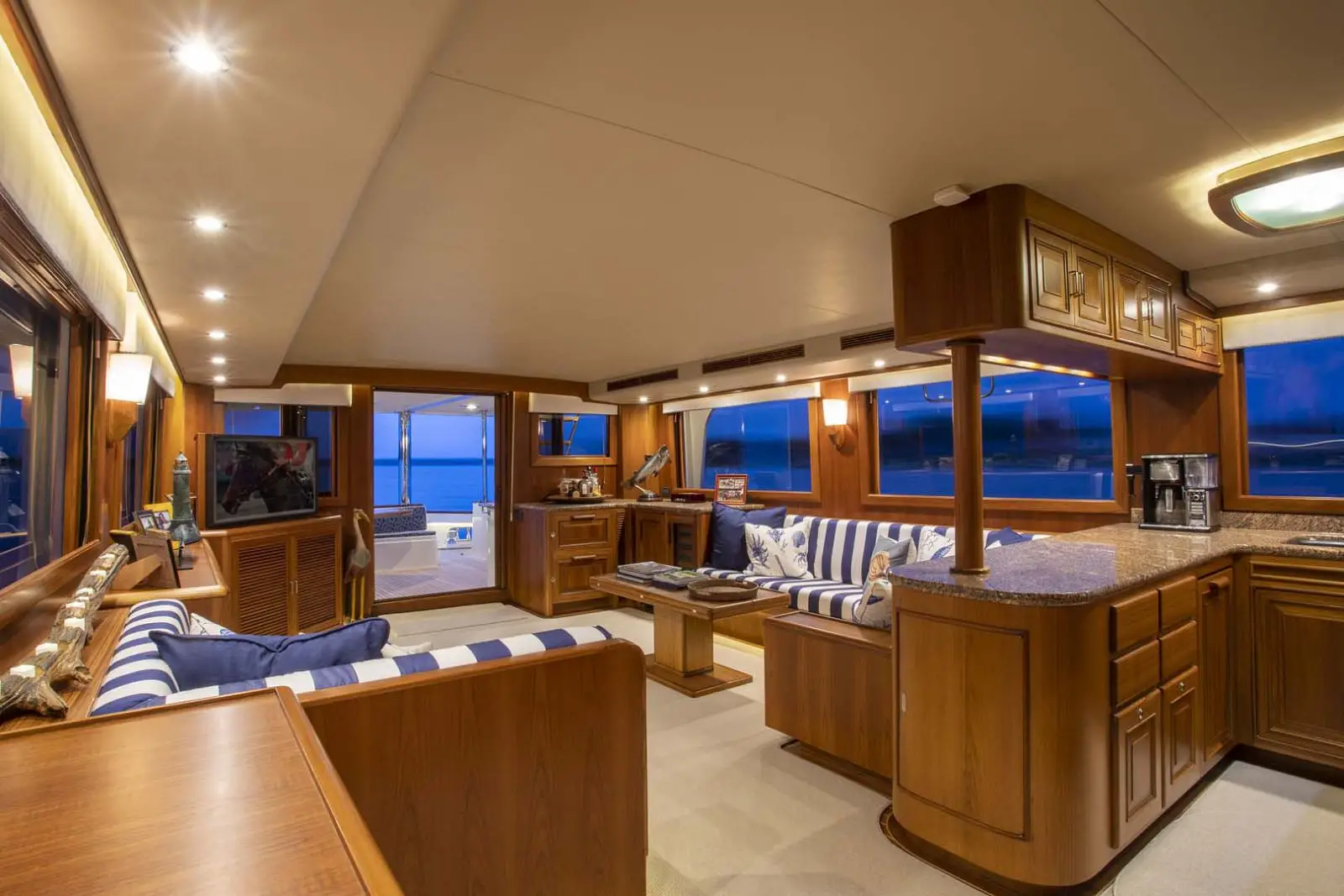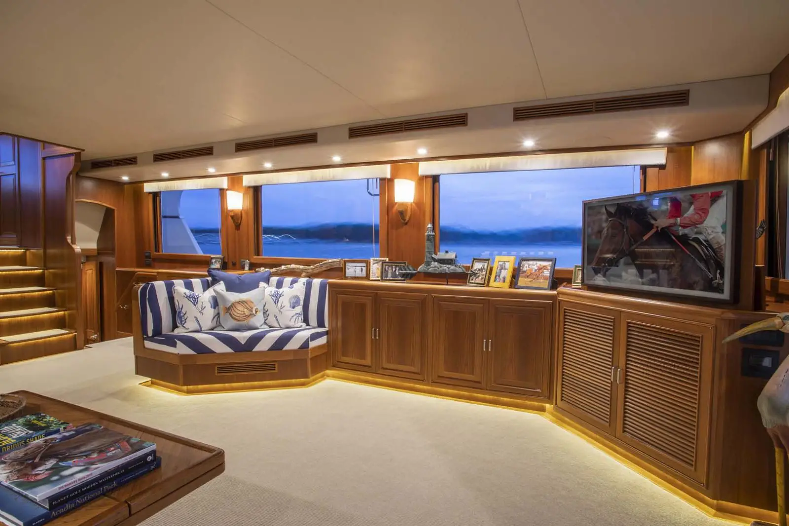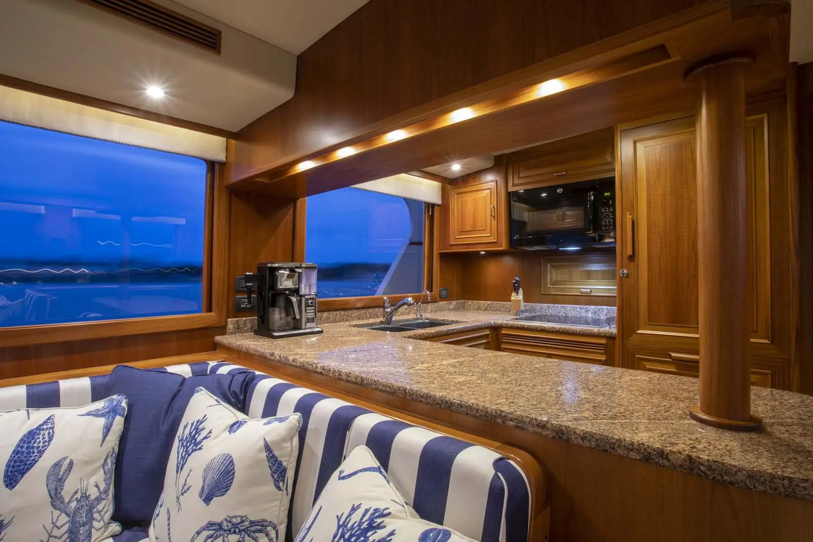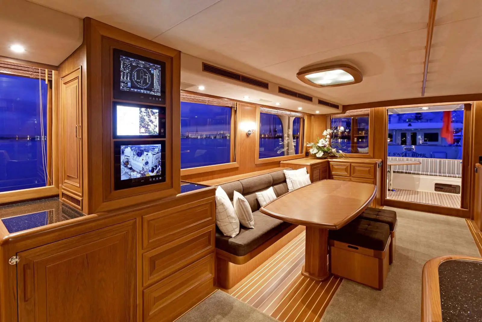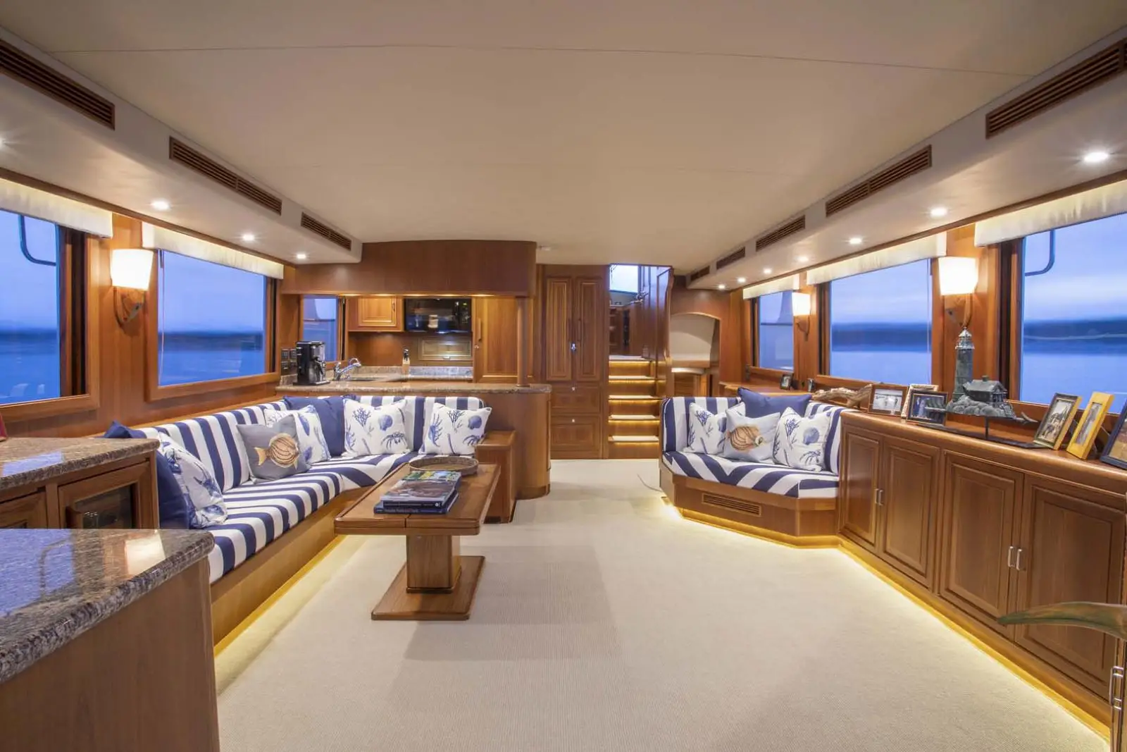 The salon can be customized to suit owners requirements. The standard salon layout includes an entertainment center with cabinets and bookshelves along the stbd side, and TV cabinet in the starboard aft corner with a powered TV Lift. To port is an L-settee with Fleming oval teak coffee table with storage locker. Aft to port is a bar cabinet with granite counter top, sink, combo fridge/icemaker, and bottle storage.