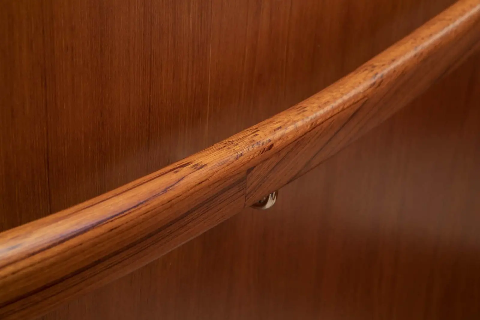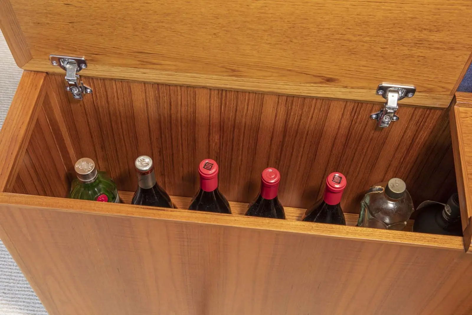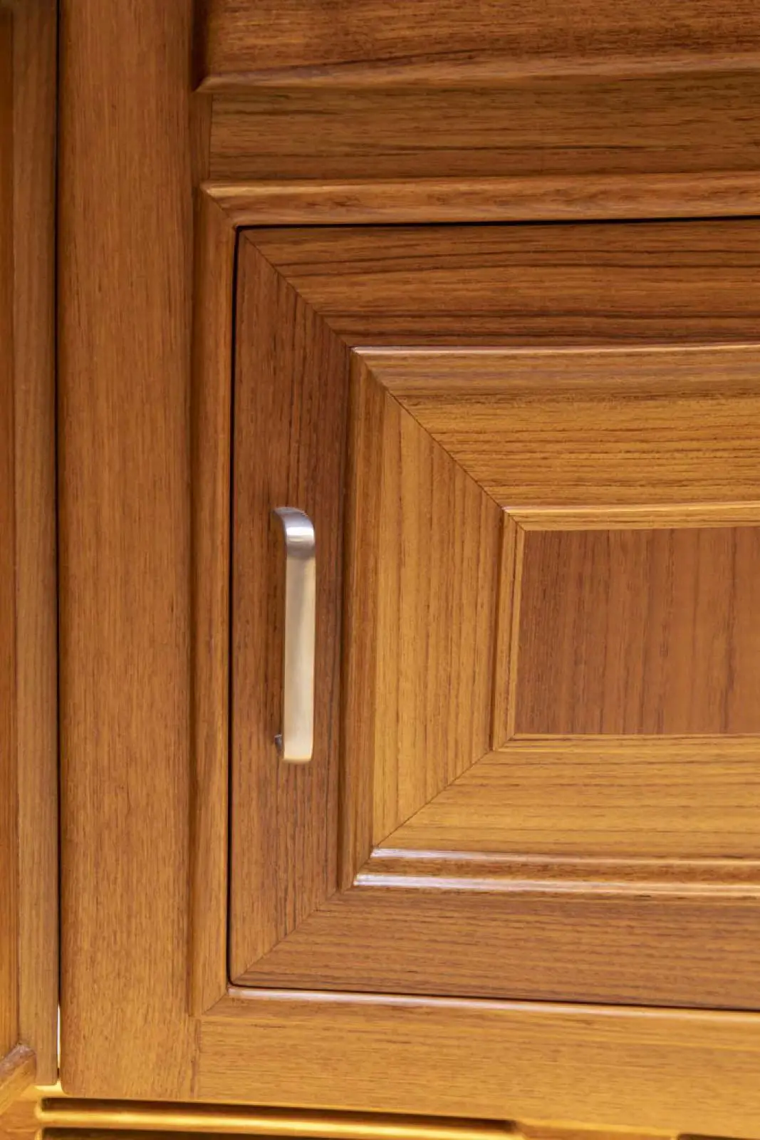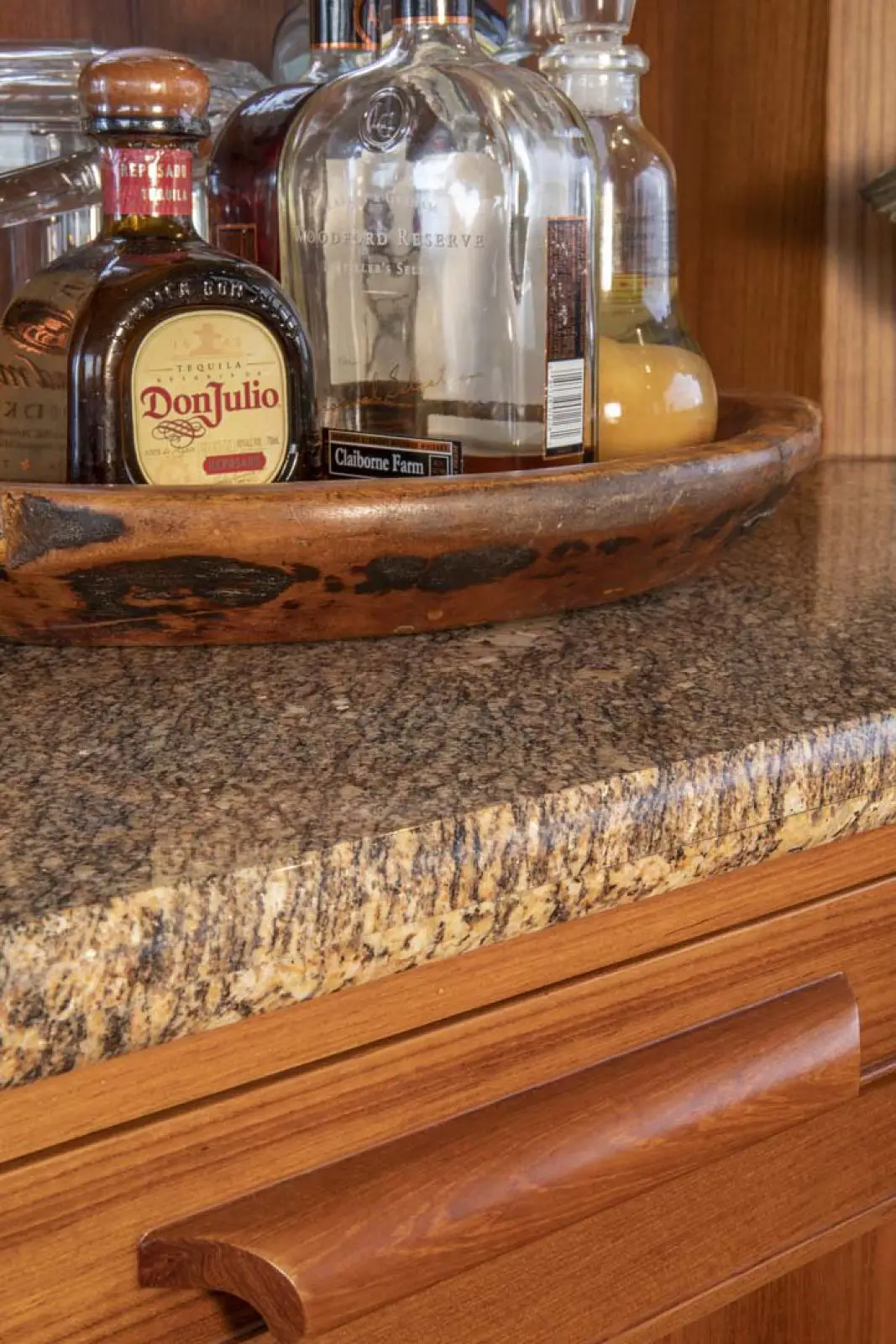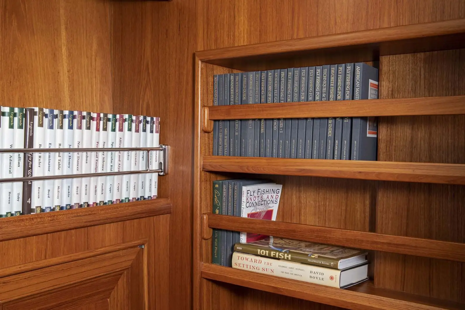 The salon can be customized to suit owners requirements. The standard salon layout includes an entertainment center with cabinets and bookshelves along the stbd side, and TV cabinet in the starboard aft corner with a powered TV Lift. To port is an L-settee with Fleming oval teak coffee table with storage locker. Aft to port is a bar cabinet with granite counter top, sink, combo fridge/icemaker, and bottle storage.
