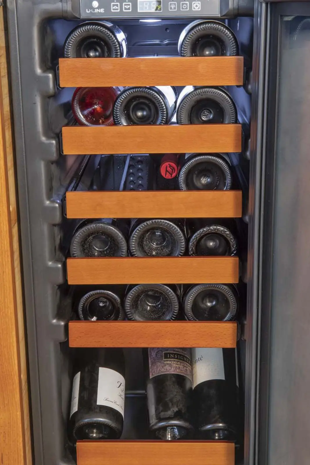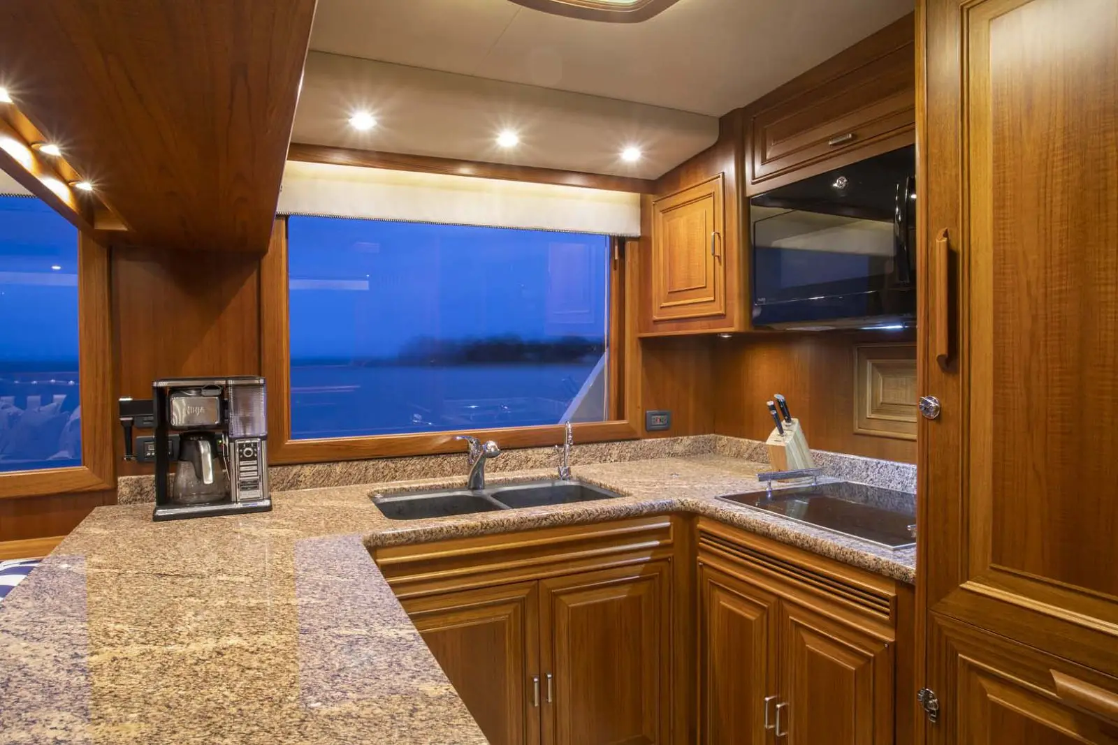 The galley features an 18-foot linear length of granite counter with an undermount stainless steel double sink, overhead lockers, ample drawers and storage, pull-out pot locker forward of the cooktop and includes the following quality appliances, Sub Zero fridge with freezer drawers, Miele oven, Miele  dishwasher, convection microwave, waste disposer, Miele induction cooktop with custom stainless steel potholders, Instahot for dispensing filtered hot and cold water, swivel faucet with pull-out nozzle.