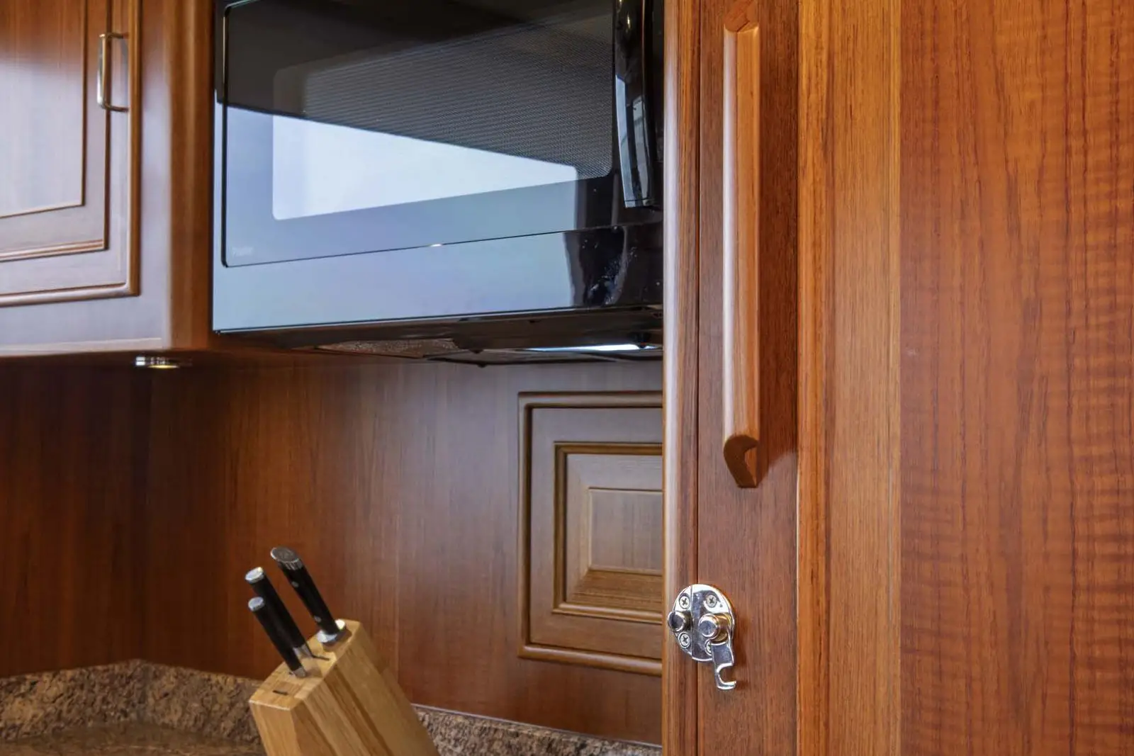 Opposite the galley the dinette area comes standard with a curved banquette, oval dining table, storage cabinets with glass doors at the forward bulkhead with a granite top. Designer LED lighting is installed over the table and has a dimmer control.