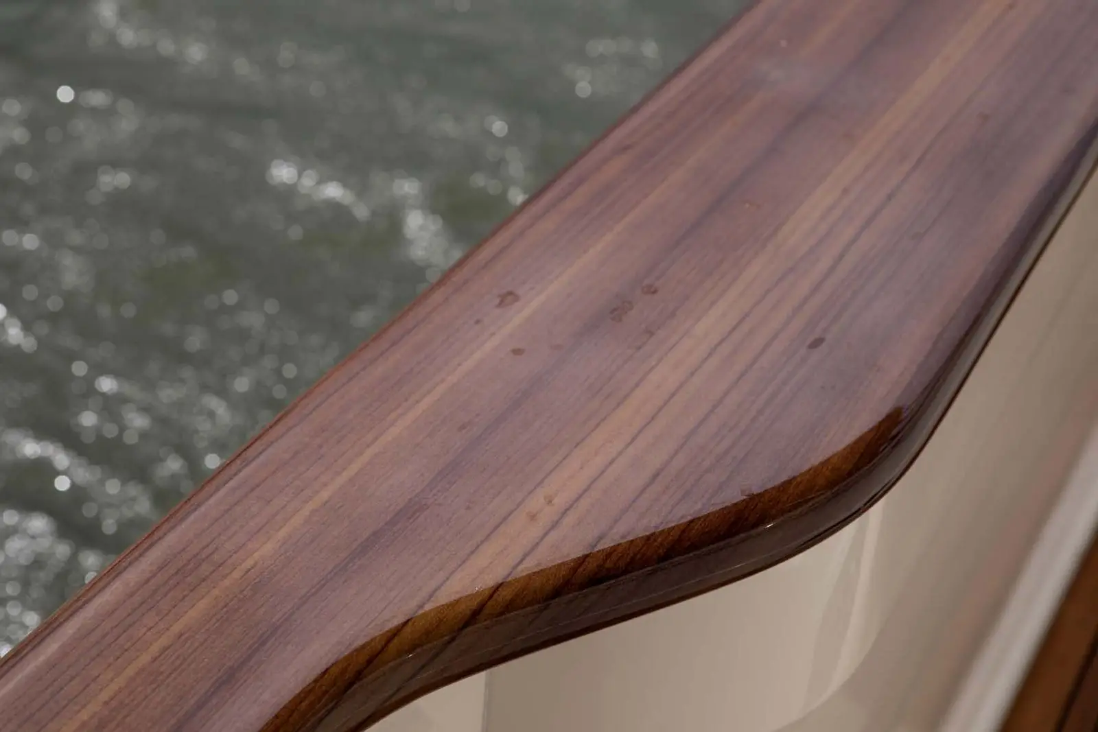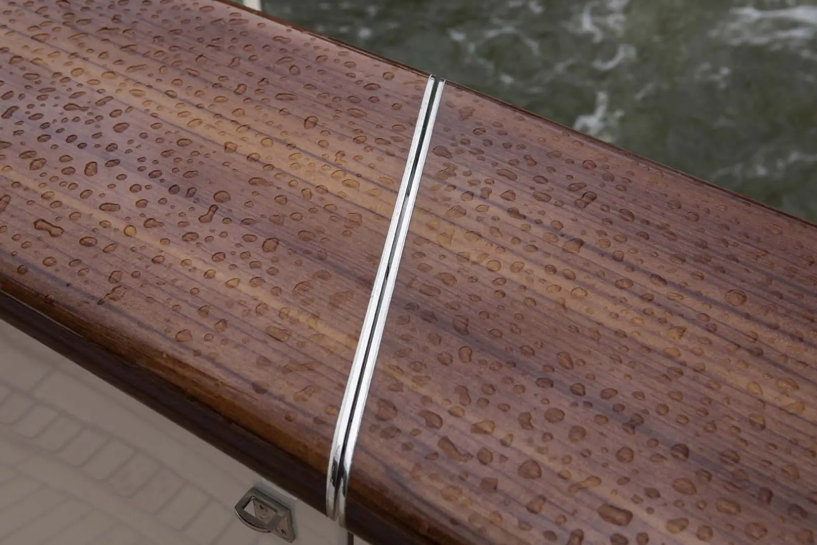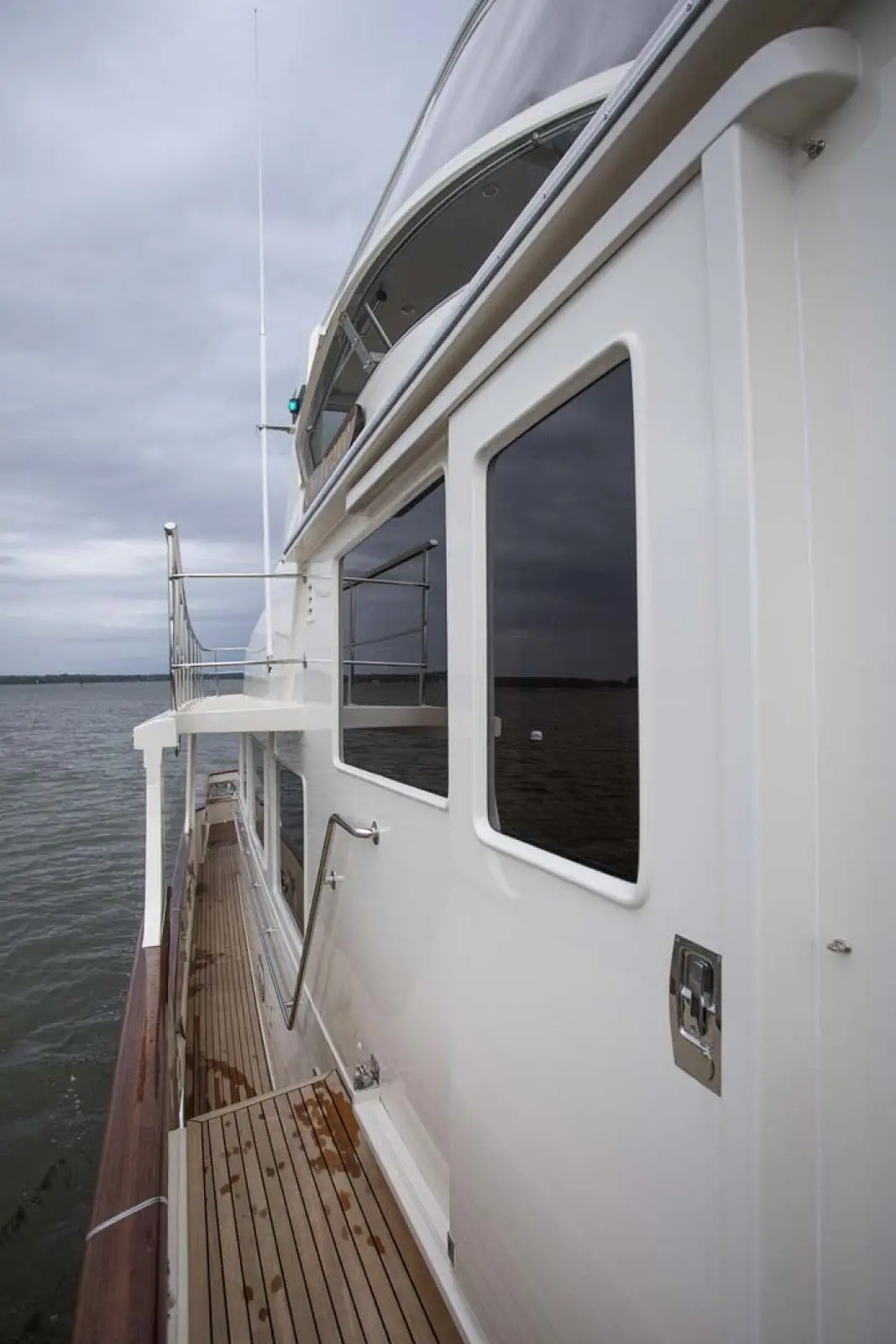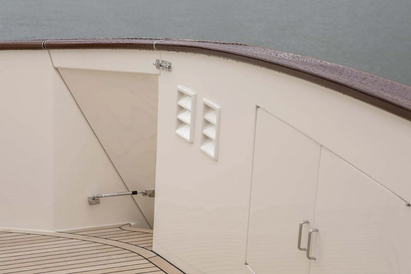 The Portuguese bridge deck provides protection for the pilothouse in the unlikely event that green water should come aboard. Solid doors, assisted by gas springs, give access to the forward deck to port and starboard. Lockers within the Portuguese bridge provide storage for fenders and lines. A handrail runs around the front and sides of the pilothouse with sliding doors on either side. Forward-facing windows have 10mm thick tempered glass. Wipers are heavy duty with an integral wash system. Teak laid decks are standard aft of the Portuguese Bridge.