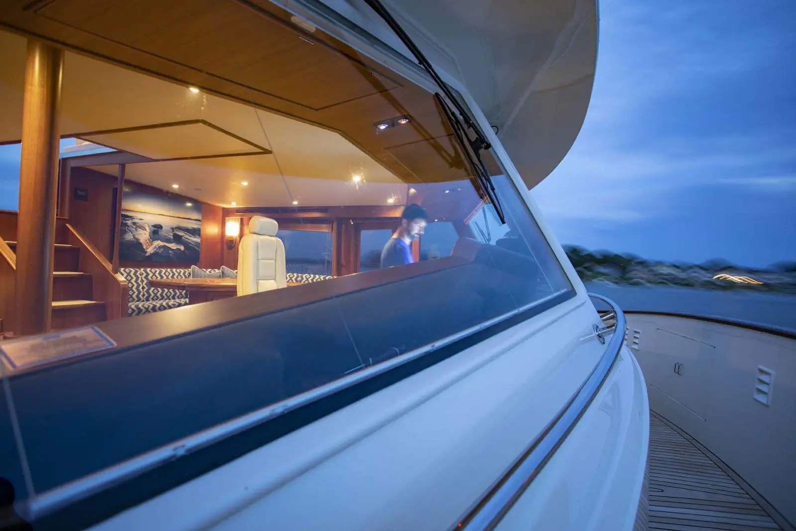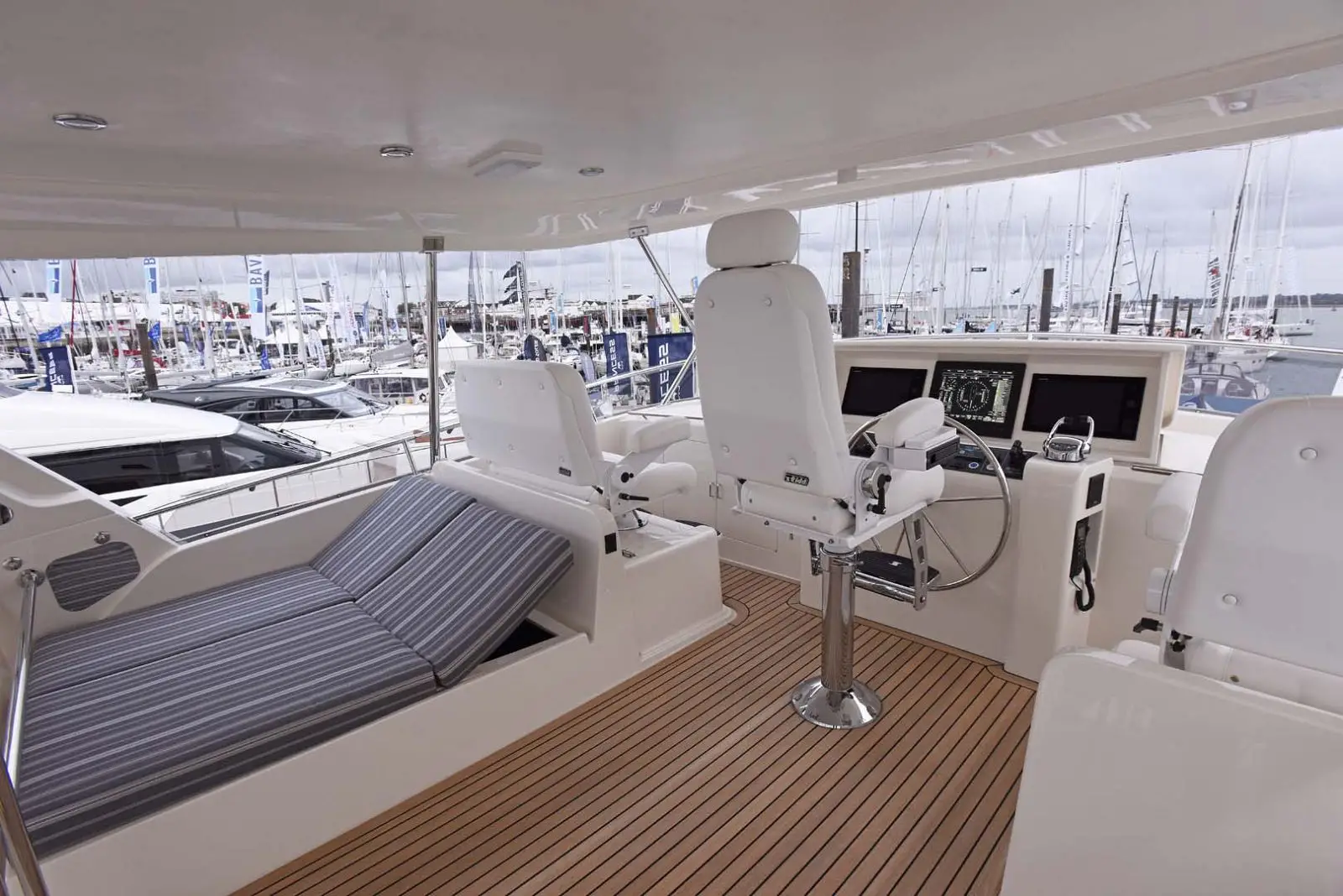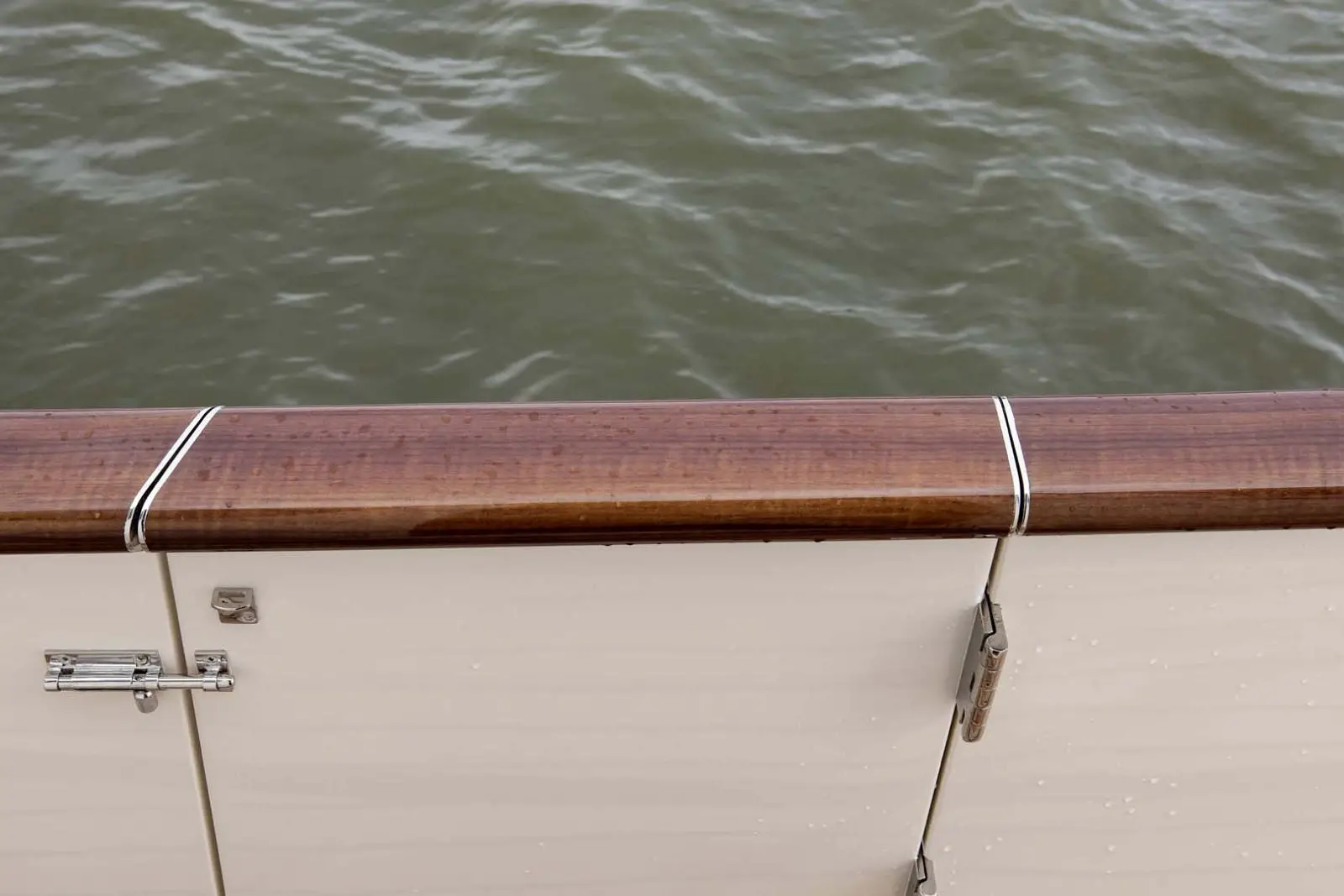 The Portuguese bridge deck provides protection for the pilothouse in the unlikely event that green water should come aboard. Solid doors, assisted by gas springs, give access to the forward deck to port and starboard. Lockers within the Portuguese bridge provide storage for fenders and lines. A handrail runs around the front and sides of the pilothouse with sliding doors on either side. Forward-facing windows have 10mm thick tempered glass. Wipers are heavy duty with an integral wash system. Teak laid decks are standard aft of the Portuguese Bridge.