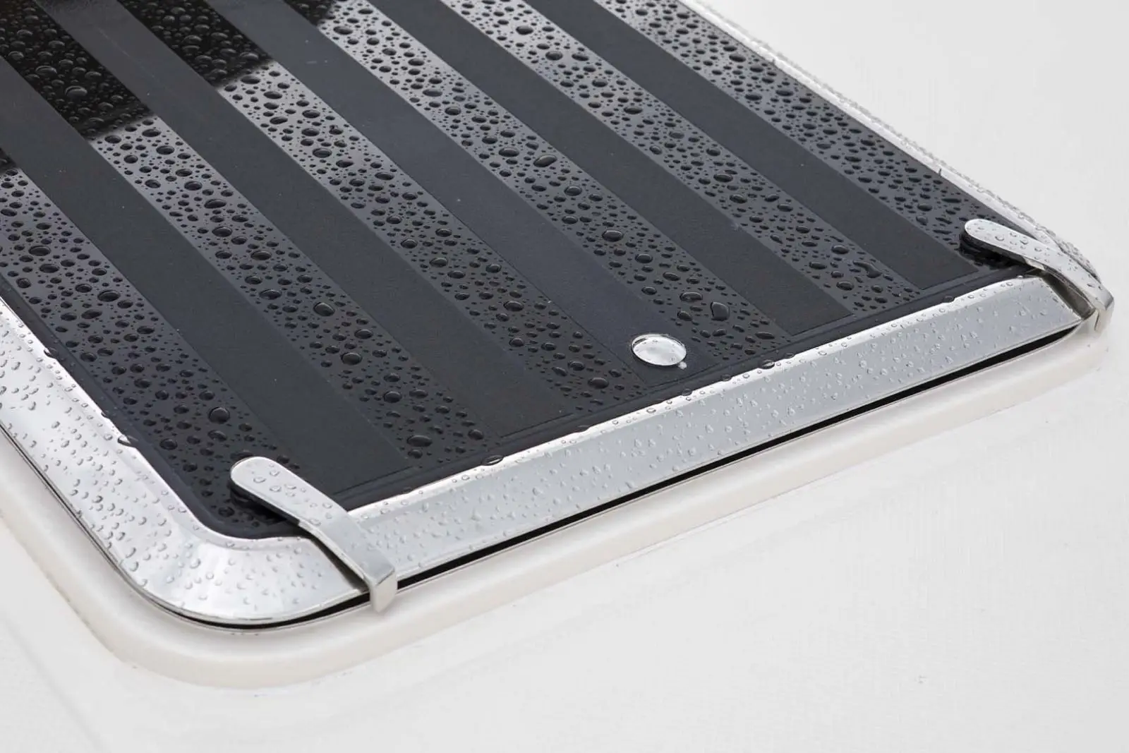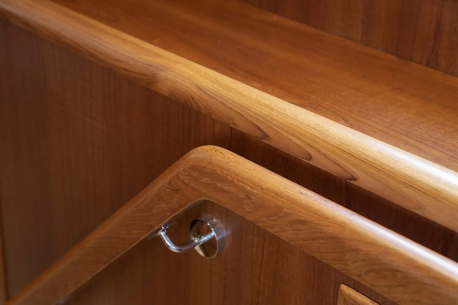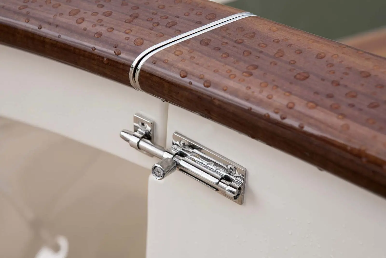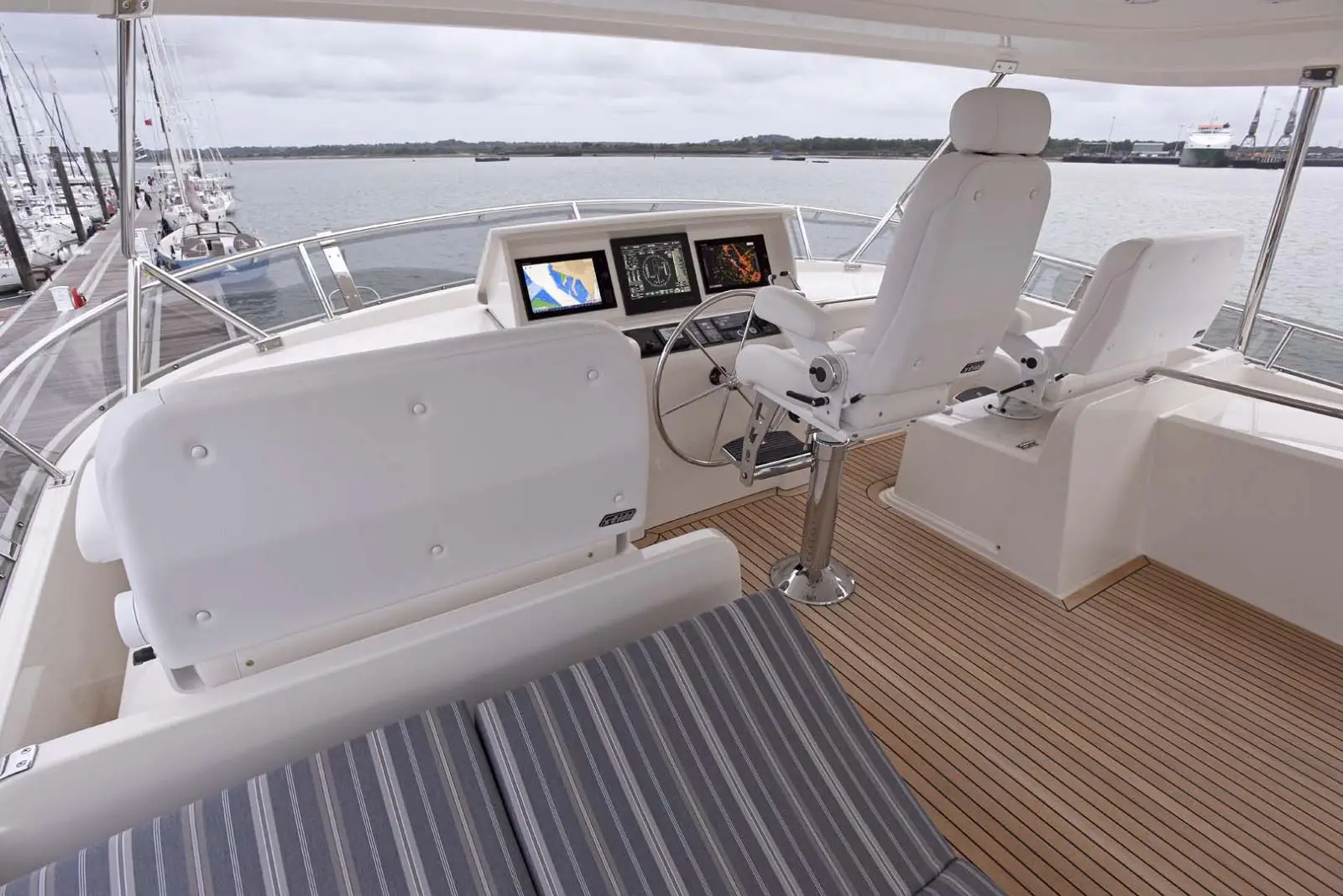The Portuguese bridge deck provides protection for the pilothouse in the unlikely event that green water should come aboard. Solid doors, assisted by gas springs, give access to the forward deck to port and starboard. Lockers within the Portuguese bridge provide storage for fenders and lines. A handrail runs around the front and sides of the pilothouse with sliding doors on either side. Forward-facing windows have 10mm thick tempered glass. Wipers are heavy duty with an integral wash system. Teak laid decks are standard aft of the Portuguese Bridge.