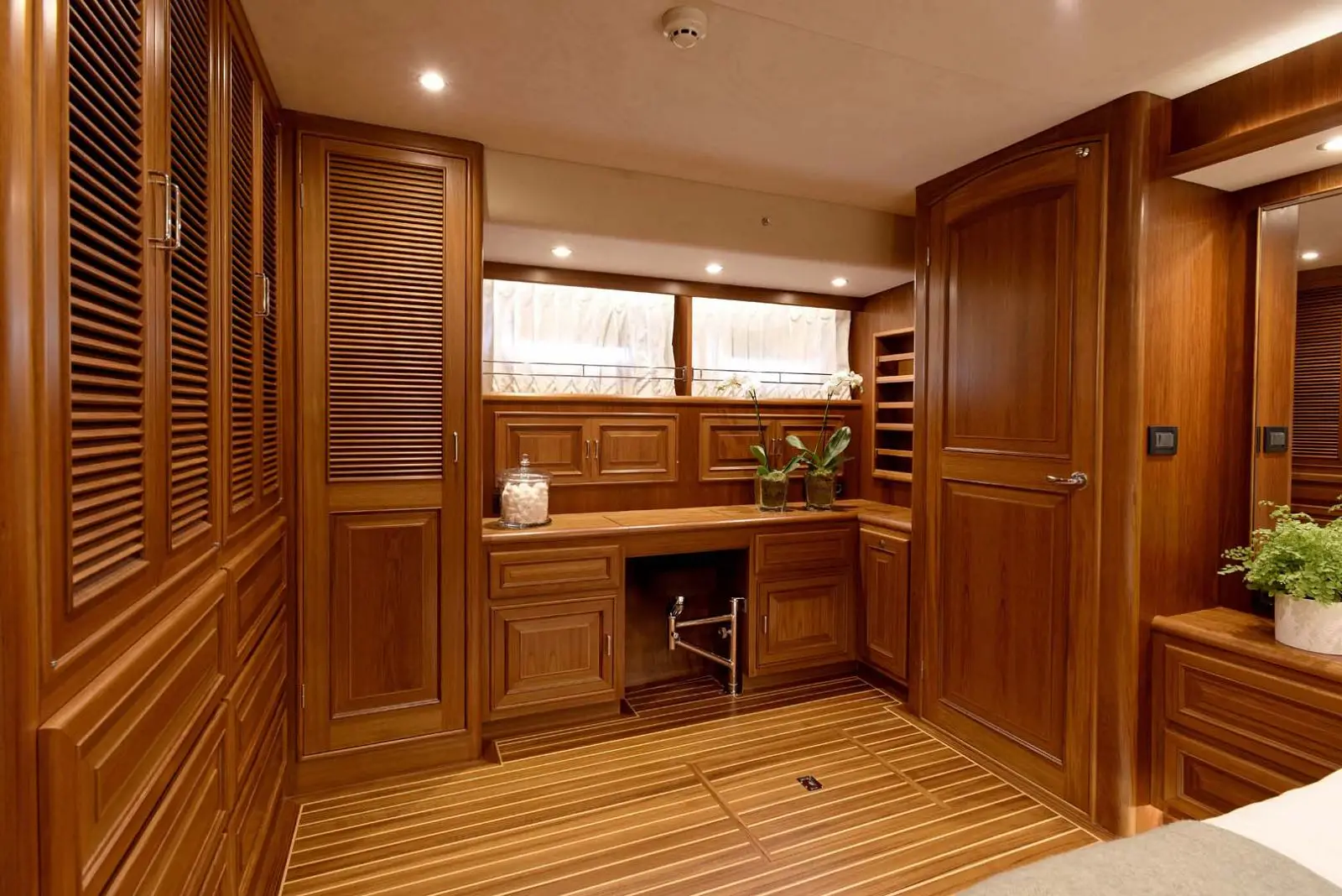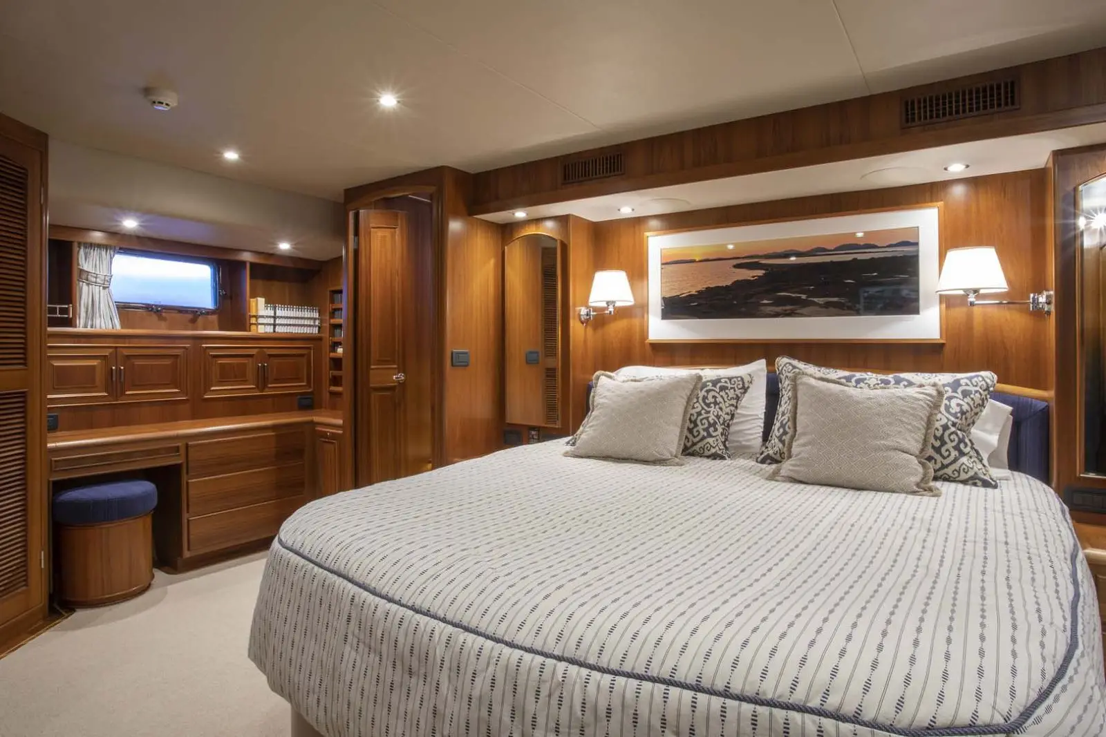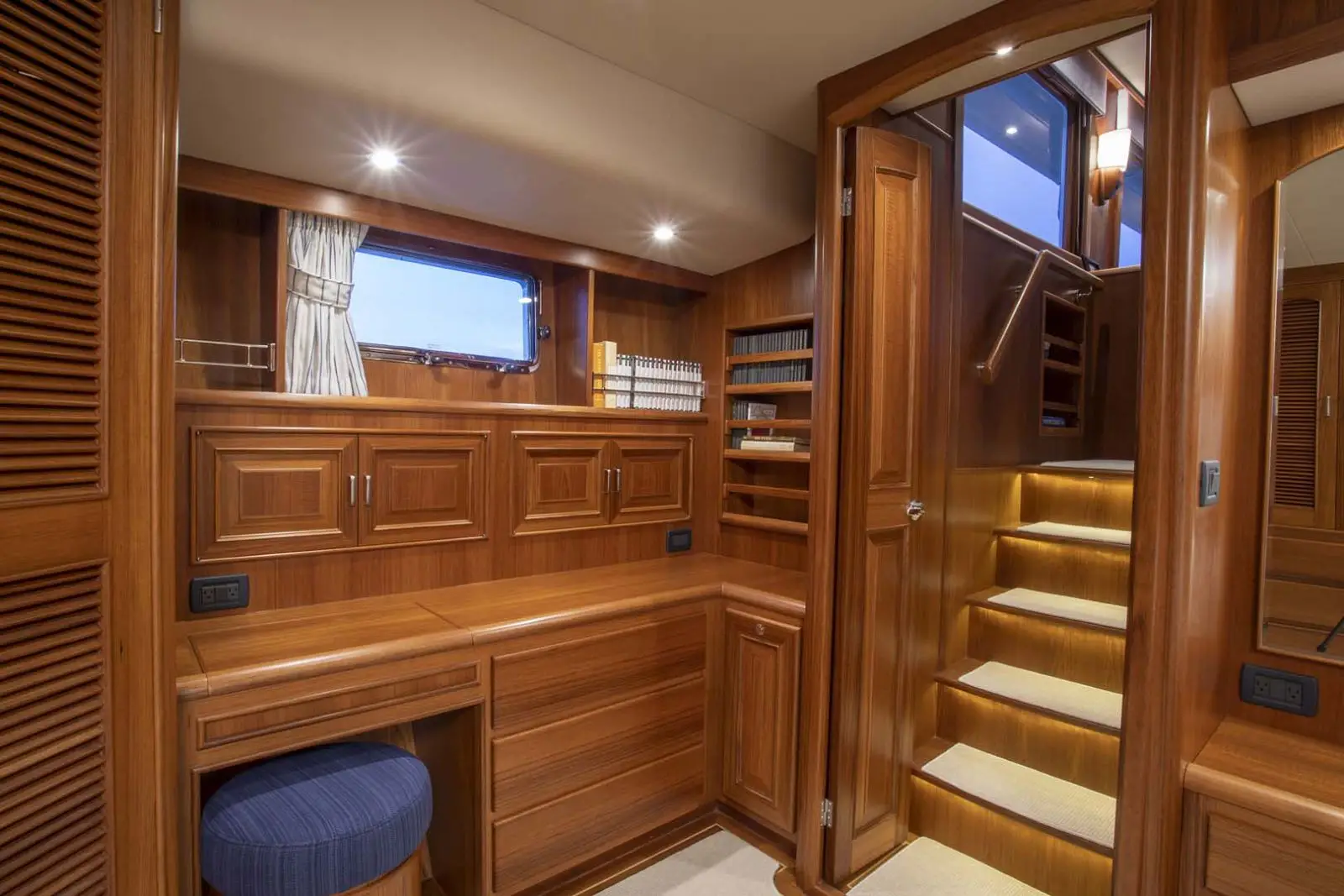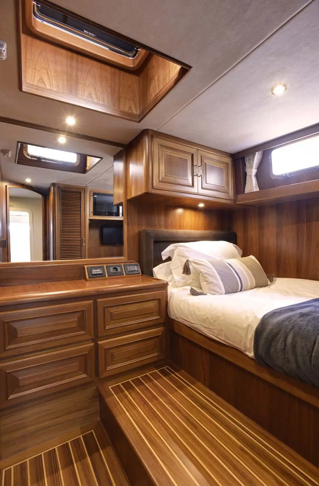 The owner's stateroom features a kingsize bed with mattress, which lifts hydraulically for easy access to a large storage area under it. A curved bureau with mirrors are on either side of the bed. Teak cove moldings along both sides of the stateroom and a curved soffit over the bed contain concealed lighting. There is a walk-in closet with louvered double doors and portlight, a desk with ample drawers and a space designated for a TV. Large stainless steel, CE-approved portlights are featured in the stateroom and head.