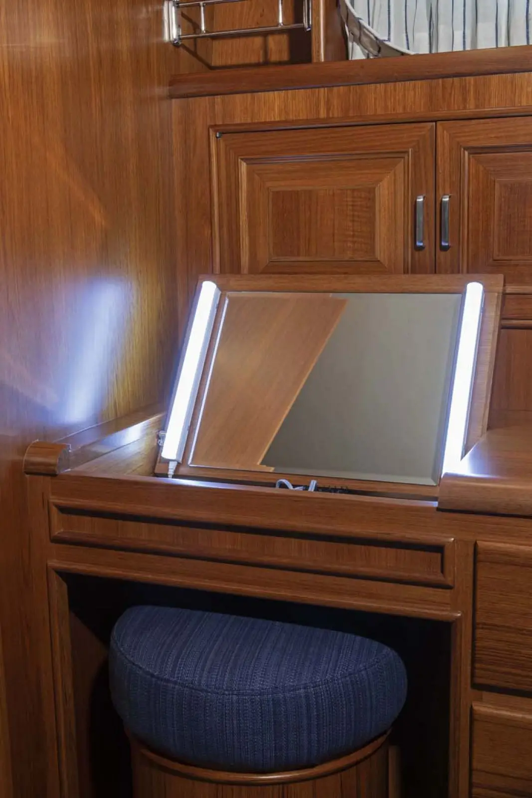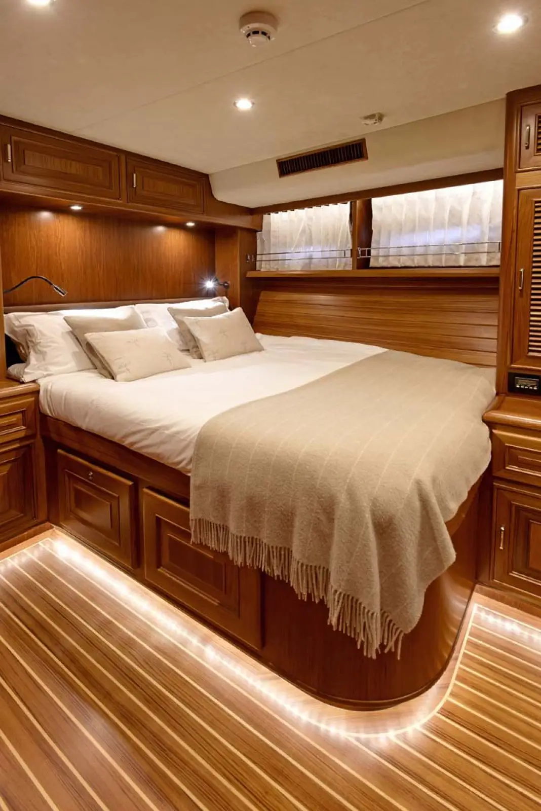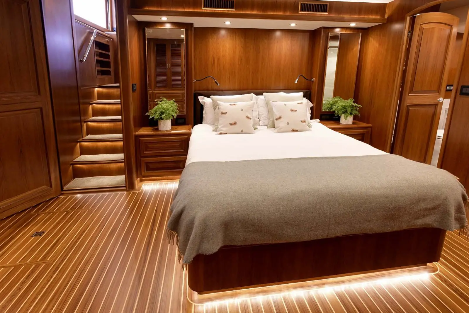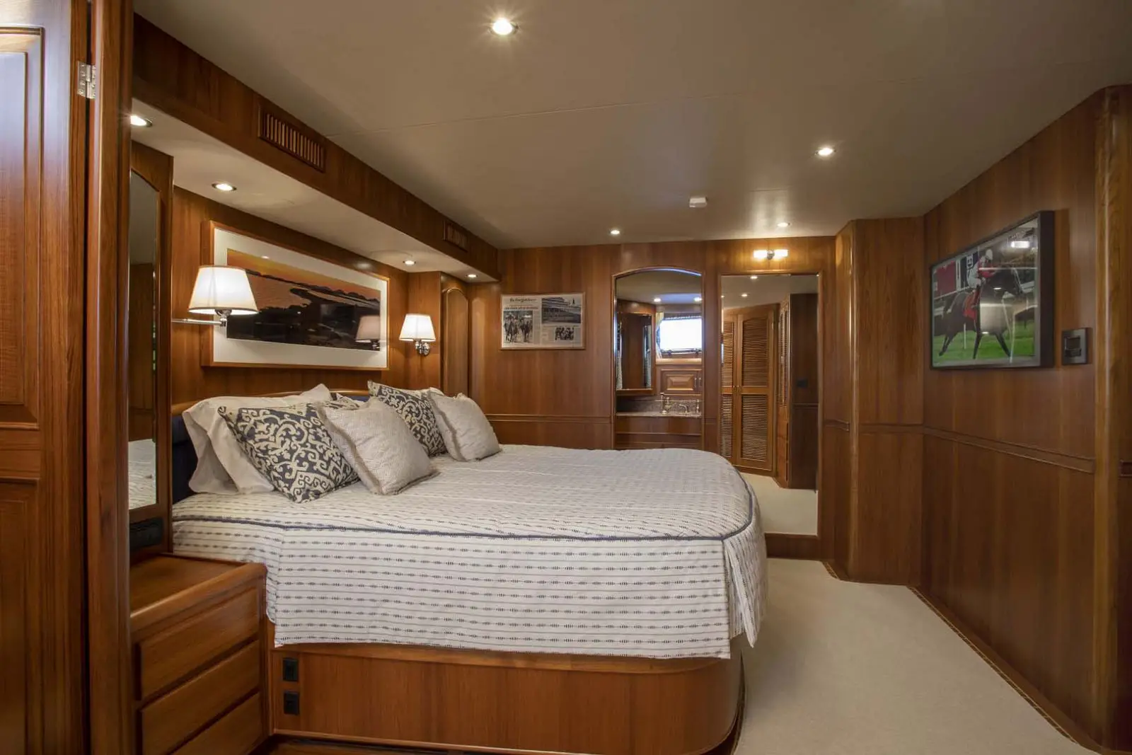 The owner's stateroom features a kingsize bed with mattress, which lifts hydraulically for easy access to a large storage area under it. A curved bureau with mirrors are on either side of the bed. Teak cove moldings along both sides of the stateroom and a curved soffit over the bed contain concealed lighting. There is a walk-in closet with louvered double doors and portlight, a desk with ample drawers and a space designated for a TV. Large stainless steel, CE-approved portlights are featured in the stateroom and head.