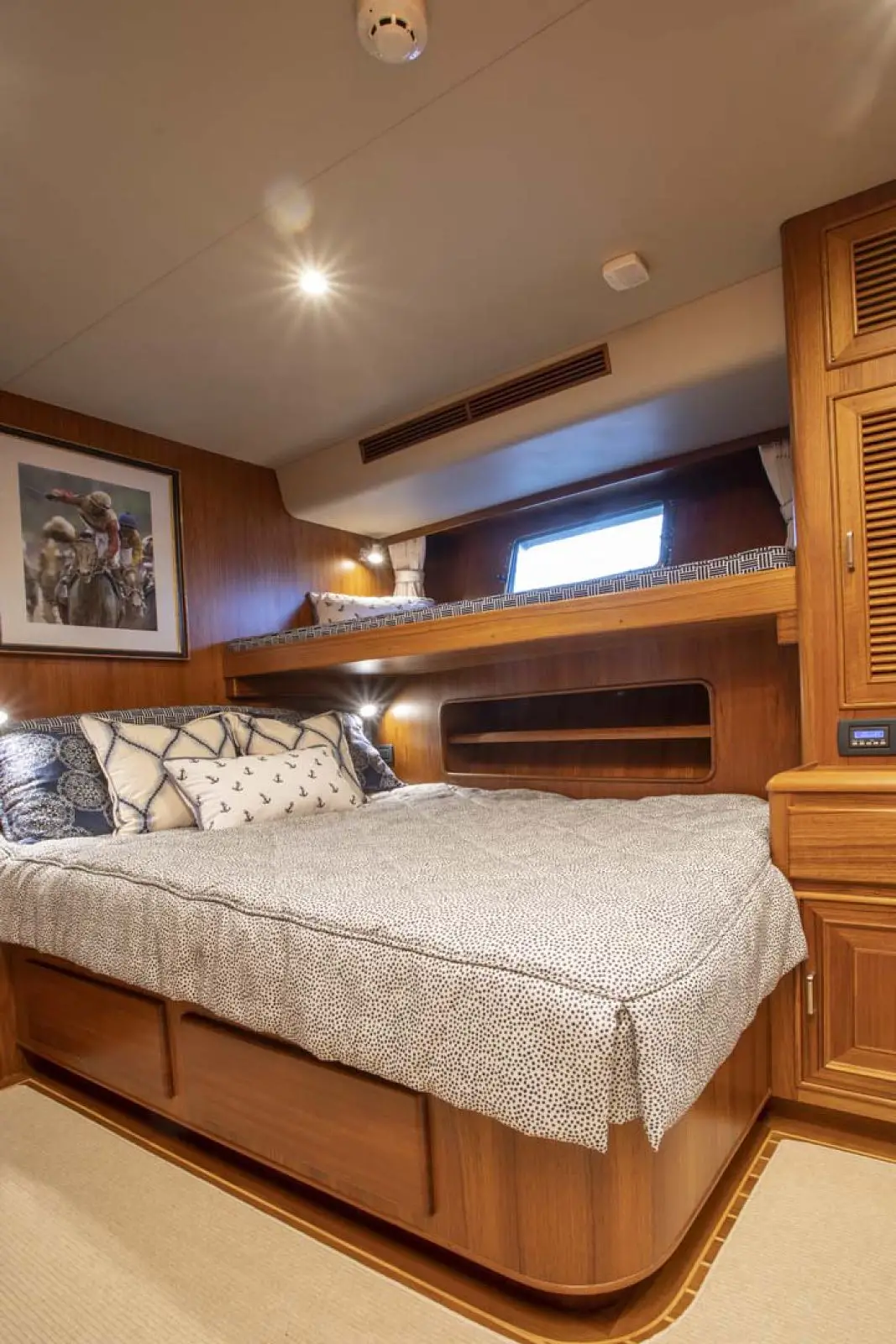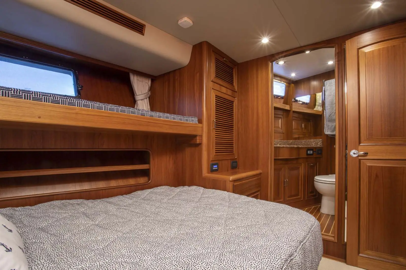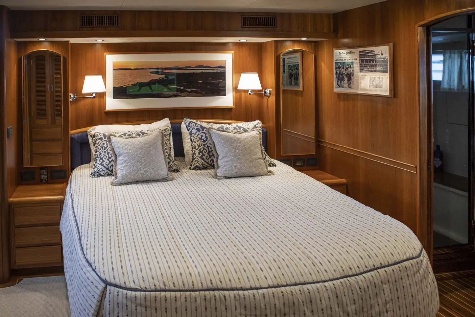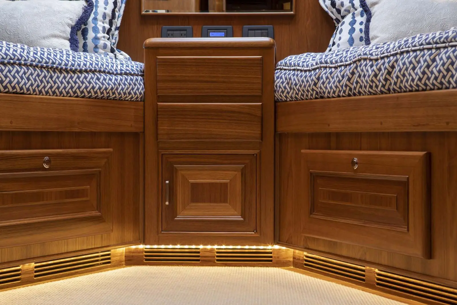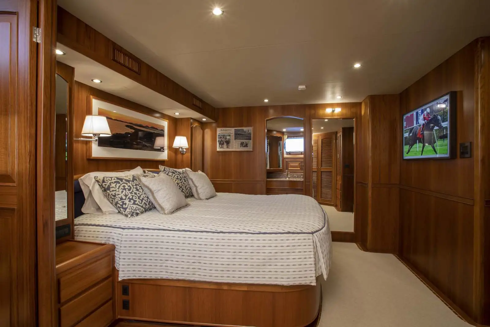 The owner's stateroom features a kingsize bed with mattress, which lifts hydraulically for easy access to a large storage area under it. A curved bureau with mirrors are on either side of the bed. Teak cove moldings along both sides of the stateroom and a curved soffit over the bed contain concealed lighting. There is a walk-in closet with louvered double doors and portlight, a desk with ample drawers and a space designated for a TV. Large stainless steel, CE-approved portlights are featured in the stateroom and head.