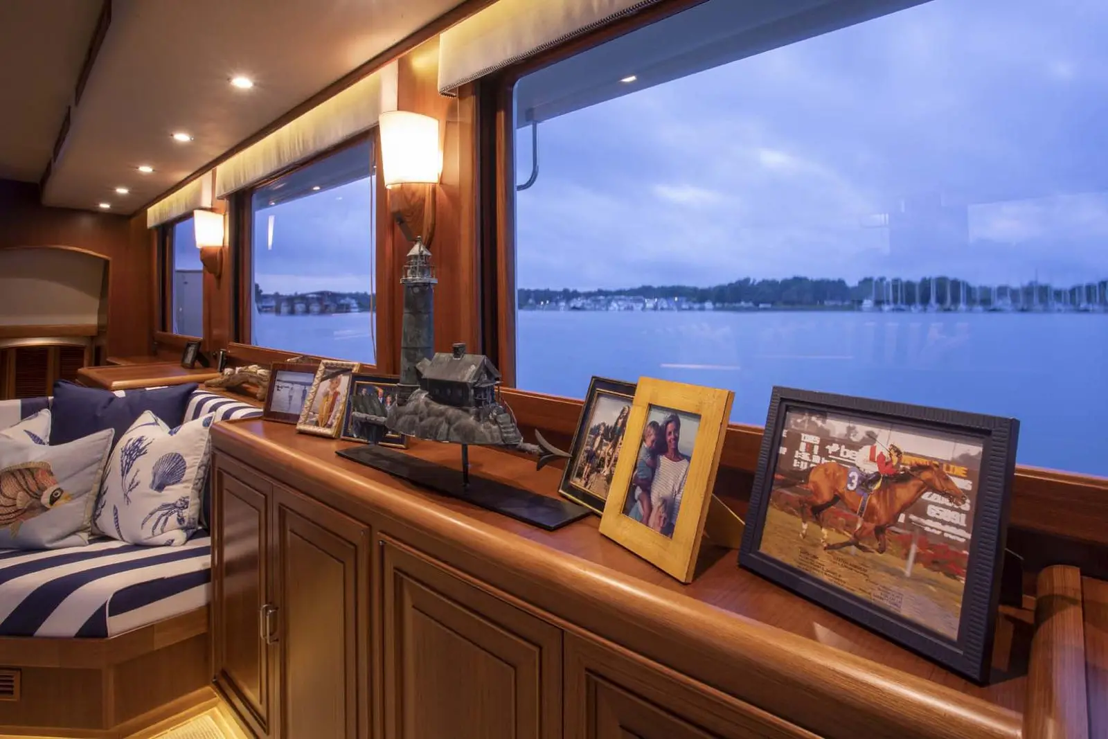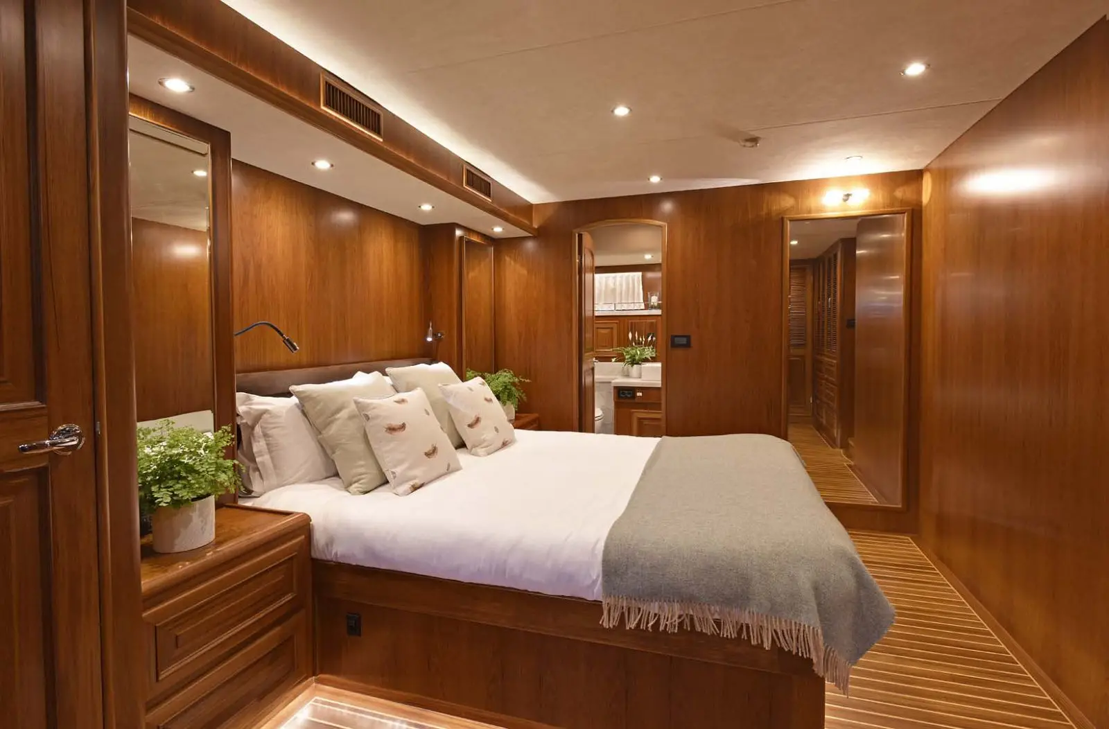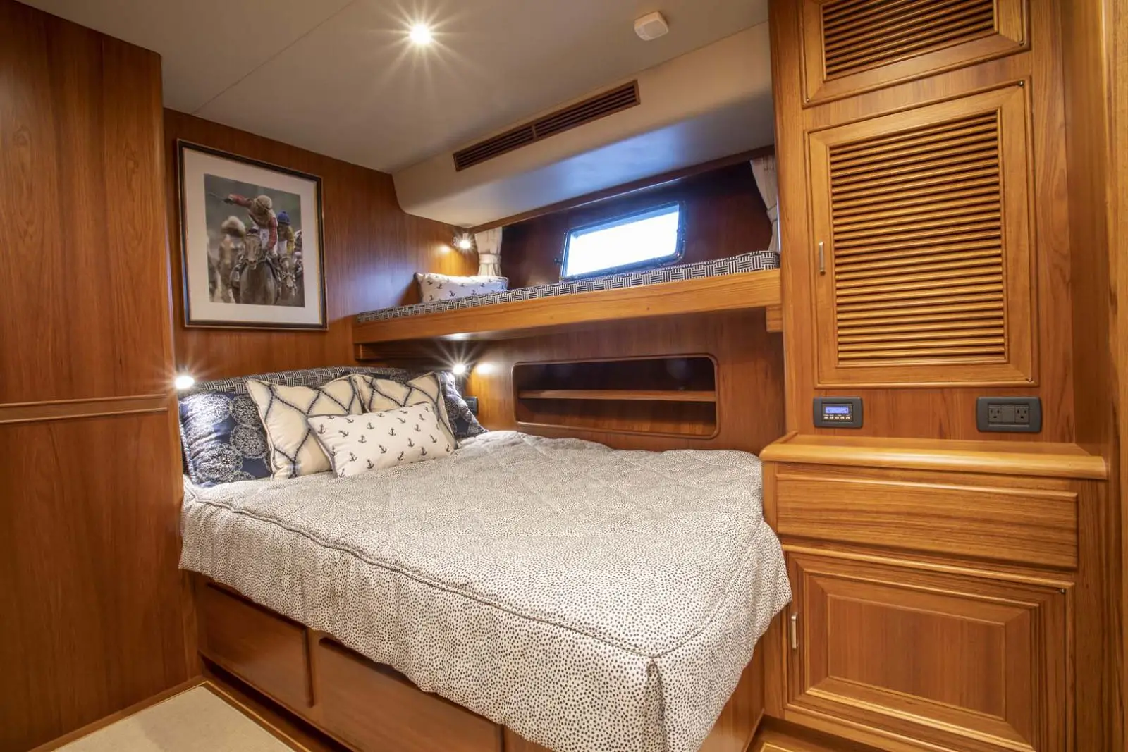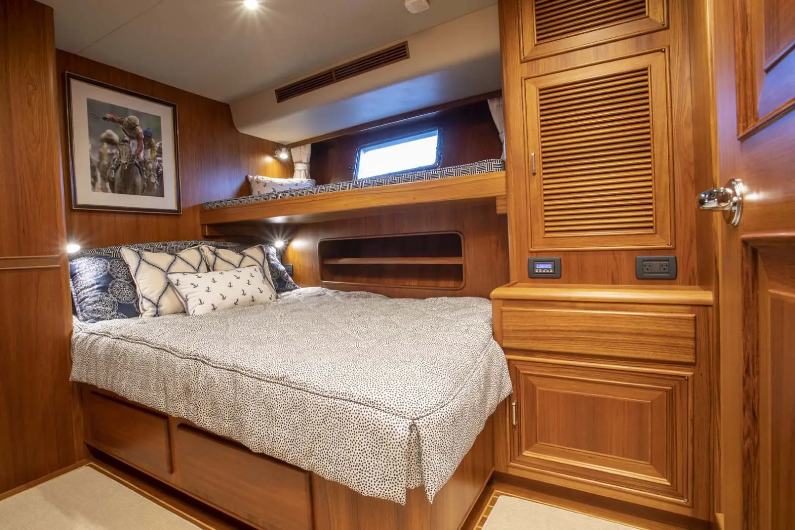 The owner's stateroom features a kingsize bed with mattress, which lifts hydraulically for easy access to a large storage area under it. A curved bureau with mirrors are on either side of the bed. Teak cove moldings along both sides of the stateroom and a curved soffit over the bed contain concealed lighting. There is a walk-in closet with louvered double doors and portlight, a desk with ample drawers and a space designated for a TV. Large stainless steel, CE-approved portlights are featured in the stateroom and head.