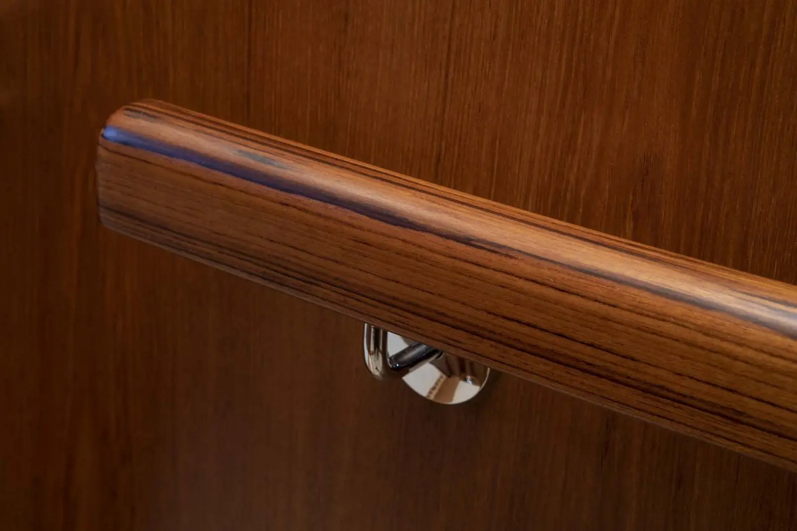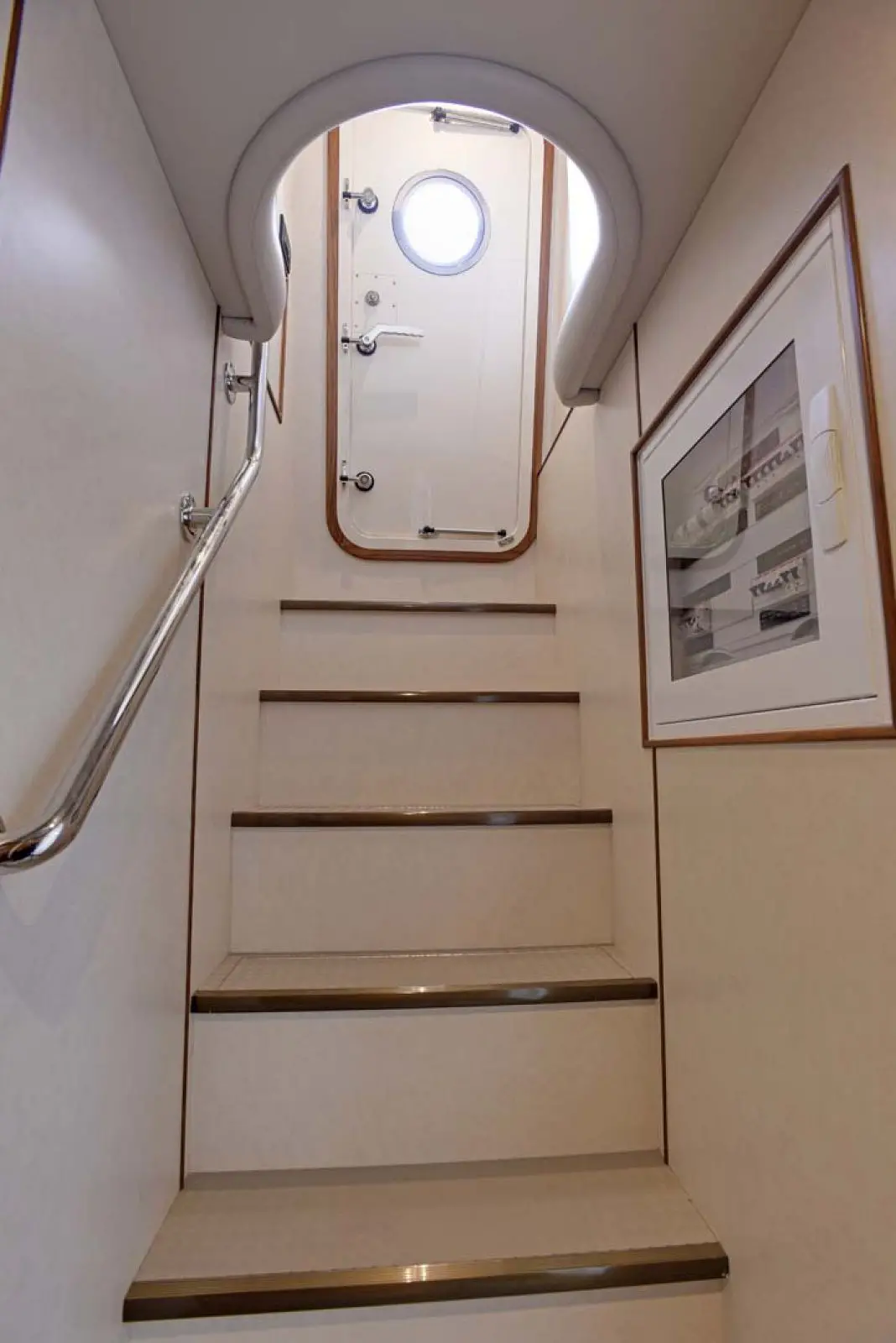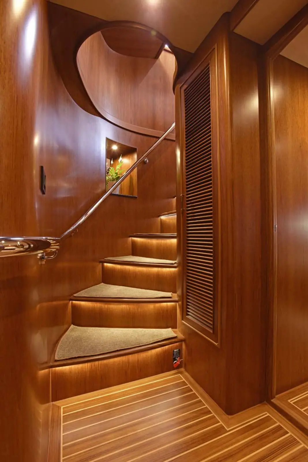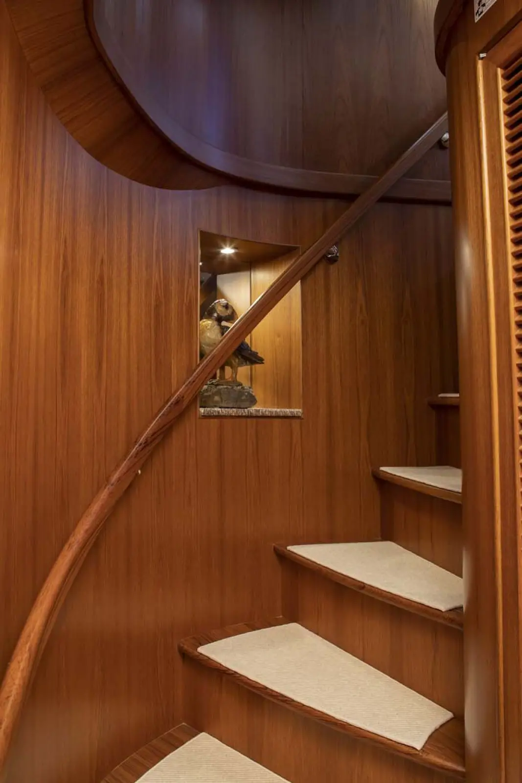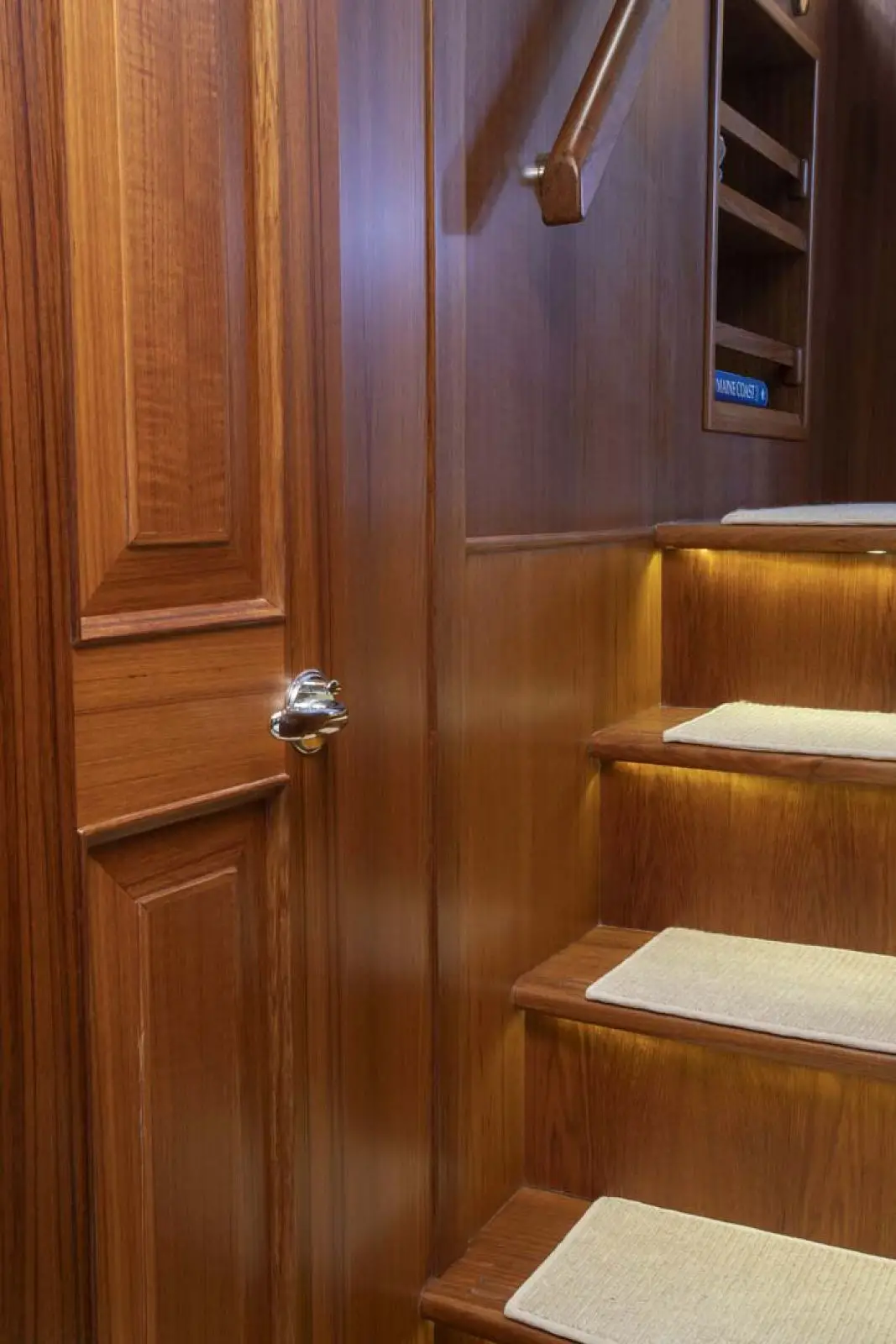 The wide beam of the Fleming 78 provides exceptionally spacious accommodations featuring teak and holly soles throughout and bulkheads faced with teak and synthetic soft leather paneling and headliners. The accommodations are reached from the pilothouse via stairs, which widen and flatten out as they descend into the forward lobby. Each tread is illuminated with concealed rope lights for discreet evening illumination. An oval section stainless steel handrail follows the curve of the stairwell, which also features a mirrored alcove with a granite shelf for owner's art work.