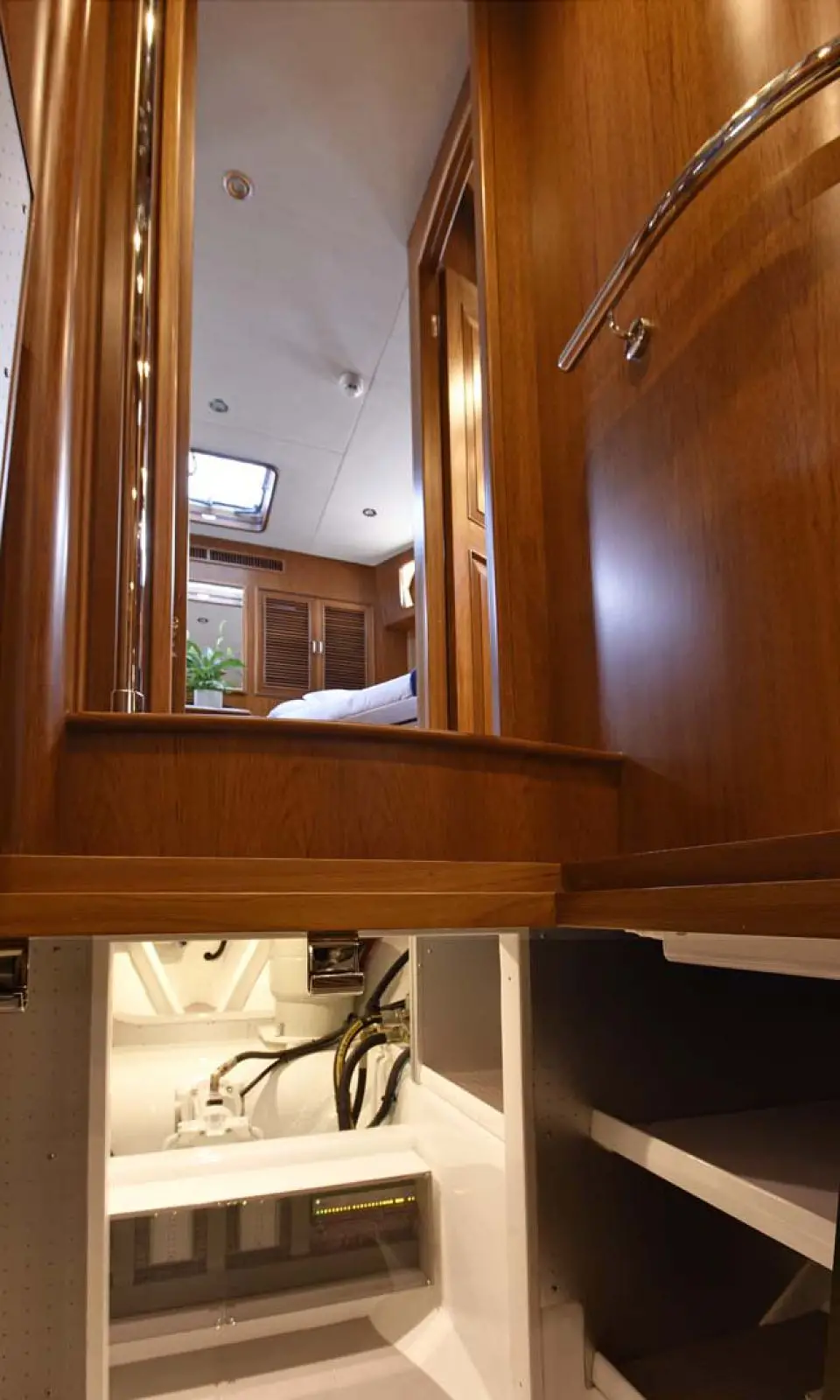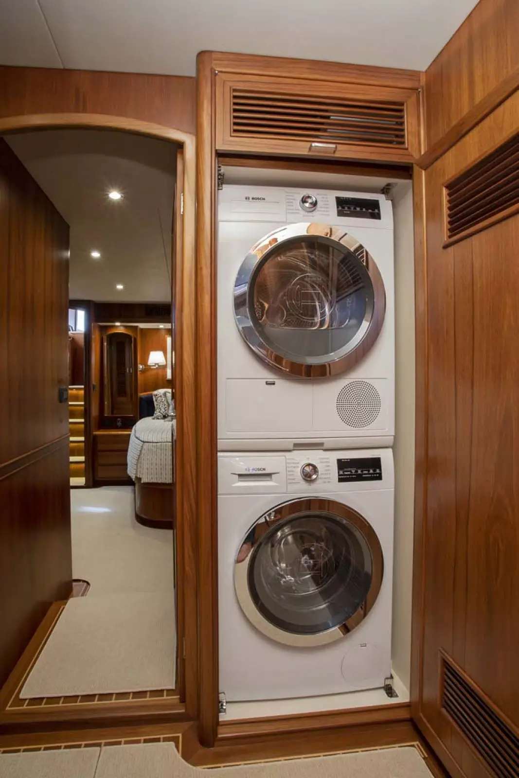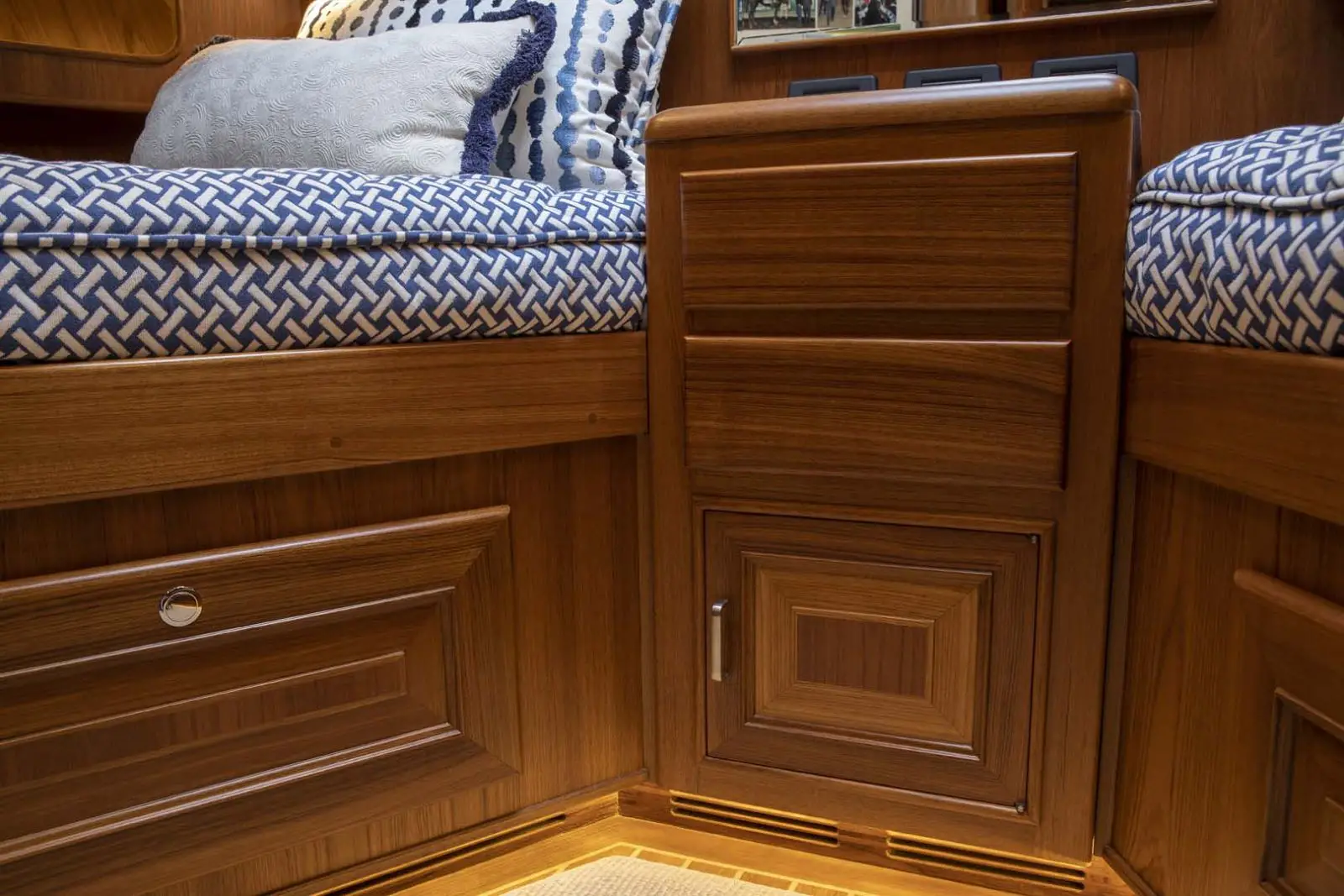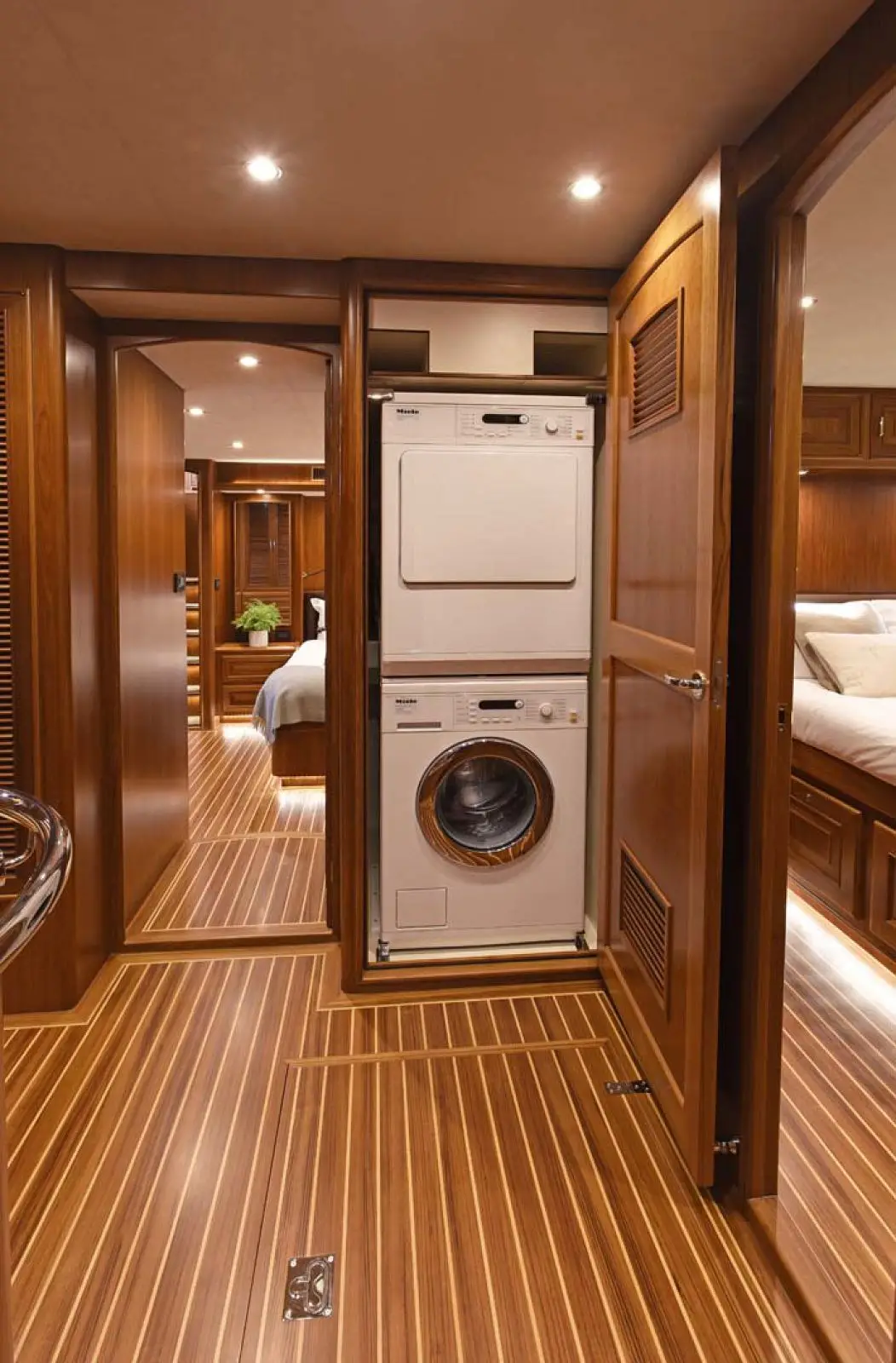Each of the staterooms open off the forward lobby, which has a custom overhead light and a vertical stainless handgrip. A gas-spring assisted hatch leads to the machinery space below the sole. The washer and drier are concealed behind a teak-faced door.