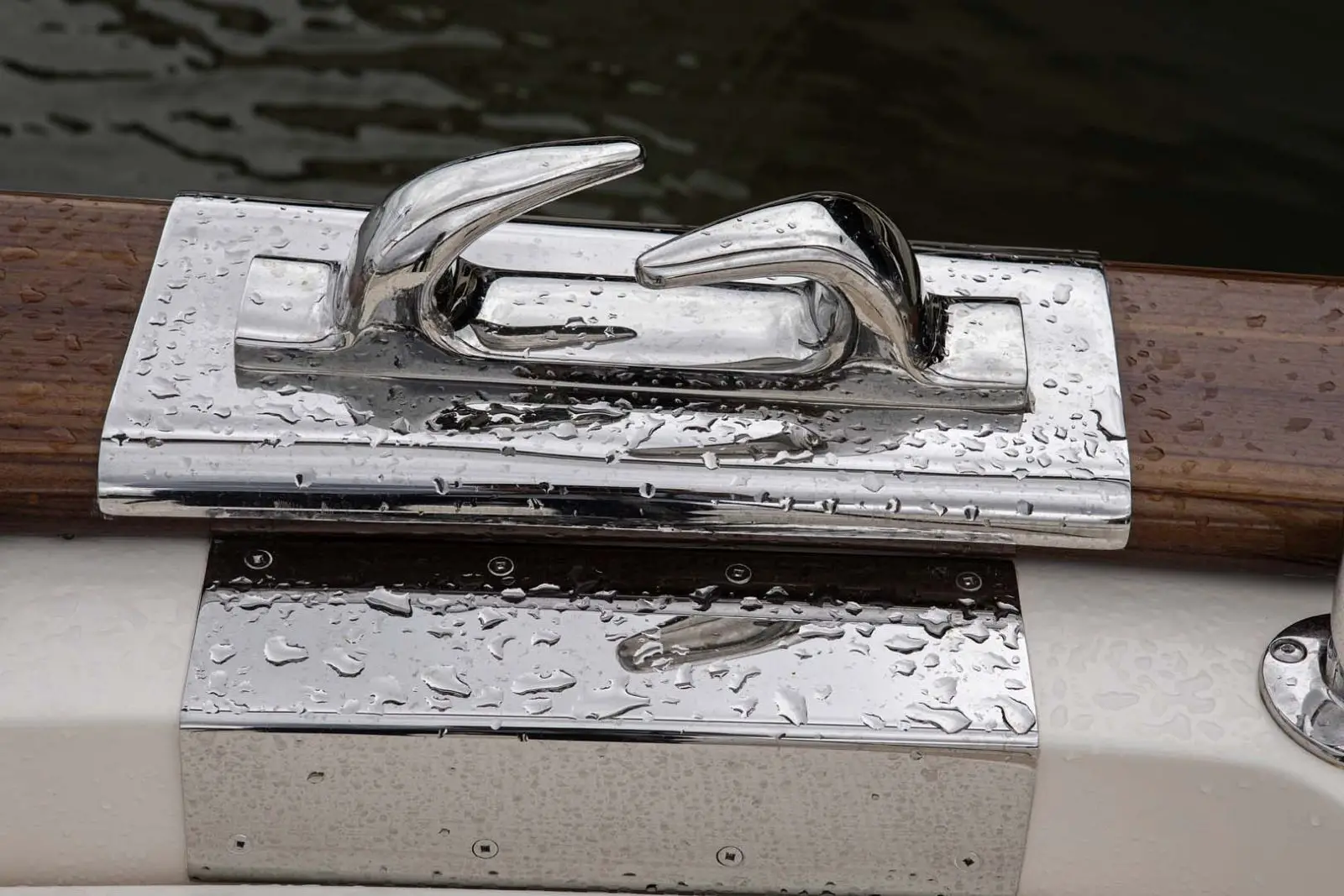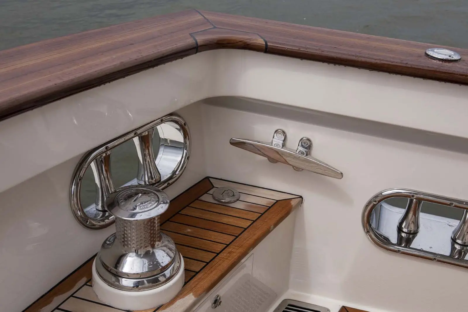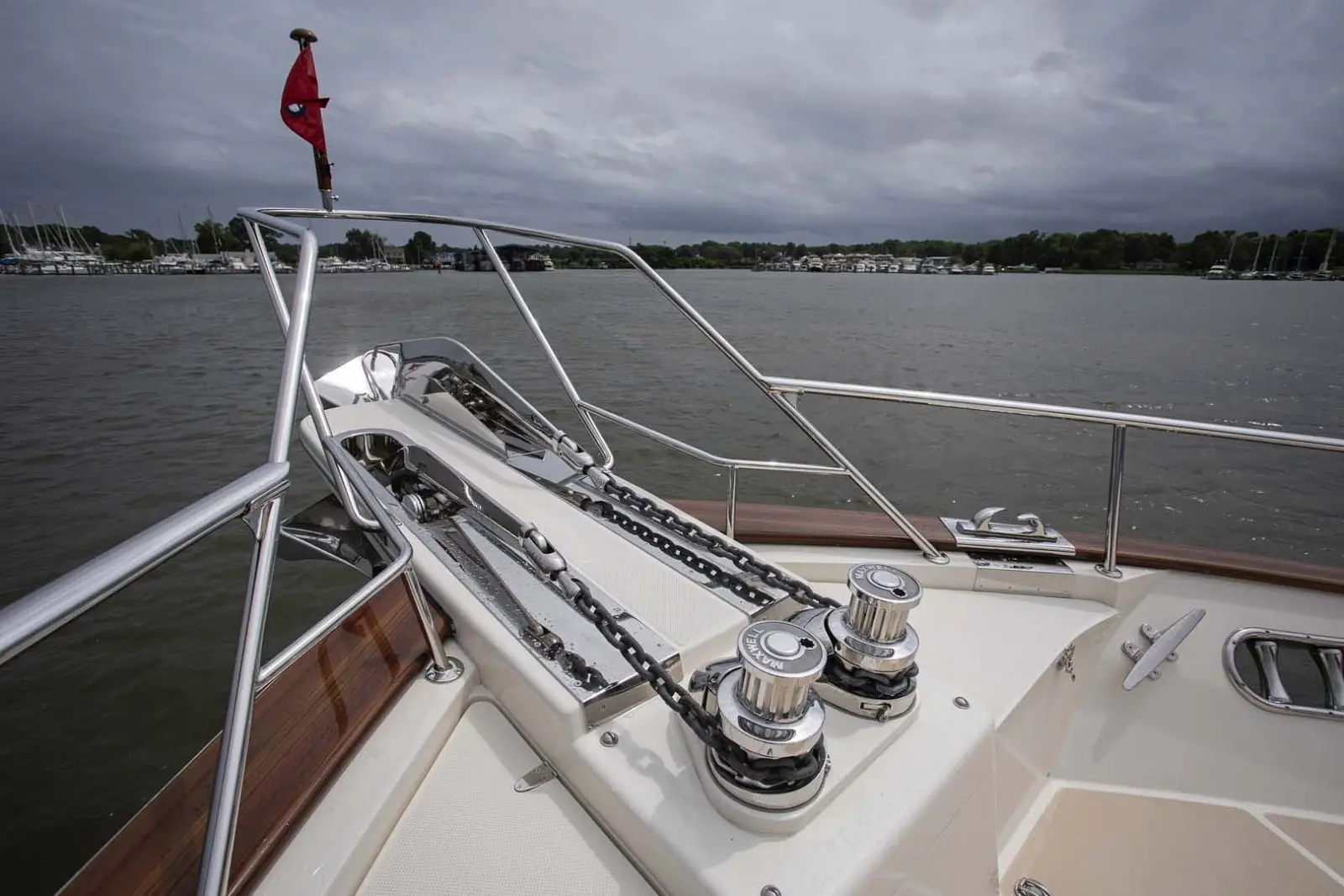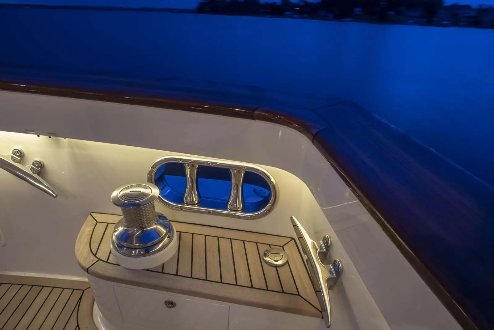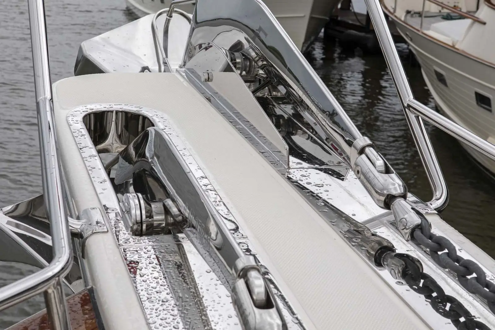 Solid stainless steel fairleads are bolted through the bulwarks to allow the capstans to be used for warping. Storage lockers, either side of the anchor platform, house twin shorepower inlets as well as salt and fresh water  bibs.