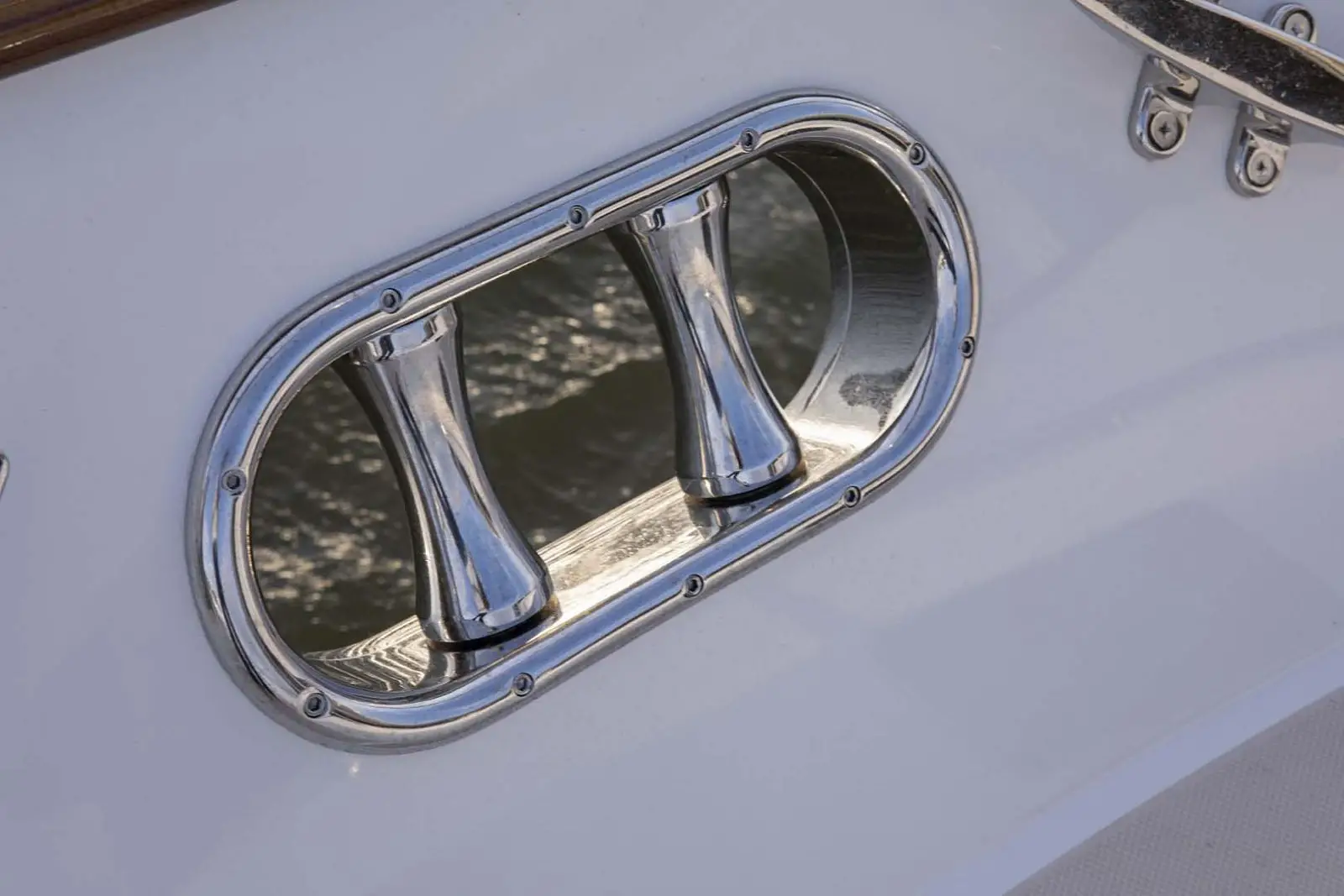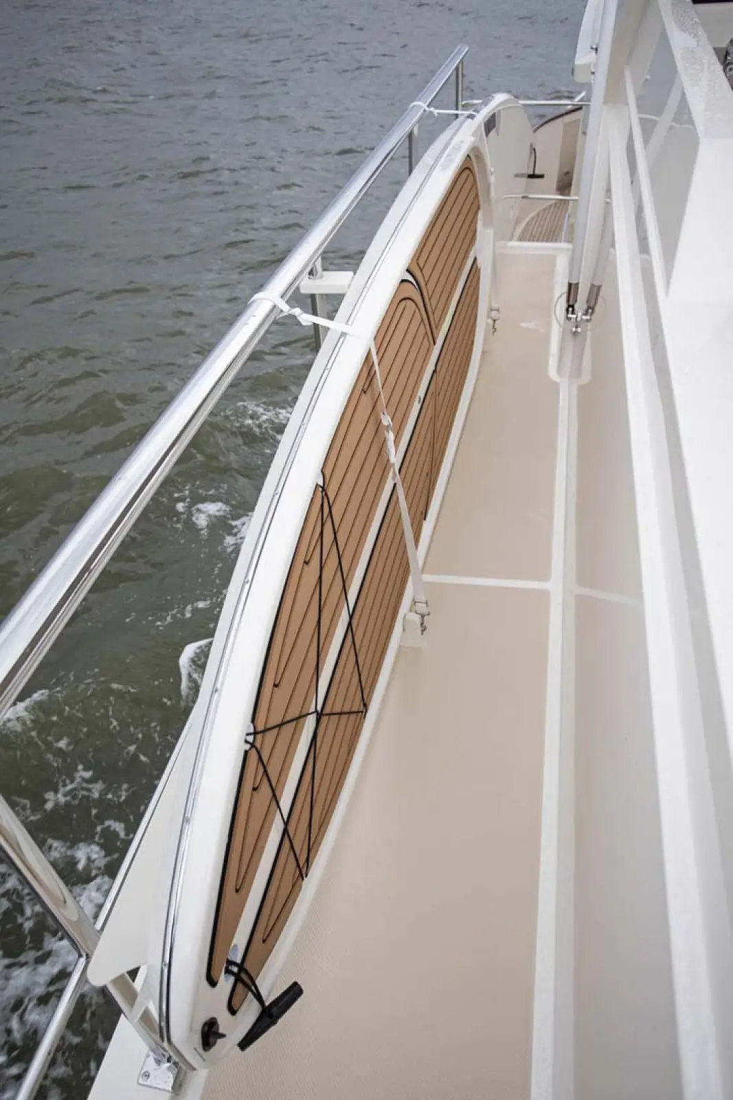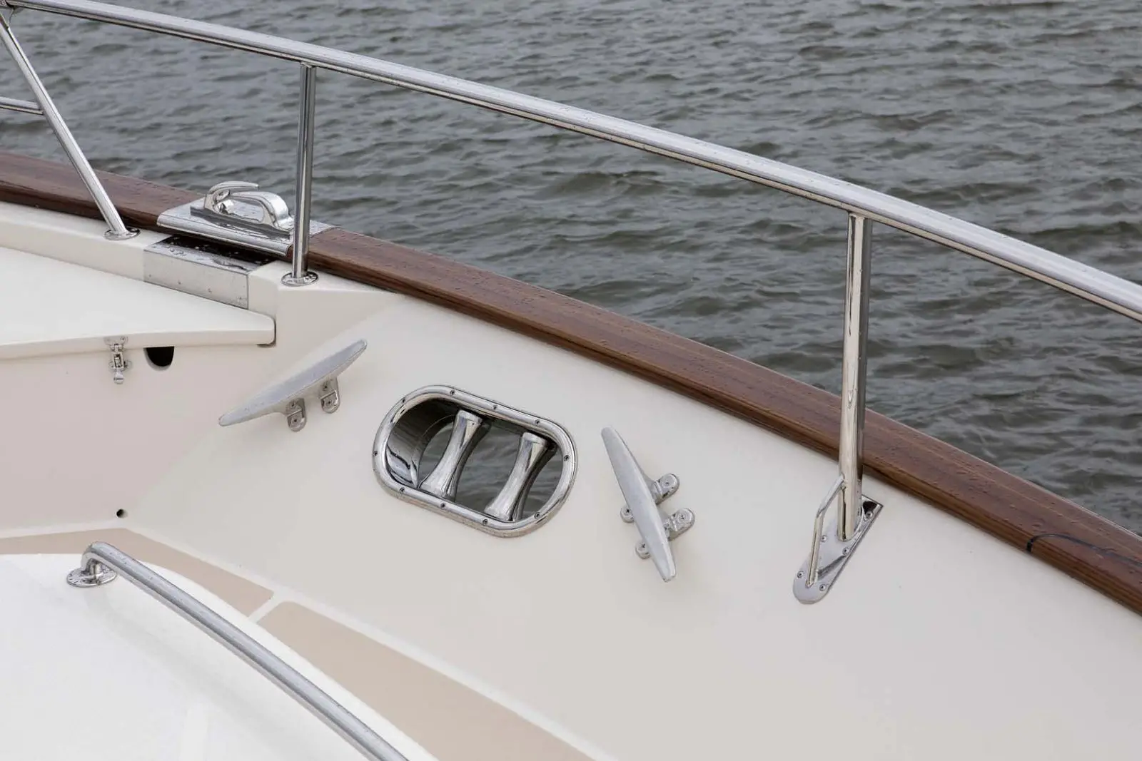 Wide, well-protected side decks run down both sides of the boat with sturdy stainless steel handrails. Fuel fills with unique covers and anti-burp design are concealed within the steps leading down from the bridge deck. Bulwarks have inward-opening doors. Spring line cleats are recessed either side of roller chocks for spring lines.