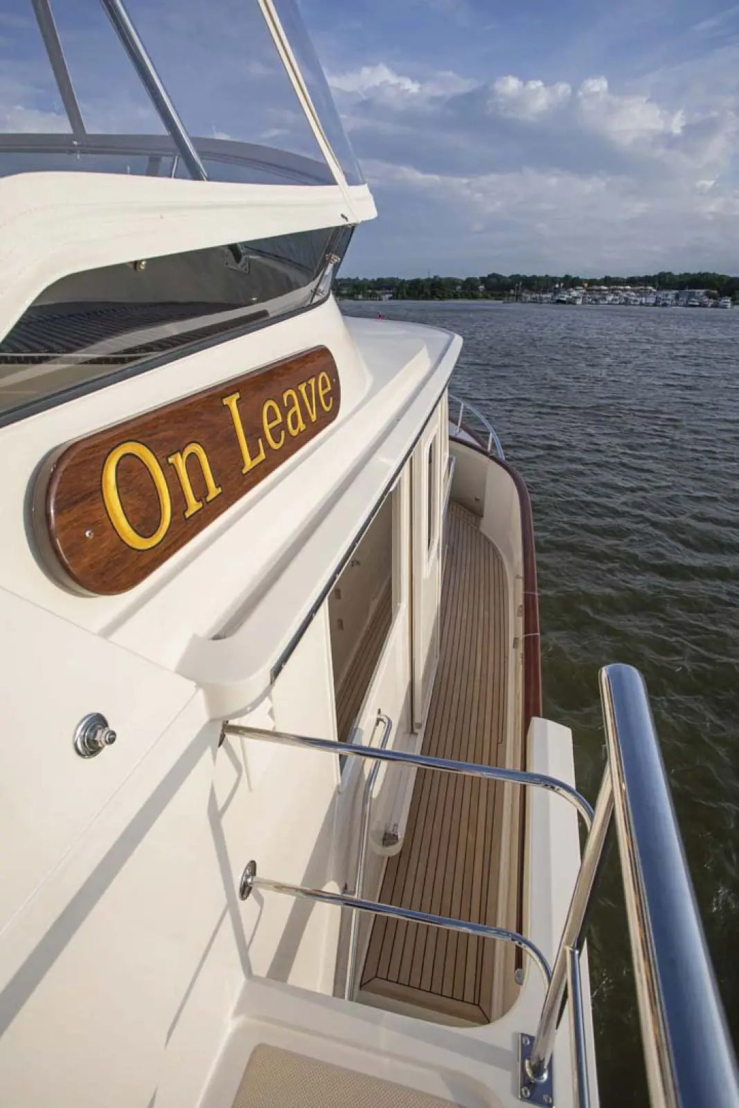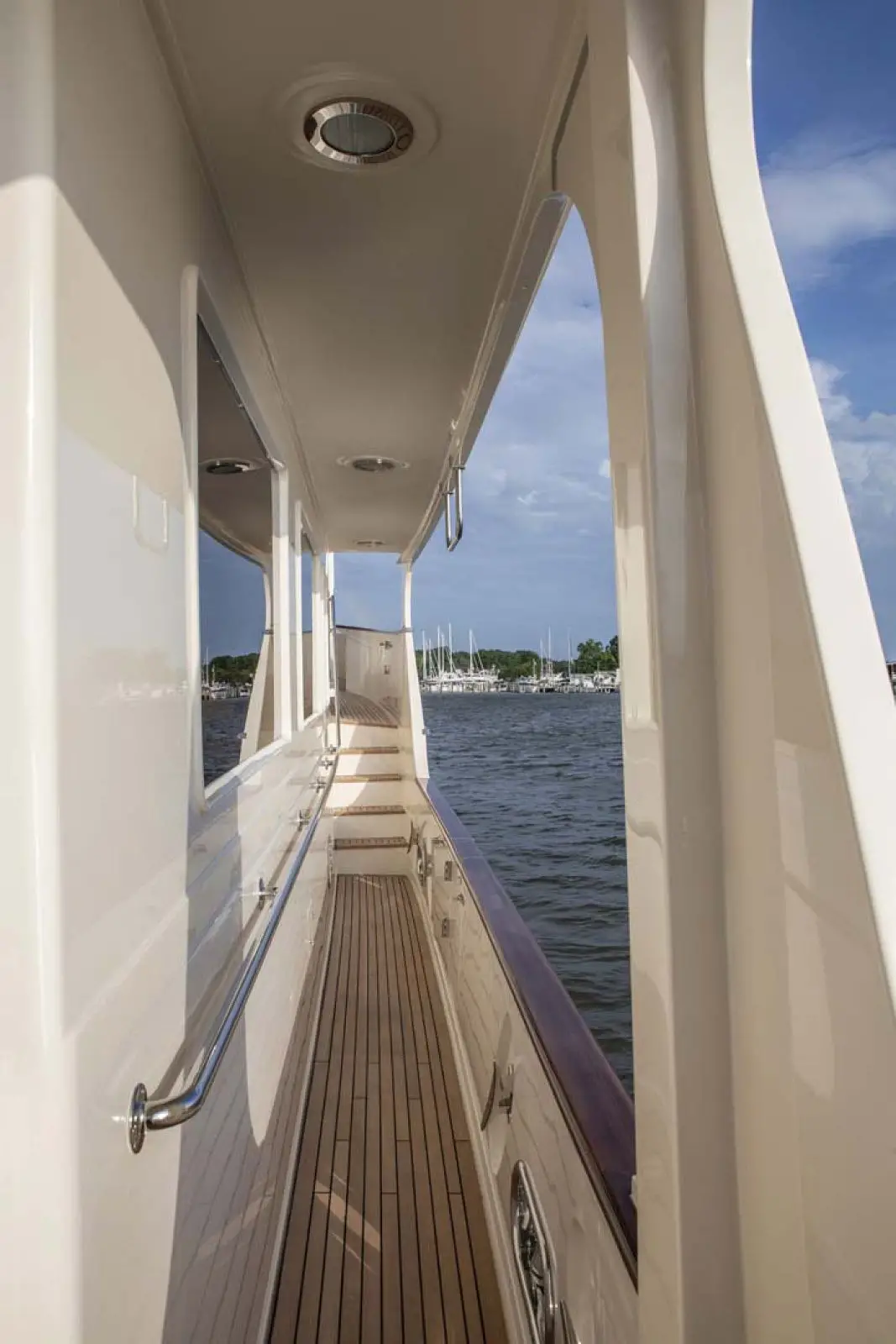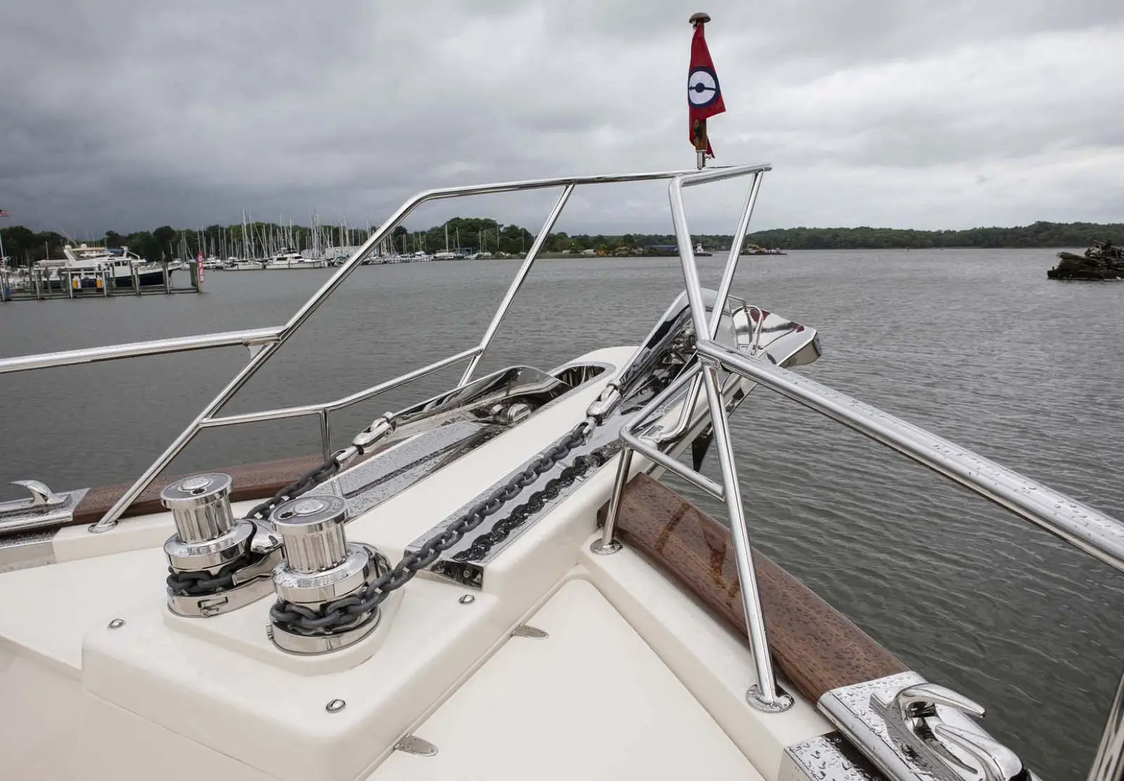 Wide, well-protected side decks run down both sides of the boat with sturdy stainless steel handrails. Fuel fills with unique covers and anti-burp design are concealed within the steps leading down from the bridge deck. Bulwarks have inward-opening doors. Spring line cleats are recessed either side of roller chocks for spring lines.