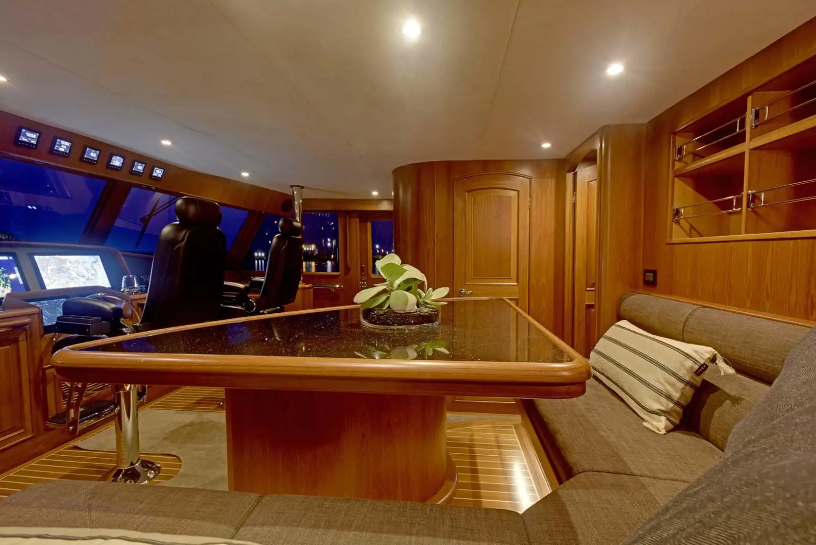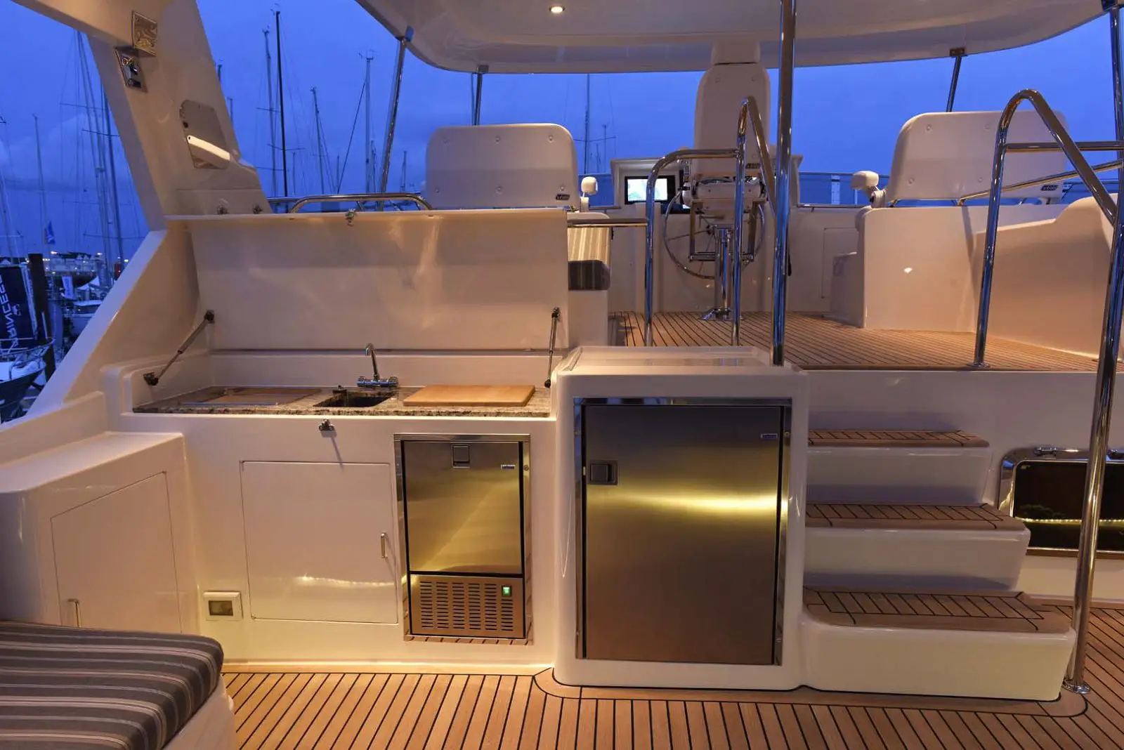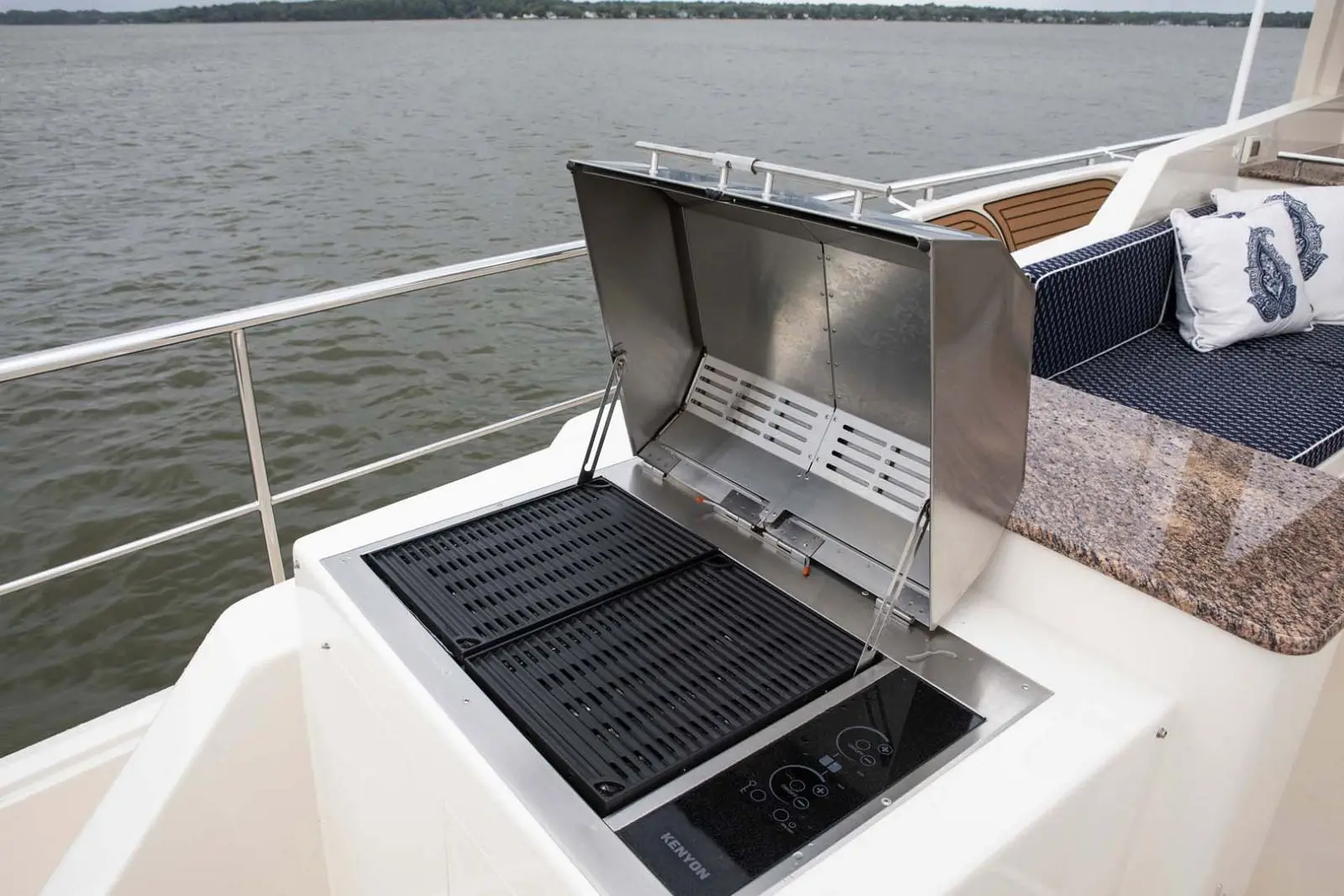 The forward portion of the lower level is primarily for entertainment and is equipped with seating for a dozen people around a large table. Forward is a fridge and icemaker plus barbecue and sink beneath a folding lid. There is concealed lighting in the toe-space beneath the settees. A large watertight door provides direct access into the pilot house. A larger gas grill and top-opening freezer are offered as options in lieu of a port settee on the lower level.