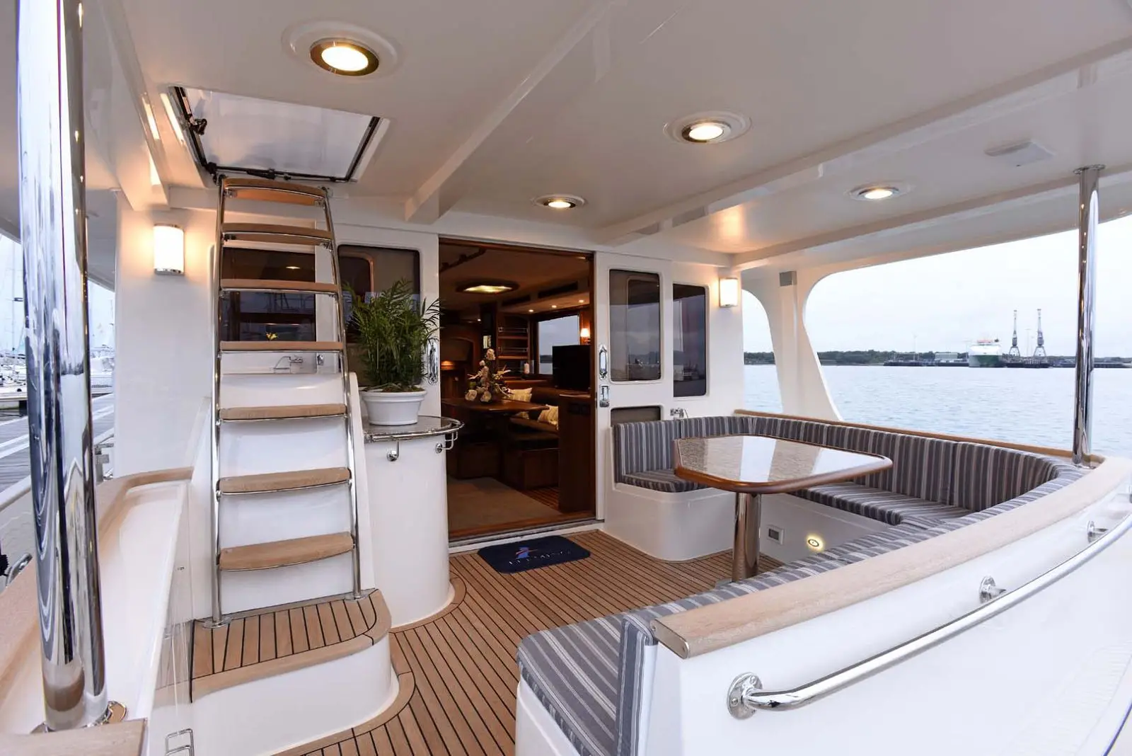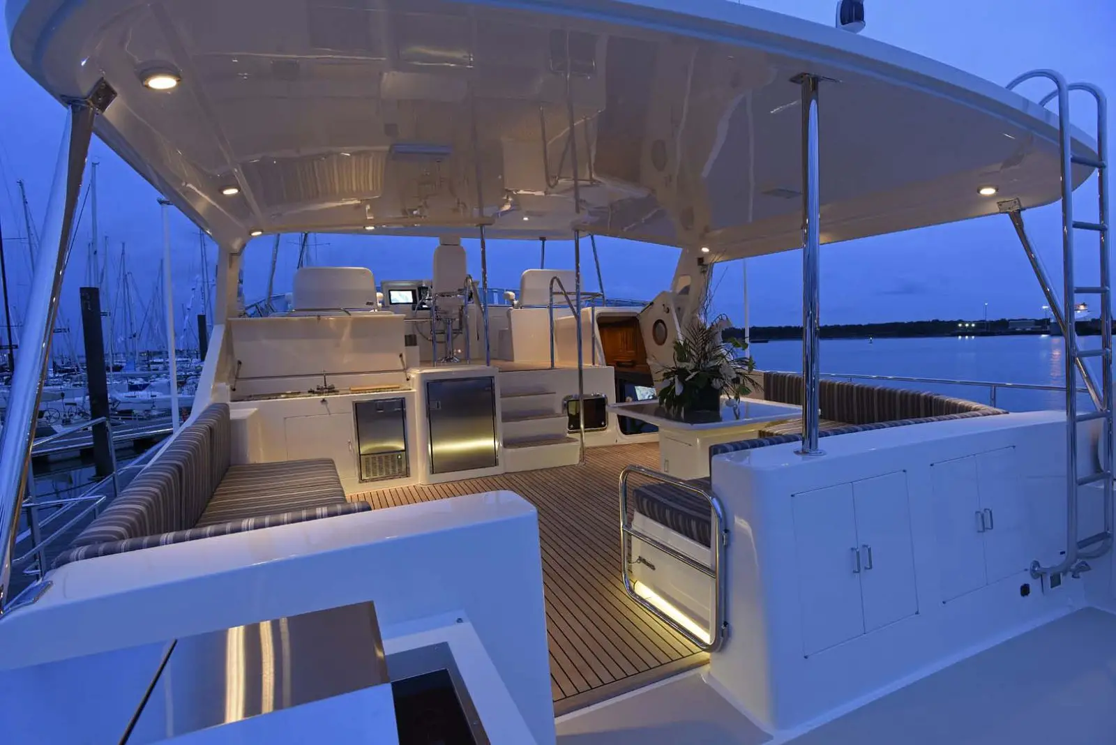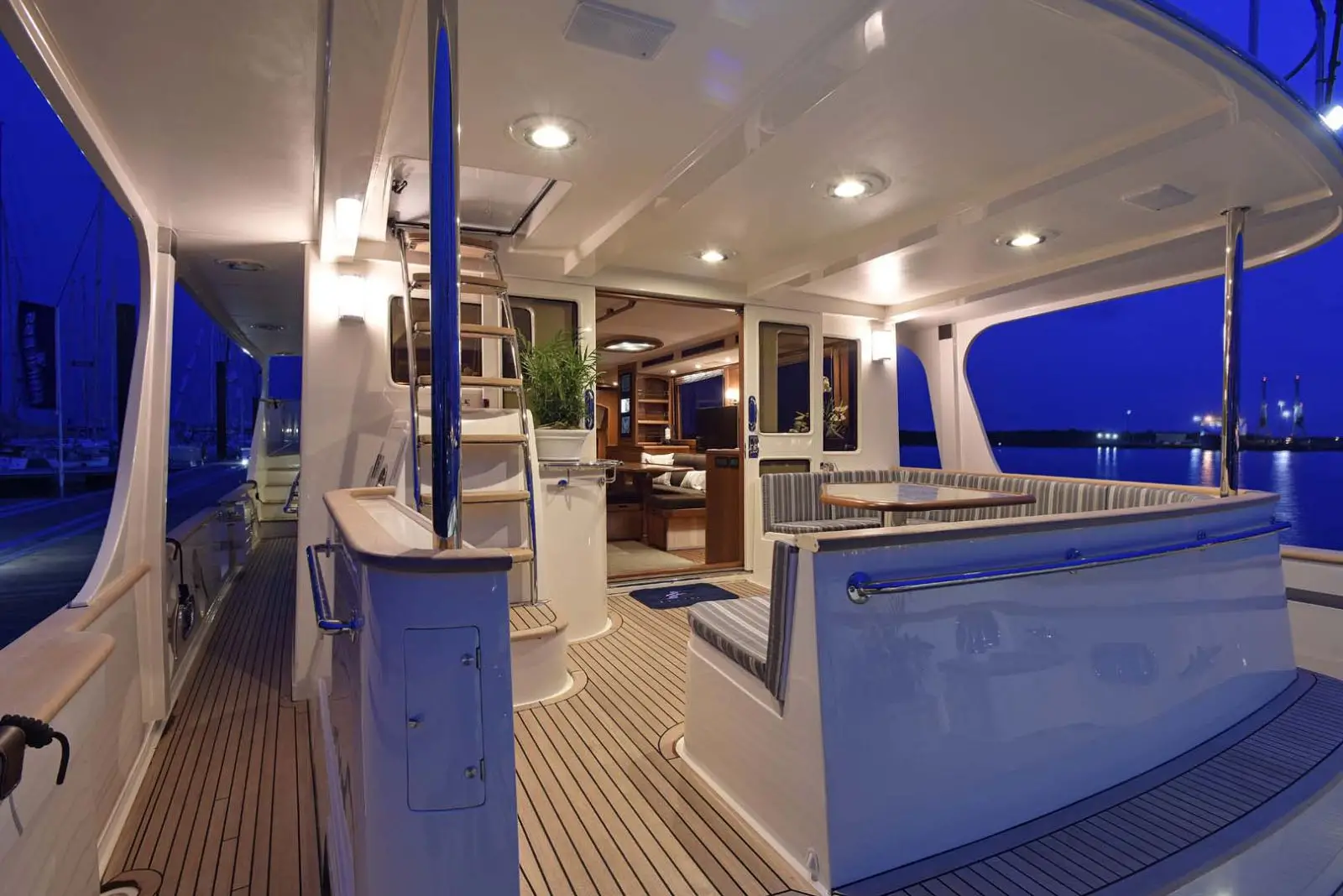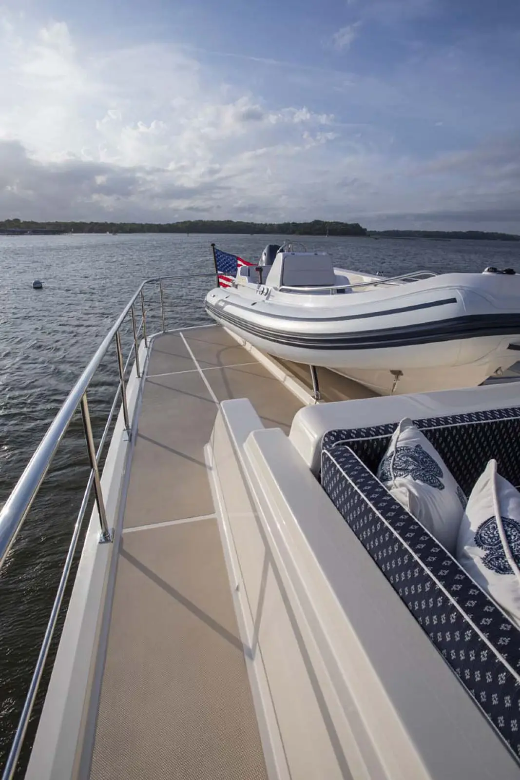 Aft of the seating area is the boat deck equipped with a 12-foot, 1,500 lb. (680kg) capacity davit, which has its own hydraulic power unit enabling power slewing rotation luffing and a linear hoisting winch (using a linear winch in which the cable is not wrapped around a drum). The boat deck will accept tenders up to 17-feet mounted fore and aft. Also on the boat deck is a lift-up hatch providing access to the California deck and cockpit. An AC outlet is provided for plugging in a battery charger for the tender.