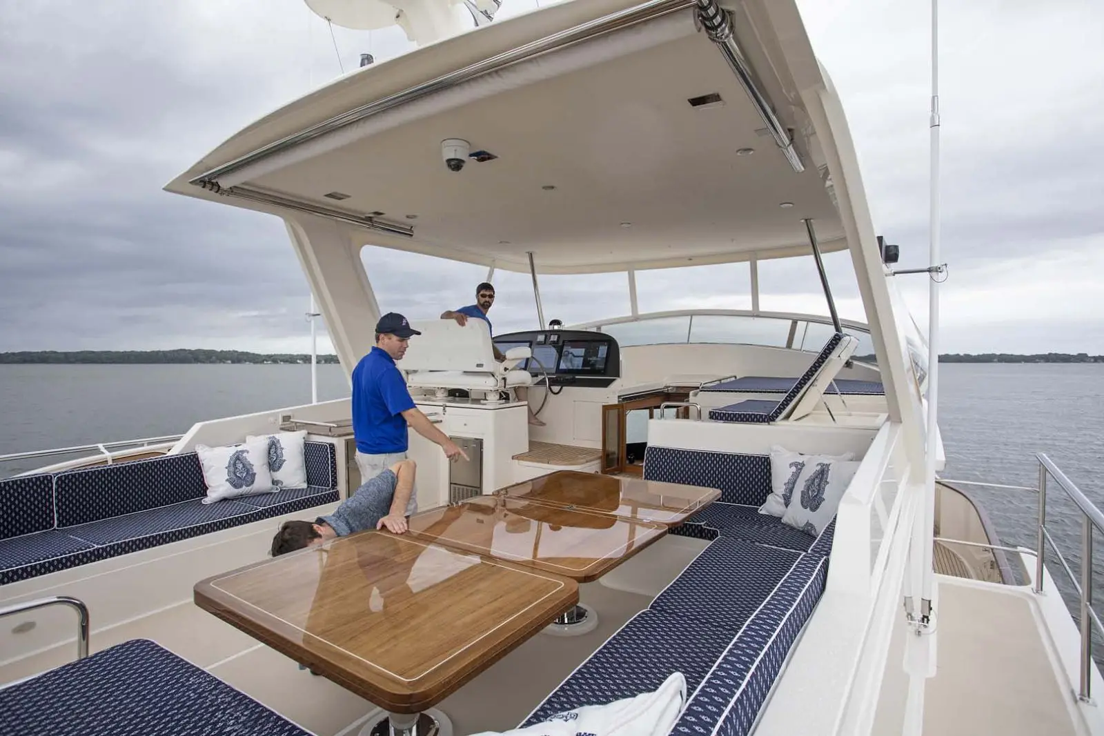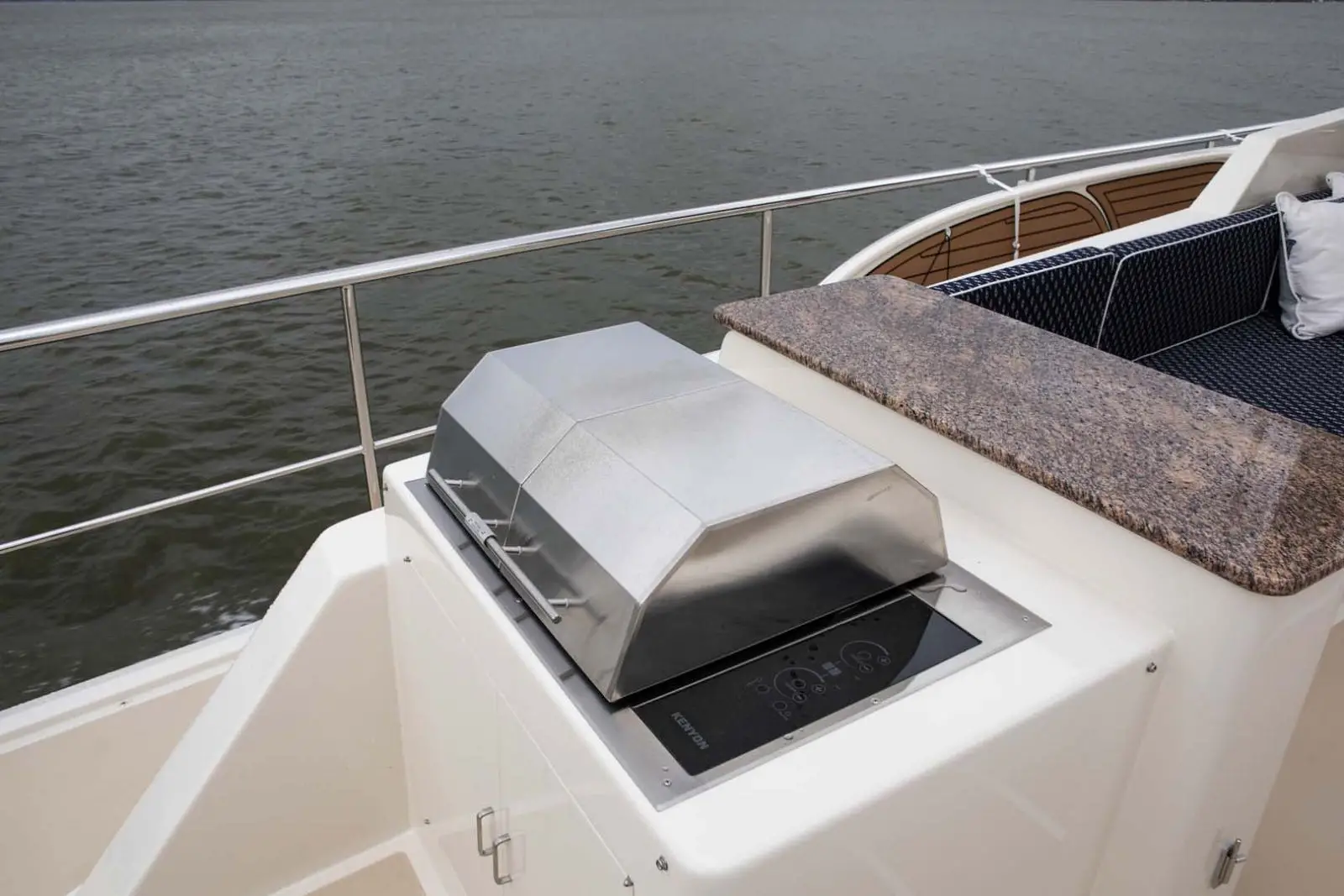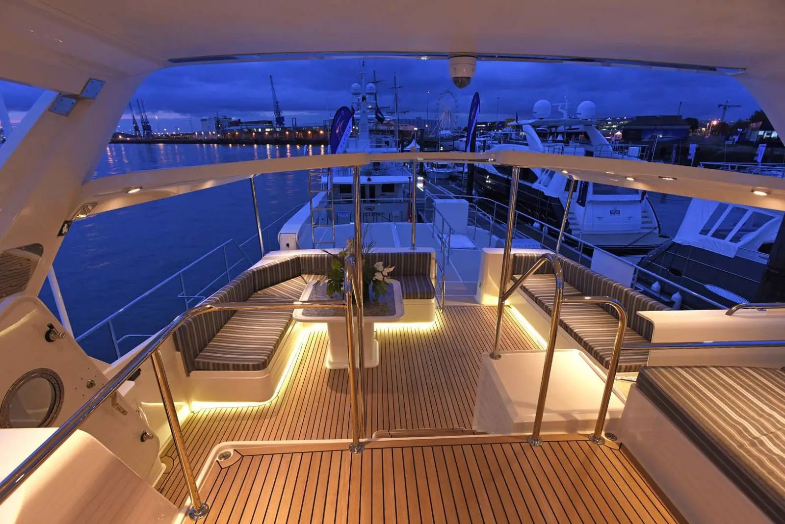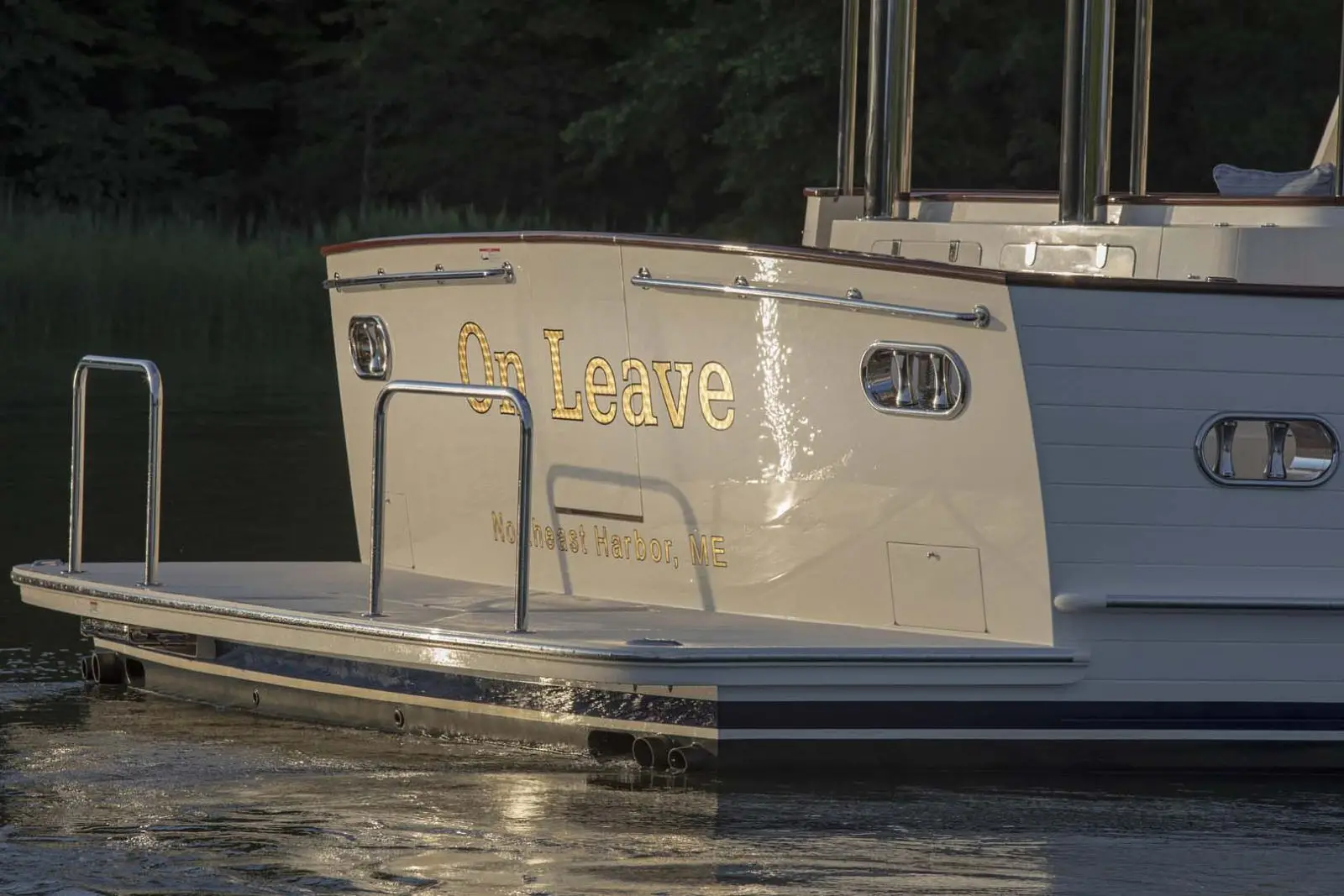 Aft of the seating area is the boat deck equipped with a 12-foot, 1,500 lb. (680kg) capacity davit, which has its own hydraulic power unit enabling power slewing rotation luffing and a linear hoisting winch (using a linear winch in which the cable is not wrapped around a drum). The boat deck will accept tenders up to 17-feet mounted fore and aft. Also on the boat deck is a lift-up hatch providing access to the California deck and cockpit. An AC outlet is provided for plugging in a battery charger for the tender.