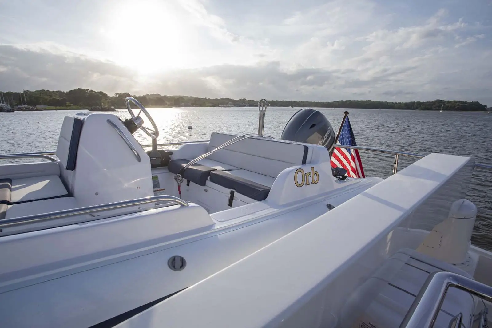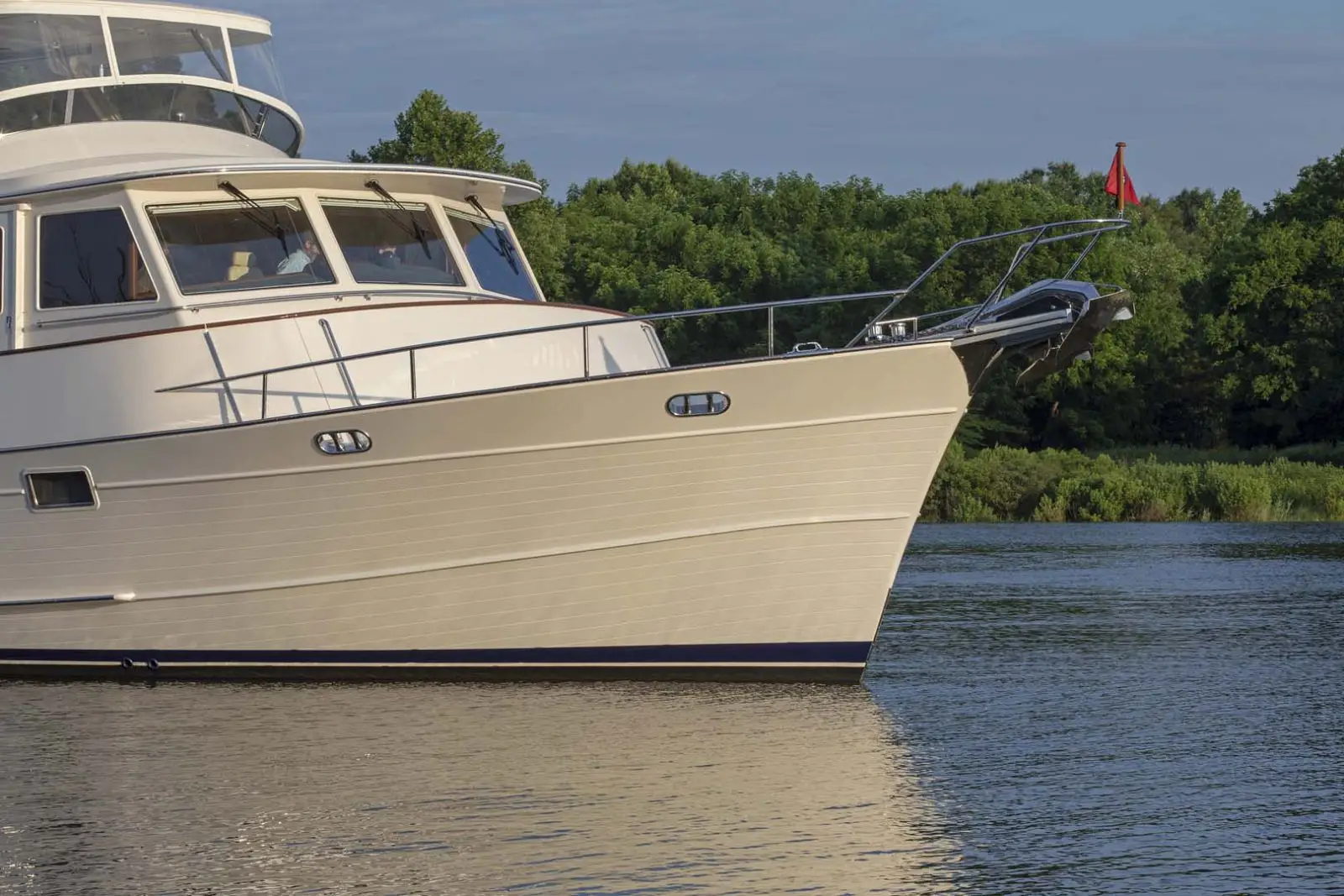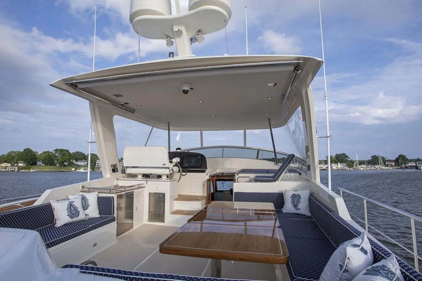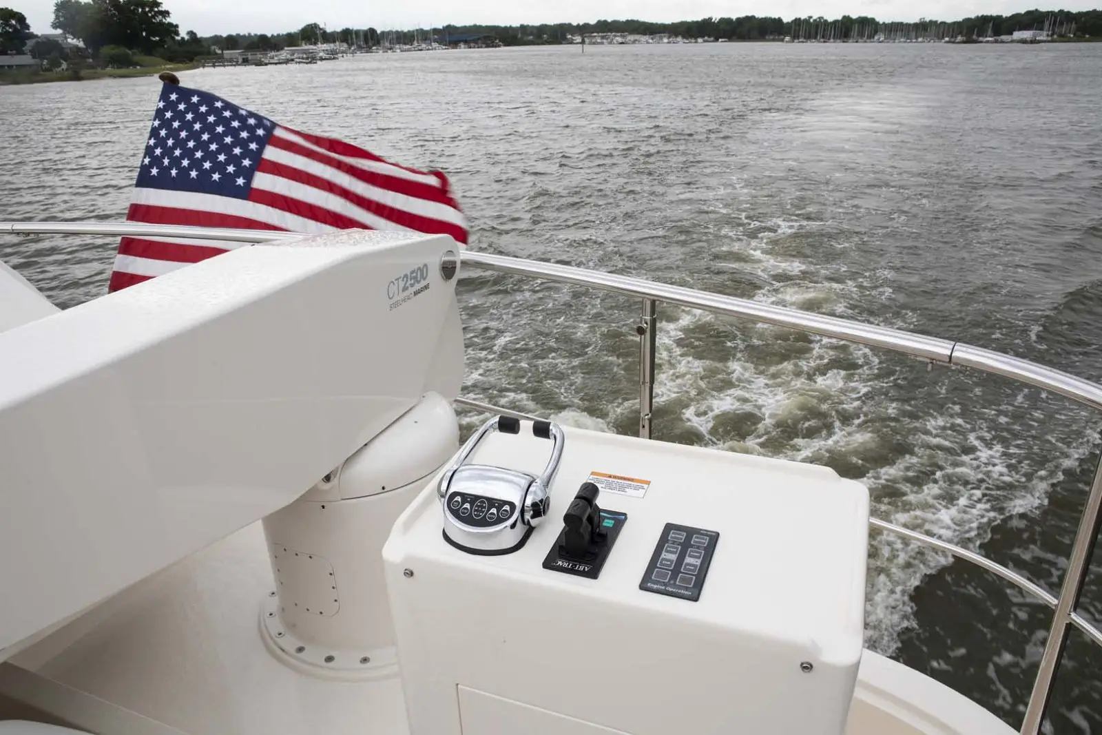 Aft of the seating area is the boat deck equipped with a 12-foot, 1,500 lb. (680kg) capacity davit, which has its own hydraulic power unit enabling power slewing rotation luffing and a linear hoisting winch (using a linear winch in which the cable is not wrapped around a drum). The boat deck will accept tenders up to 17-feet mounted fore and aft. Also on the boat deck is a lift-up hatch providing access to the California deck and cockpit. An AC outlet is provided for plugging in a battery charger for the tender.
