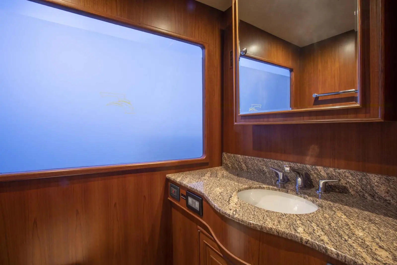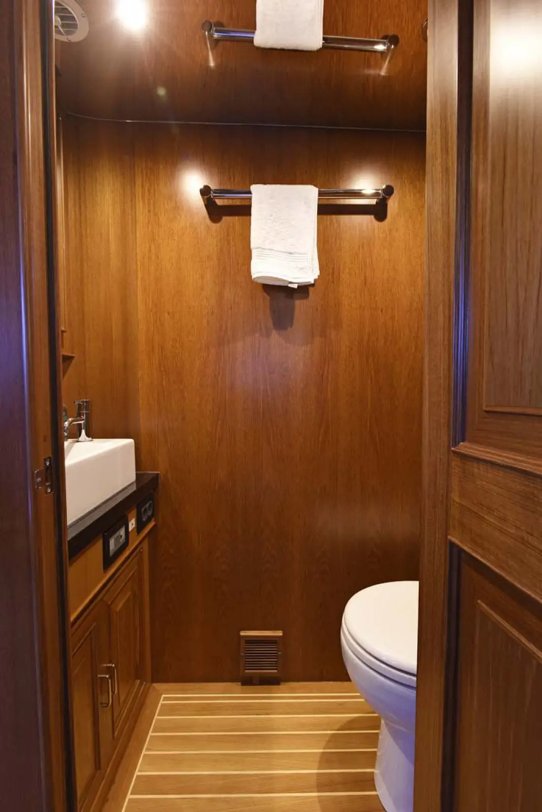 Adjacent to the pilothouse is a day head with toilet and ceramic basin set in granite or marble countertop with mirror and lockers. There is an opening portlight a blower for ventilation, and airconditioning inlet.