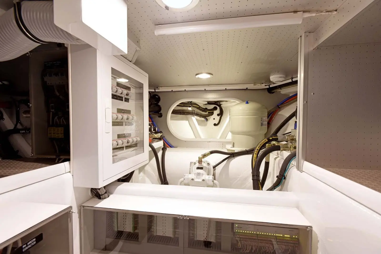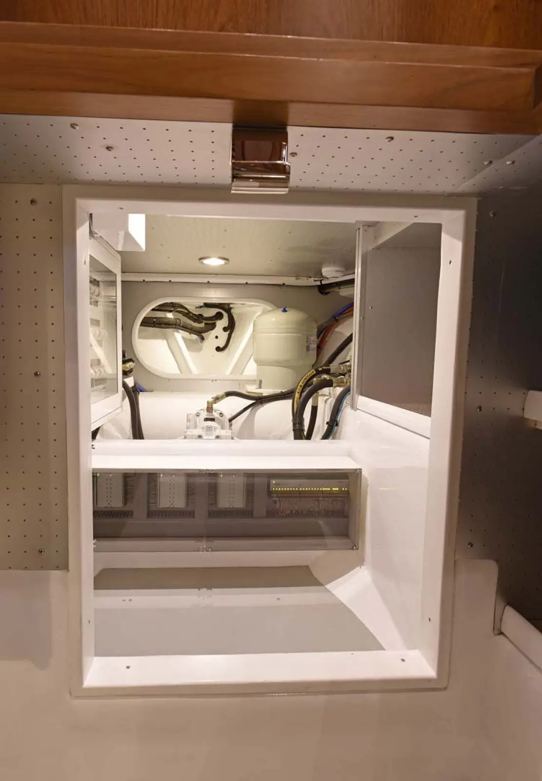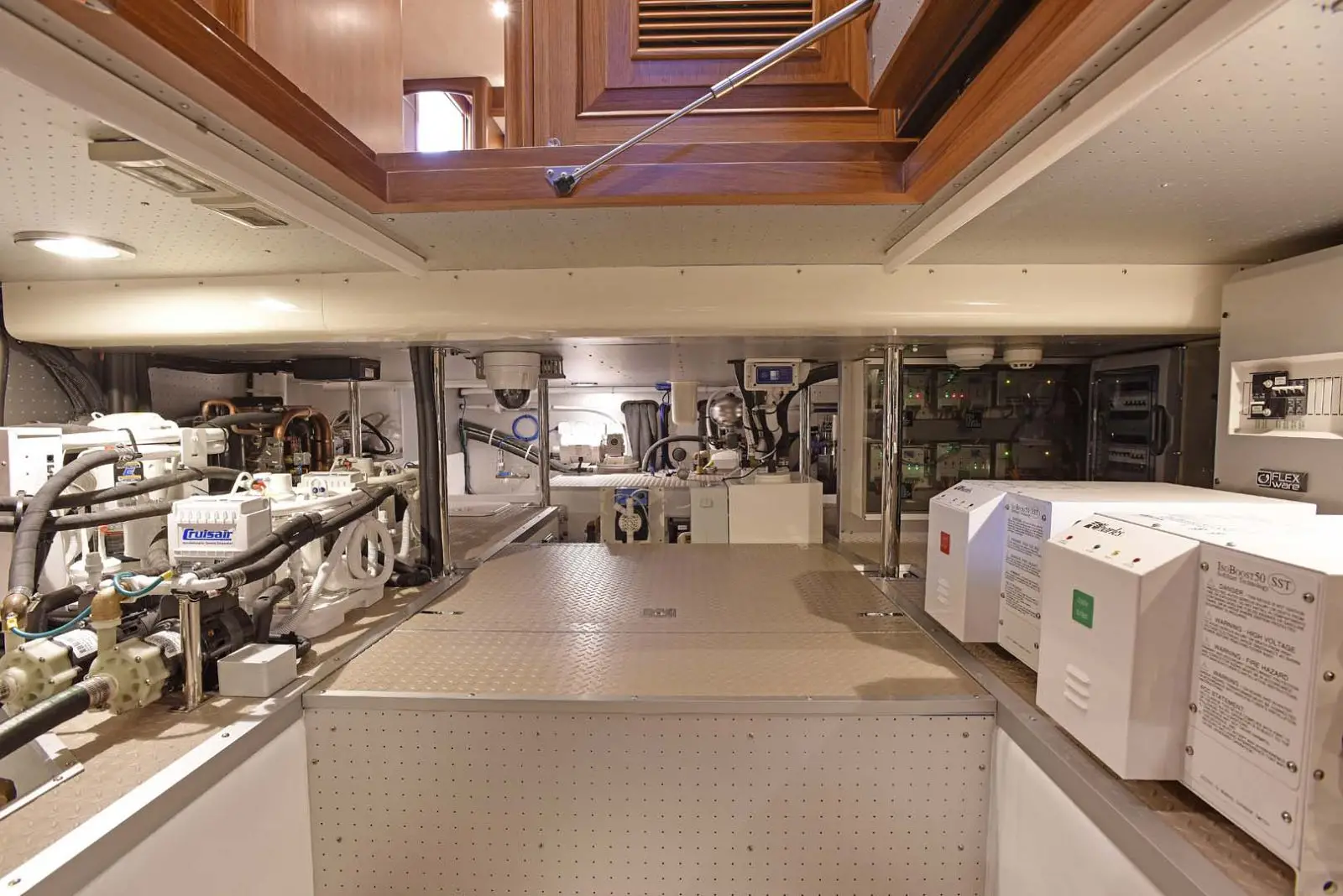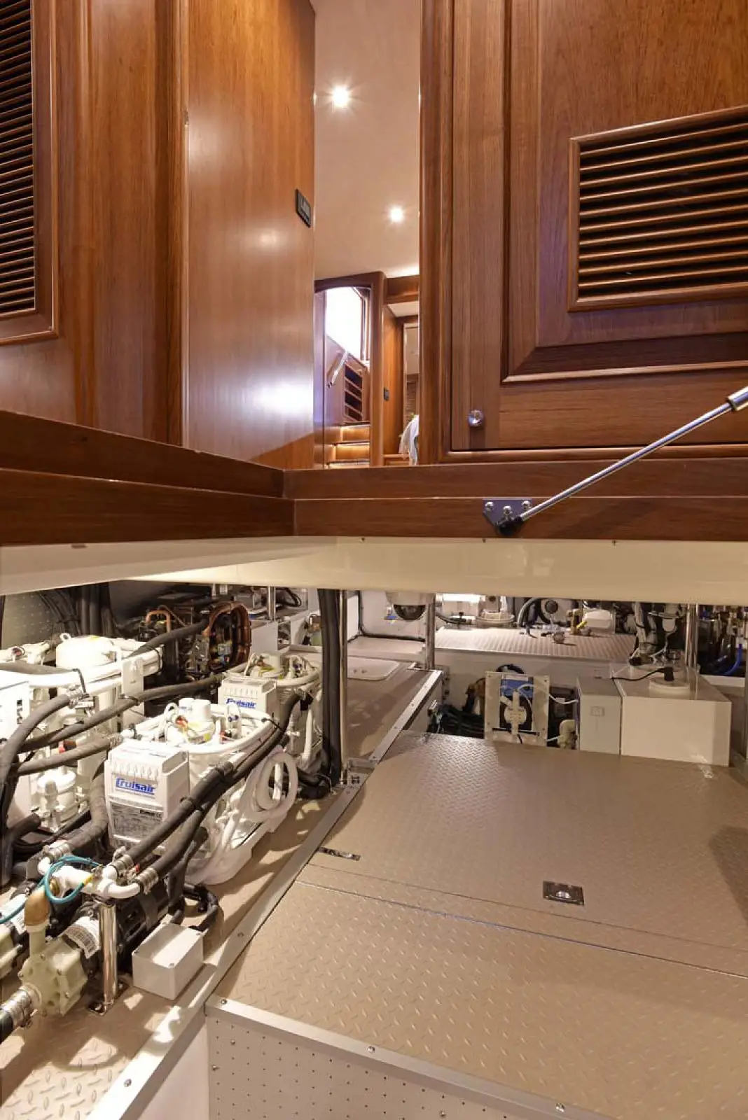 Unique to the Fleming 78 is an extensive machinery space located under the forward accommodations, it is very well illuminated with LED lighting. The cabin sole is double thickness and filled with lead/foam sound insulation to isolate the accommodations from this area, which is 29-feet long and is accessed through a hatch in the forward lobby. Installed in the machinery space are the pumps, water heaters, black and grey water tanks and air-conditioning units. This functional area frees up space in the engine room and keeps wiring and piping runs to a minimum. It also allows easy access to key components and makes it possible to access plumbing for toilets and showers from underneath.