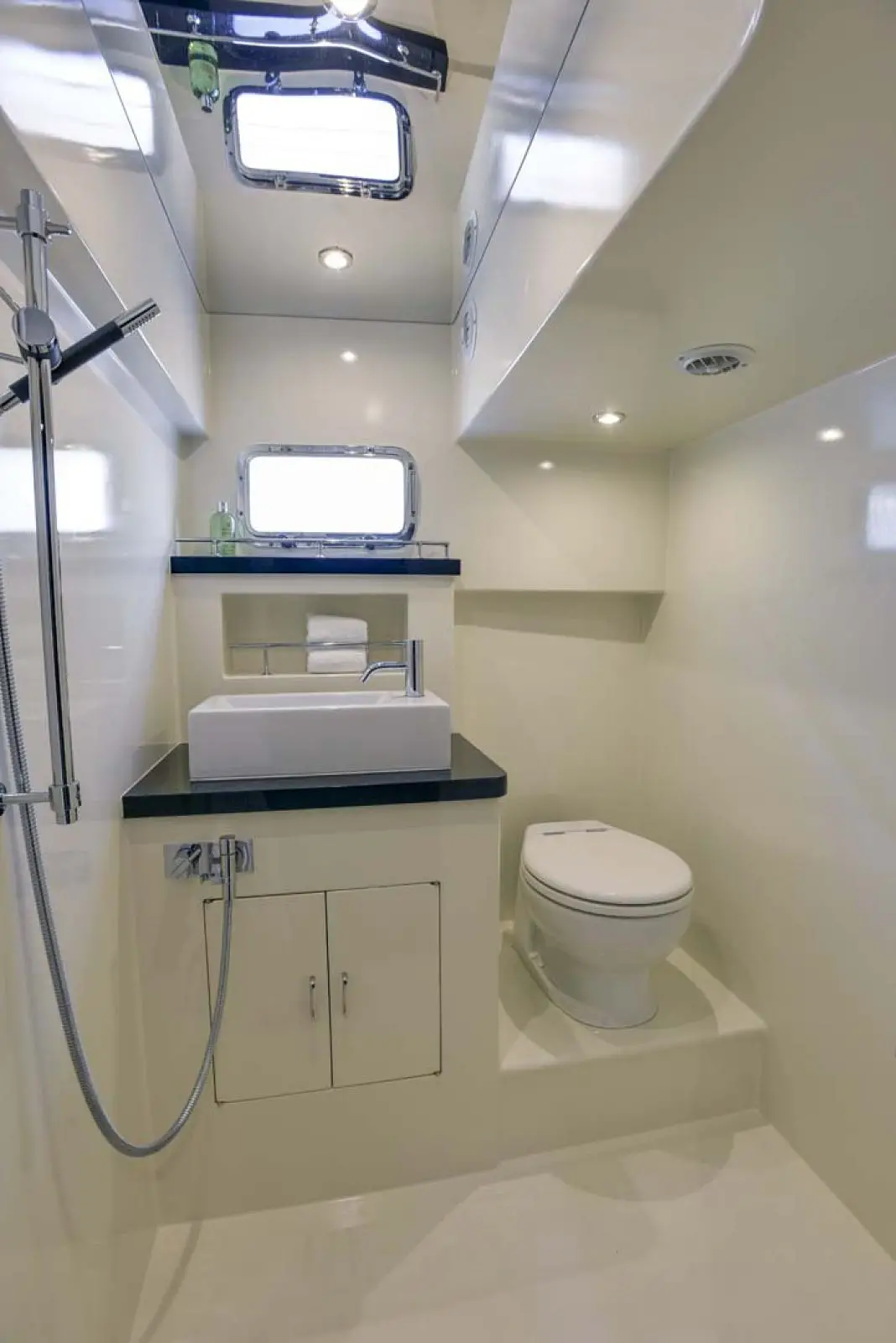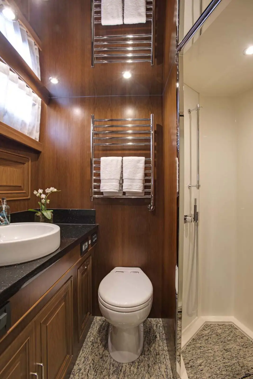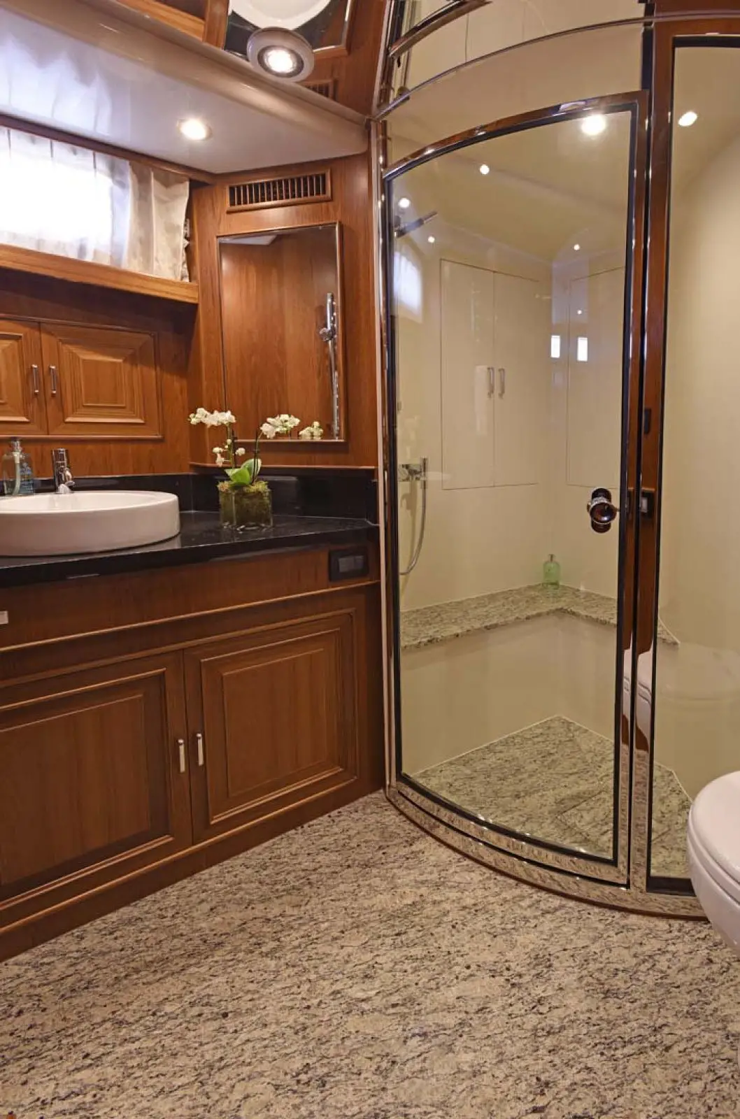 The owner's head features a shower stall or optional tub with a thermostatically controlled mixer valve in a fiberglass-lined enclosure. It is divided from the head by stainless steel and glass doors. A ceramic basin is set in a granite or marble-topped counter with designer faucets.