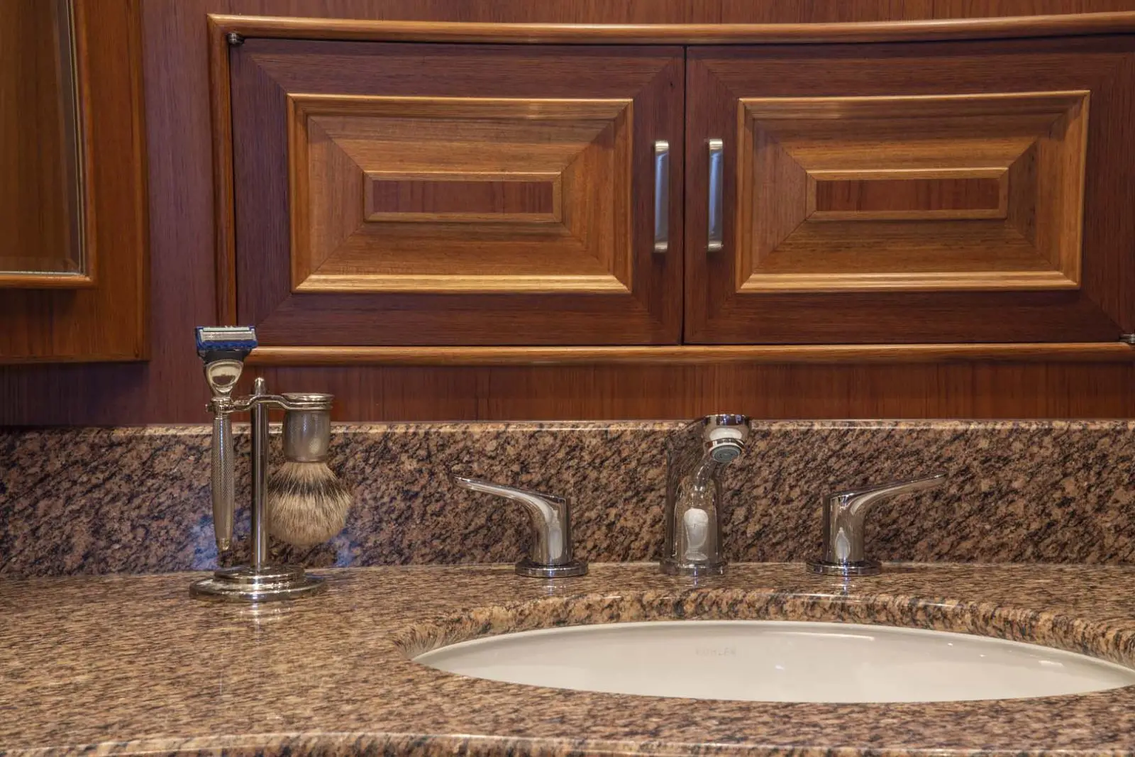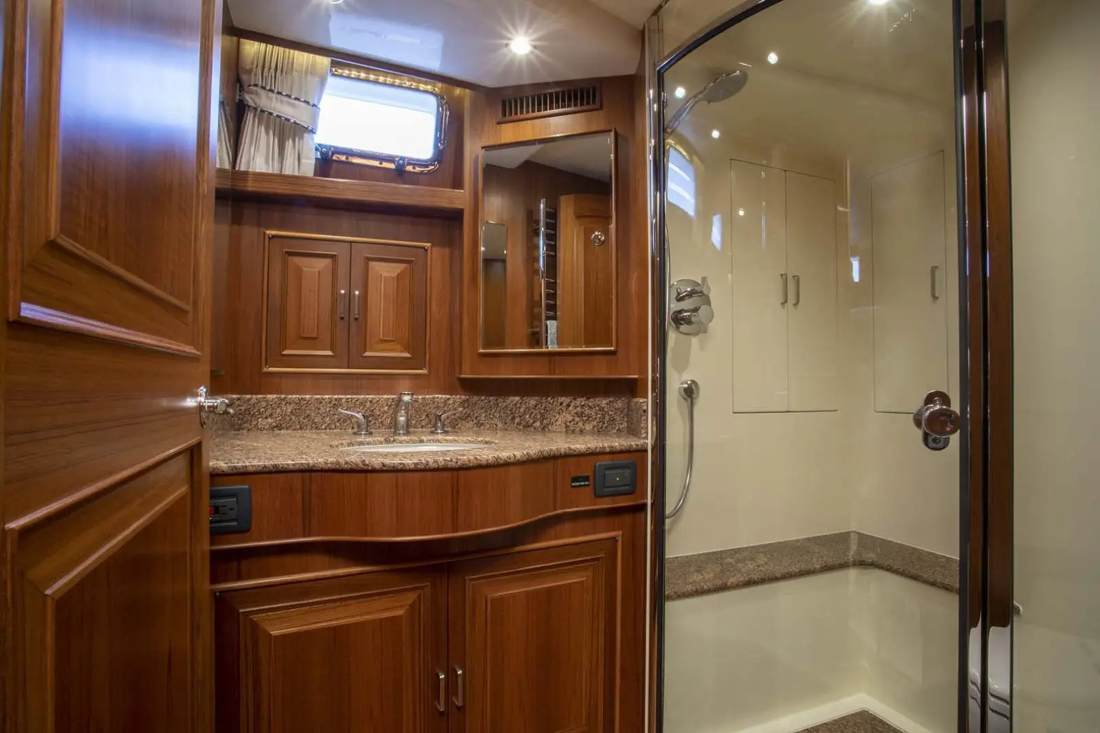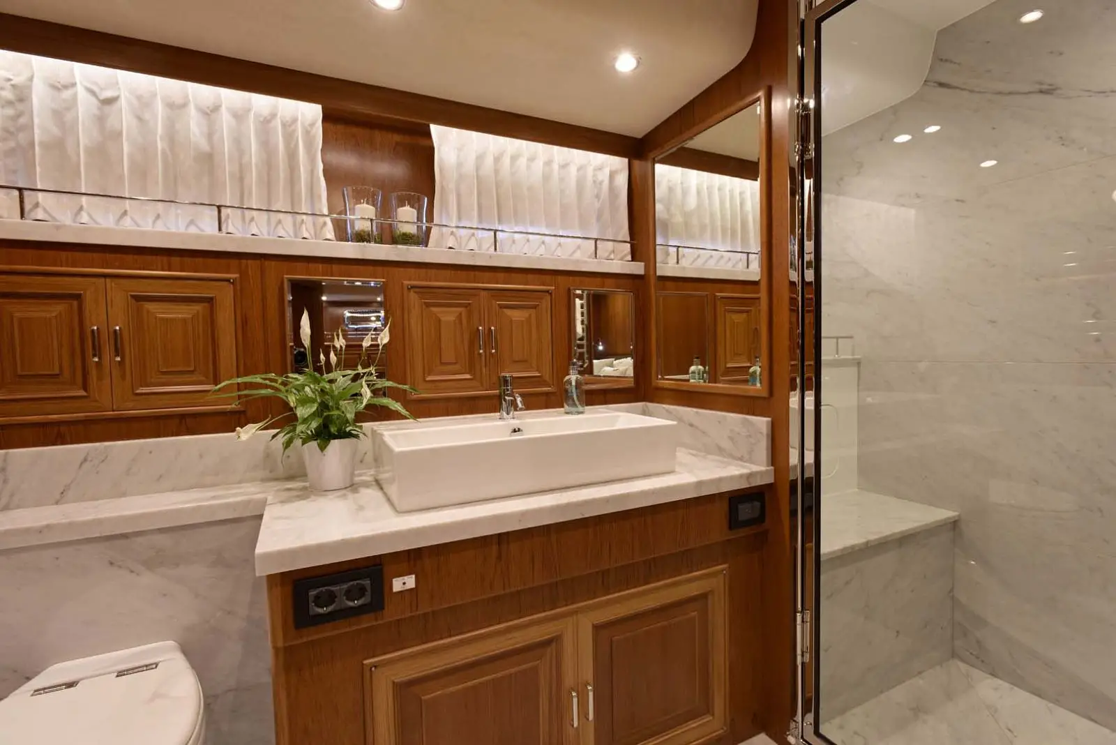 The owner's head features a shower stall or optional tub with a thermostatically controlled mixer valve in a fiberglass-lined enclosure. It is divided from the head by stainless steel and glass doors. A ceramic basin is set in a granite or marble-topped counter with designer faucets.