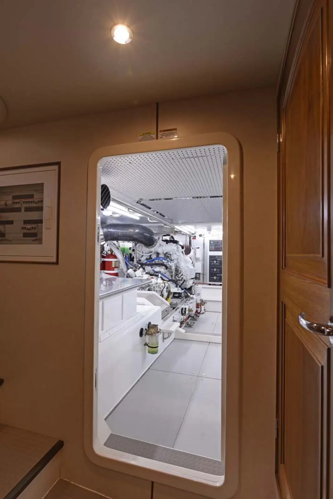 The 22-foot long, full height engine room in the Fleming 78 is spacious, brightly lit and laid out with easy access to all equipment. There are even lights illuminating the drip pans under the engines. Stainless steel overhead handrails run the full length of the engine room. The overhead is up to 8" thick, filled with sound insulation. A workbench with drawers, and stainless work surface are standard. Floorboards are dressed with checkerplate-patterned Lonseal for appearance and sound attenuation. The engine room is lined with a reflective alloy pegboard for easy maintenance. The access door is an internally insulated, submarine type with gasket, double latch and inspection window.