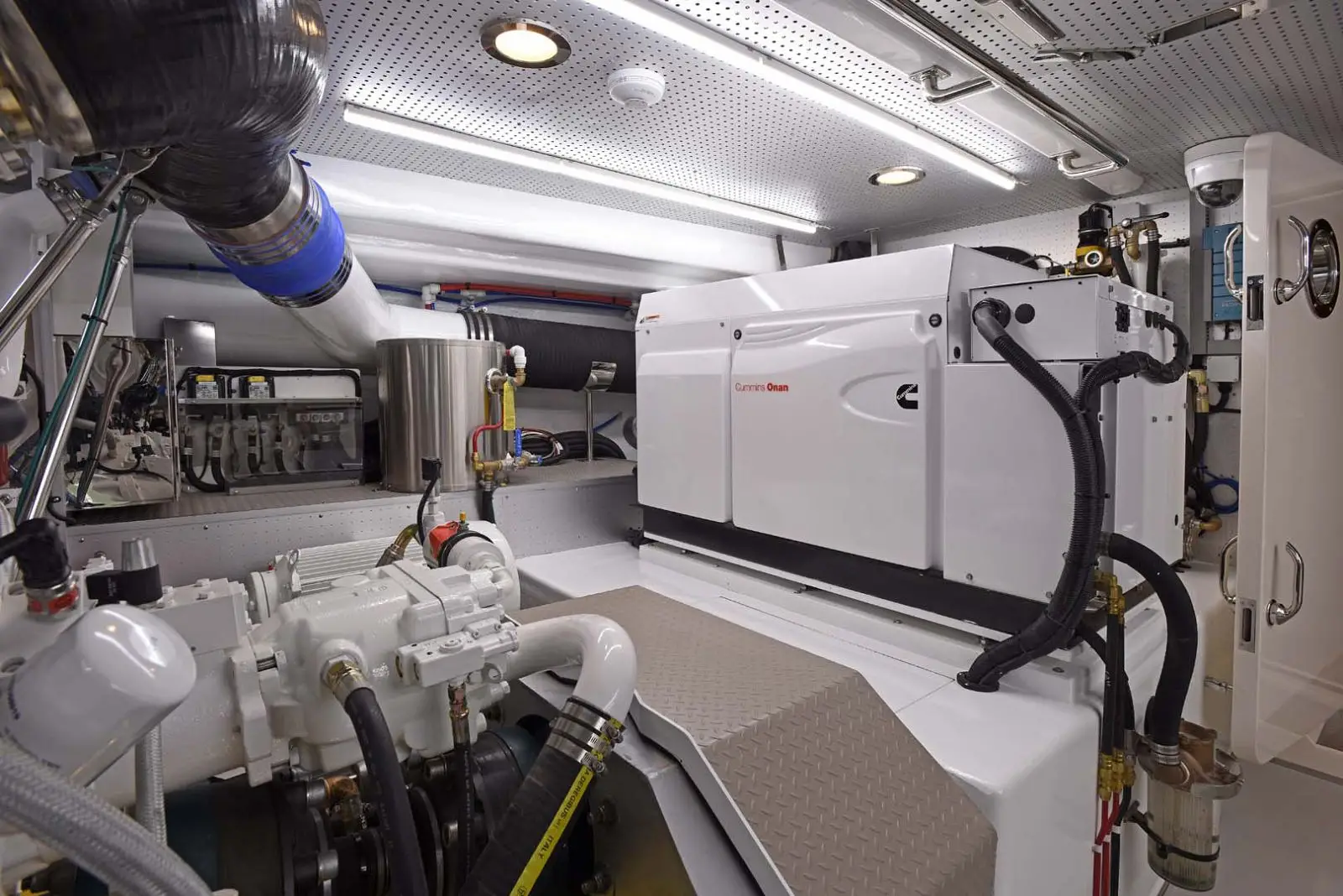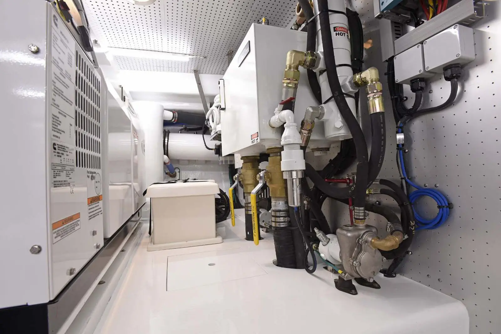 Standard generators are two 29 KW Onan eQD in sound shields. Generator exhausts pass through waterdrop mufflers to reduce exhaust noise to a whisper. Special attention has also been paid to the main engine exhaust system, which has been designed to keep the boat as quiet and free from vibration as possible.