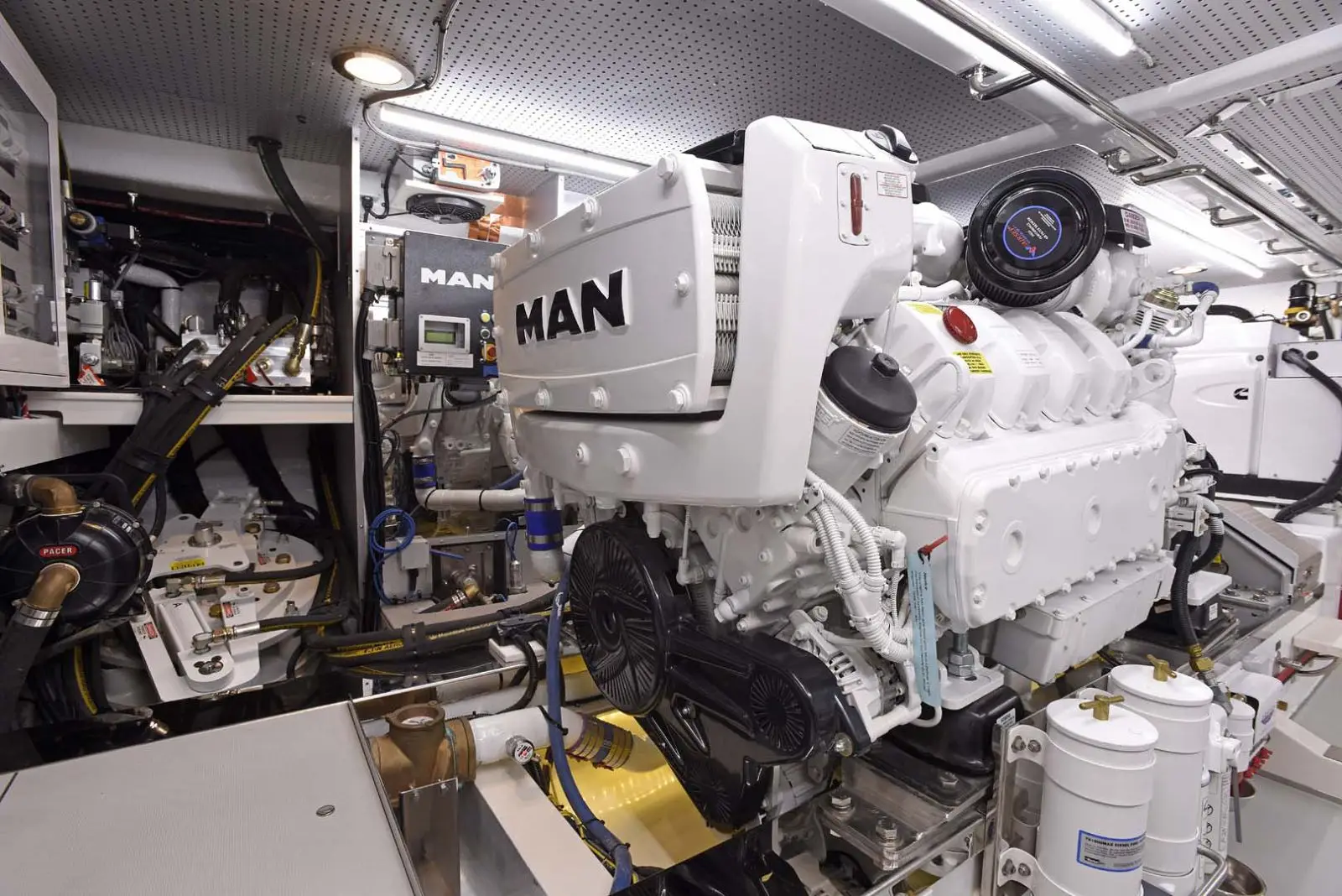 Naturally the main engines are the most prominent items of equipment in the engine room. Standard engines are MAN V12-1550 HP, with optional MAN V8-1200, MAN V8-1000 and MAN i6-800 hp. There is good access around both sizes of engines and both are fitted with additional 200 amp hevy duty brushless alternators controlled by an external regulator. Oversize raw water intake ball valves and sea strainers are conveniently placed.