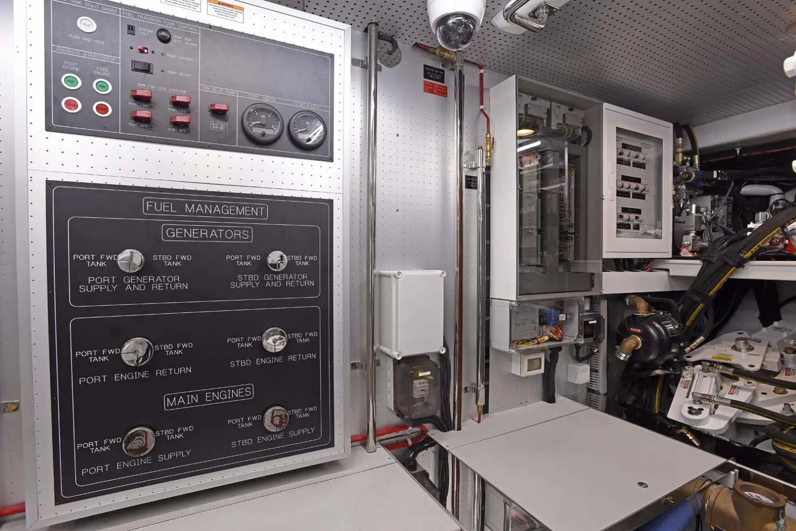 The two main fuel tanks divide the engine room from the accommodations and total 2,500 US gals (9,463 liters). Two auxiliary wing tanks bring the total fuel capacity up to 3,000 US gals (11,356 liters). The fuel tanks are located on the longitudinal center of gravity so the trim of the Fleming does not change as fuel is consumed. Sight gages show the height of the fuel in every tank and pressure sensors display the contents, in gallons, liters and percentage, on the FFM monitoring system in the pilothouse. Twin Racor filters with vacuum gages, change-over valves and stainless steel drip trays are standard as is a fuel transfer pump, with filter and counter, which can be used to transfer fuel between tanks. Fuel selector panels provide easy selection for supply and return to and from main engines and generators. Storage bins for spares are provided above the side tanks.