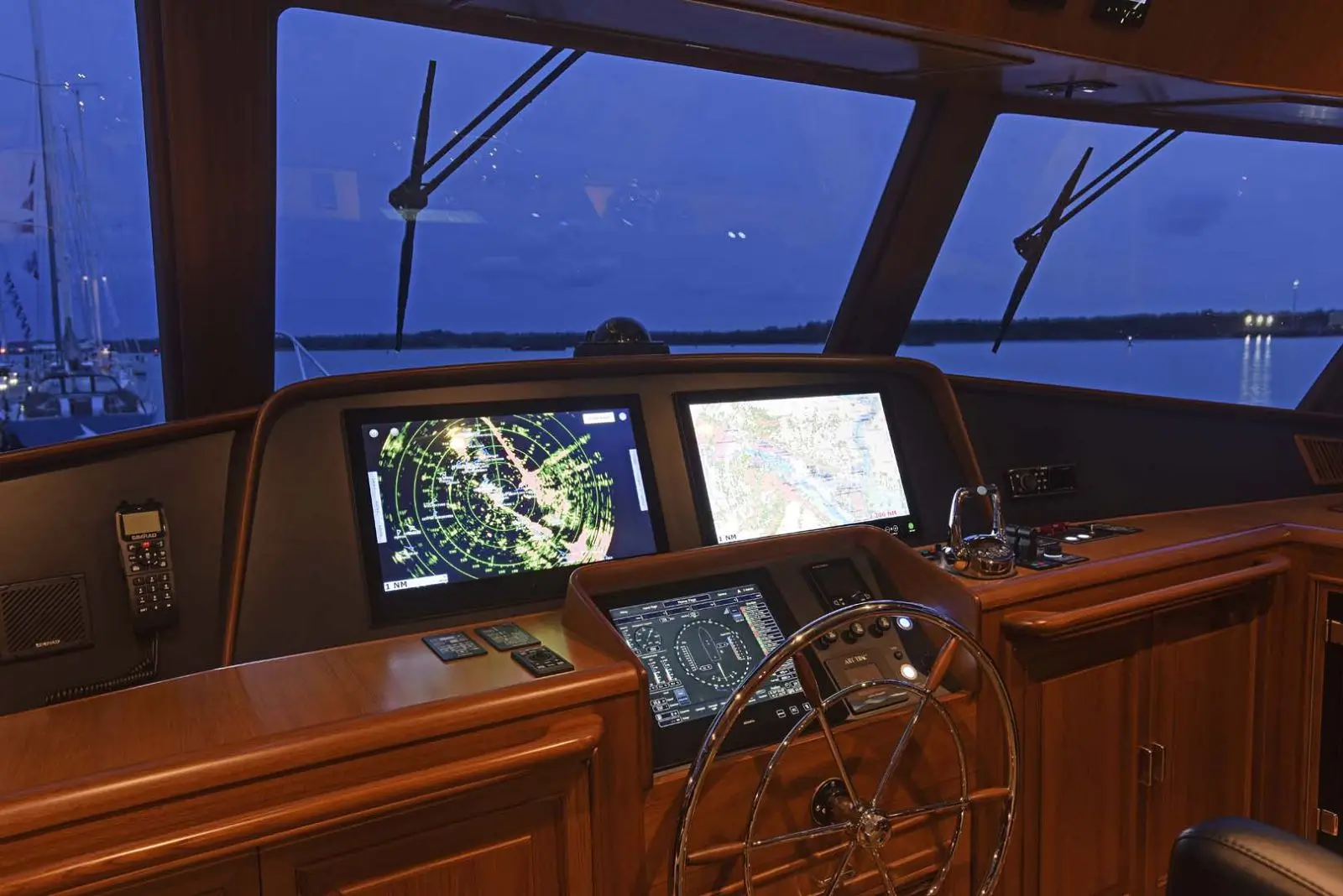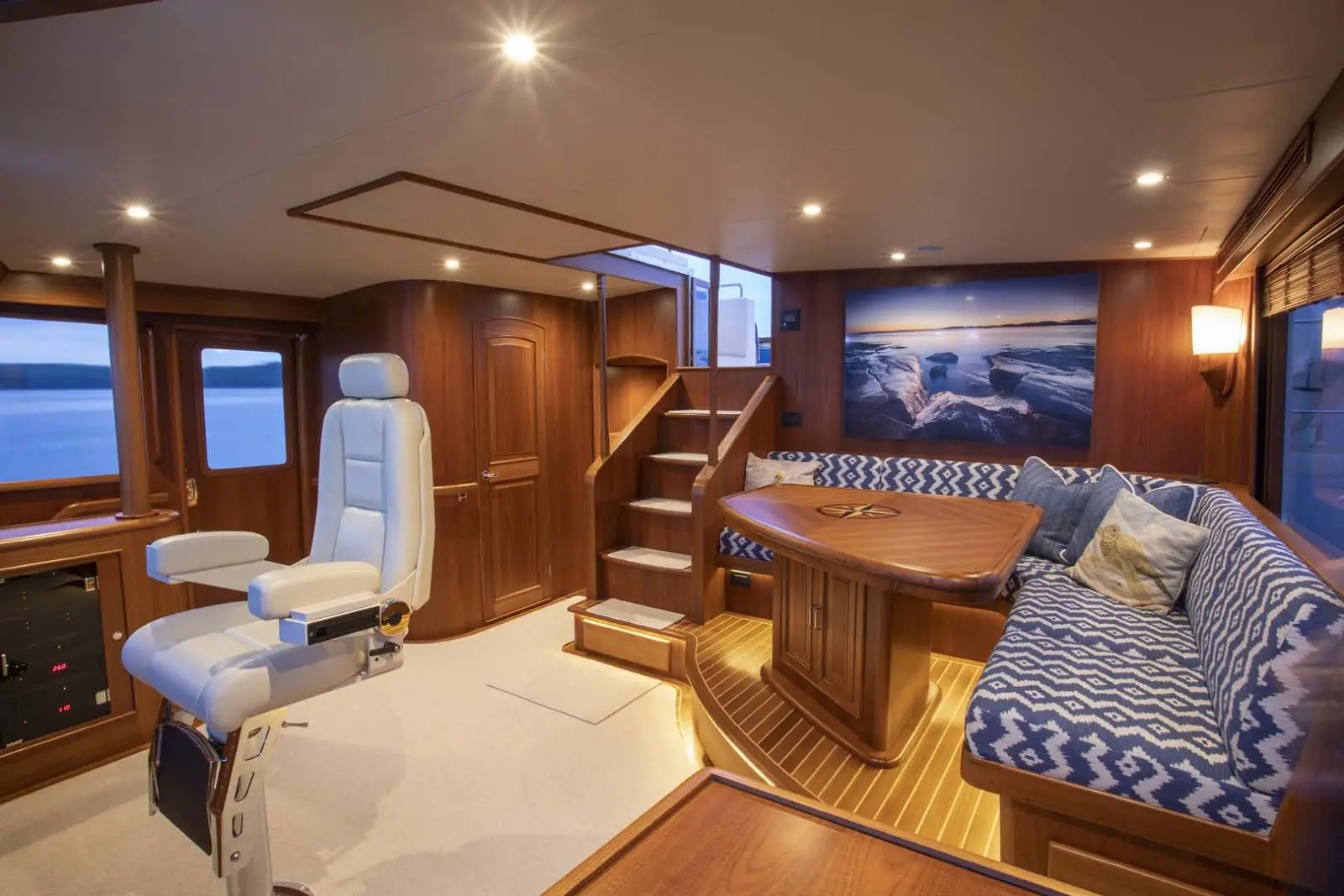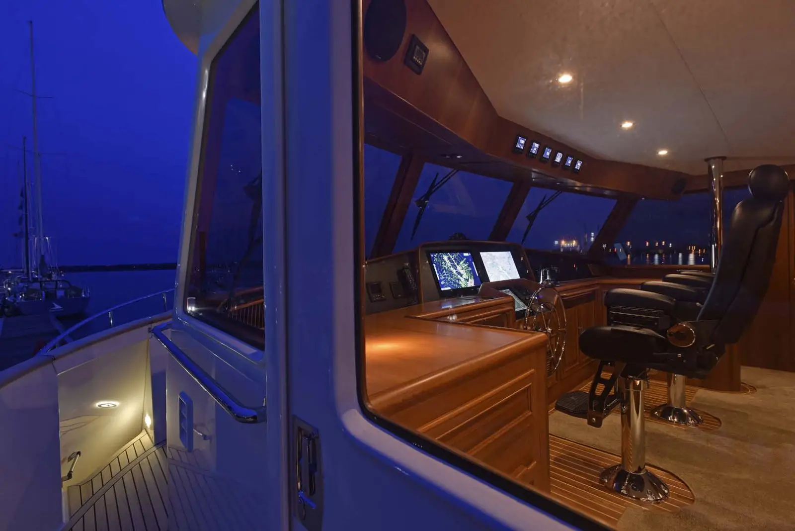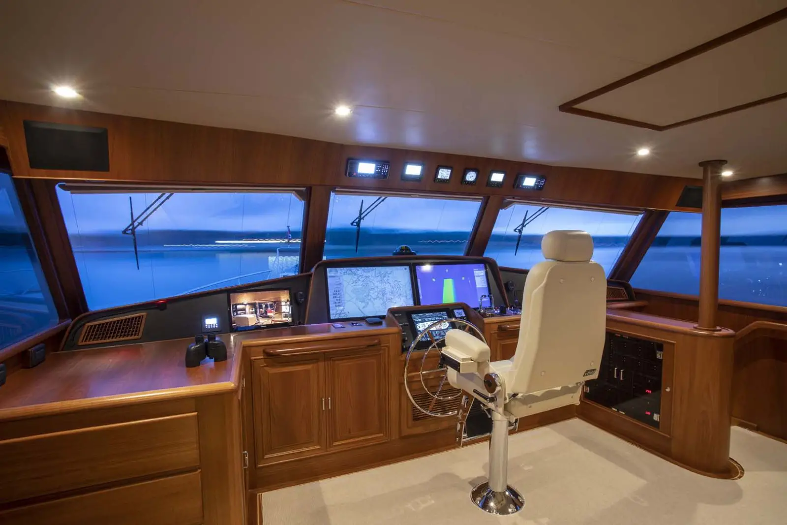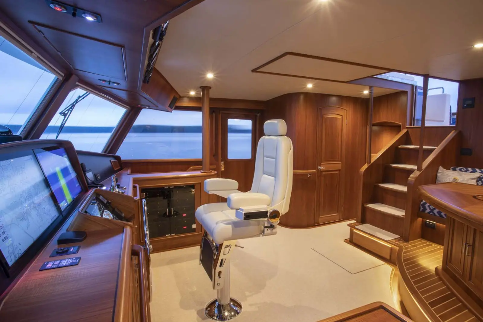The spacious Fleming 78 pilothouse has the feel of a bridge of a much larger vessel and is the nerve and social center of the boat. Gently curving stairs lead down to the accommodations and short companionways lead up to the flybridge and down to the salon. Sliding doors on either side give access to port and starboard bridge decks. Throughout there are ample handrails for security.