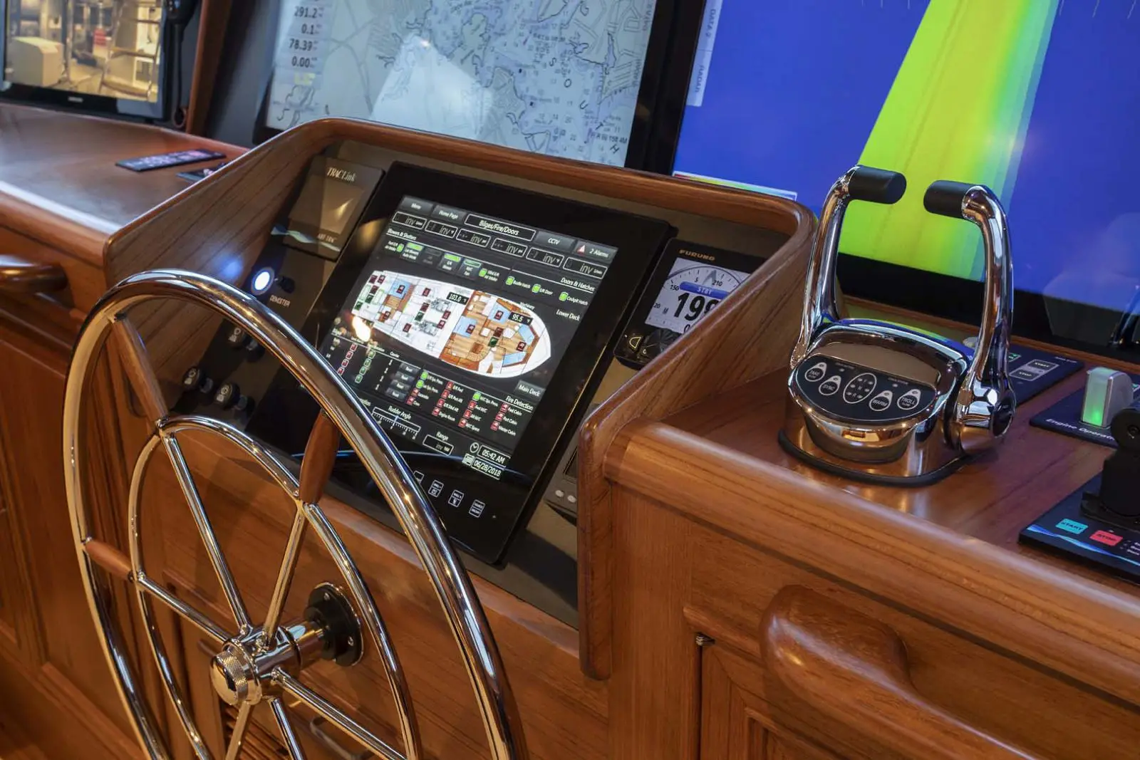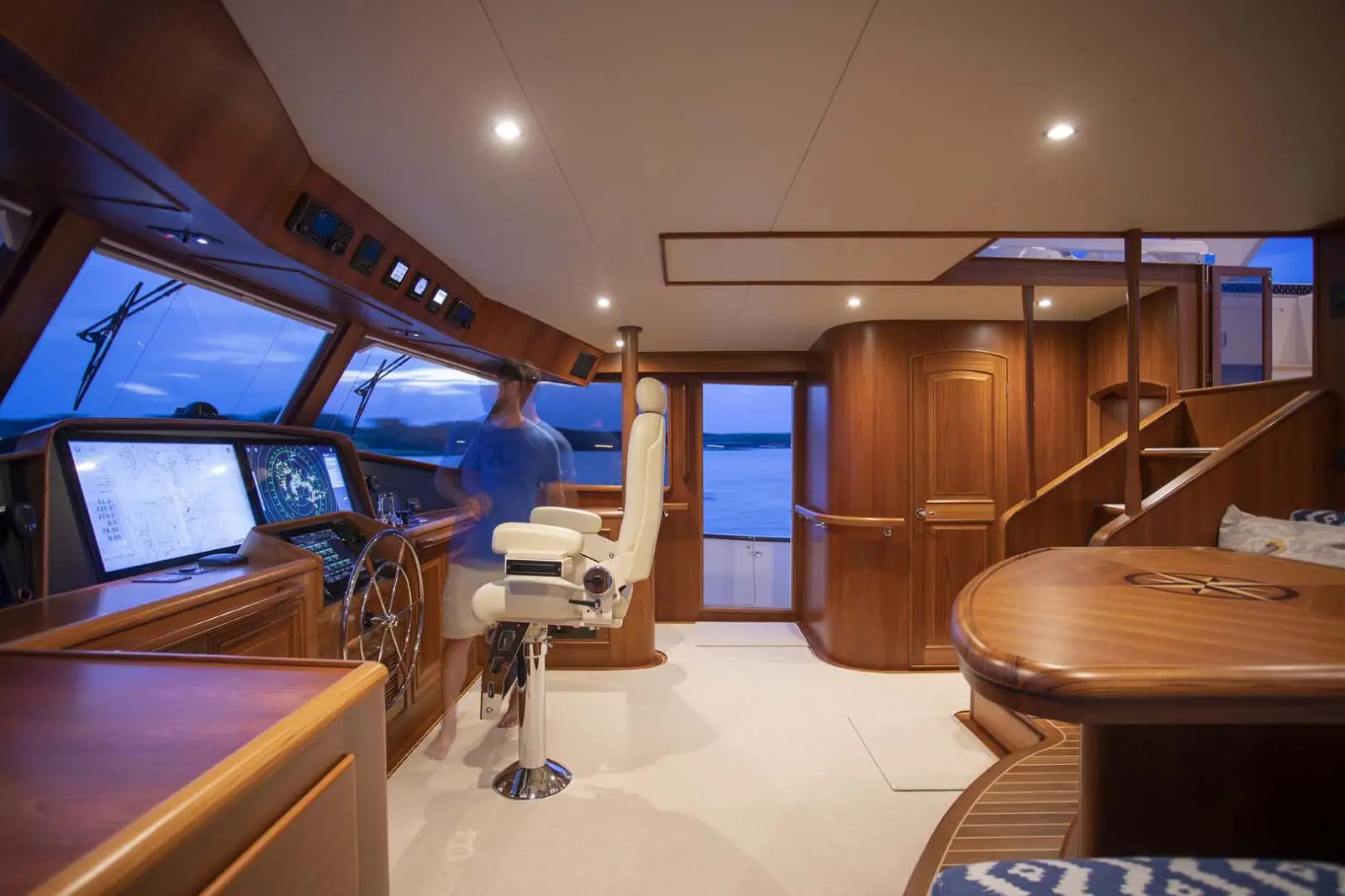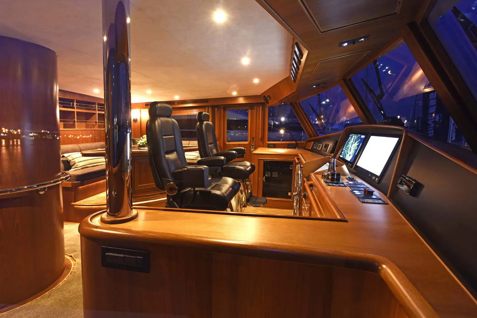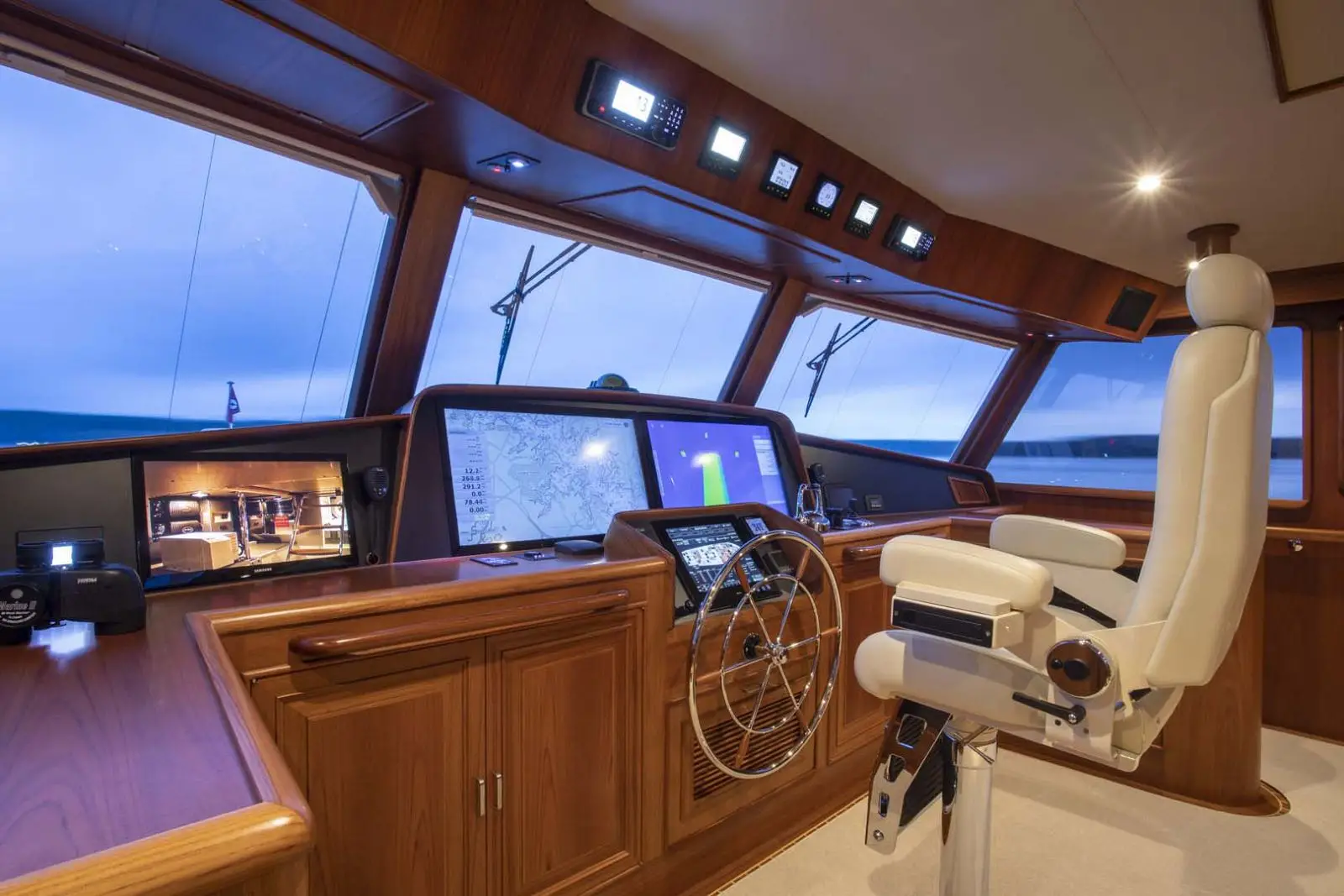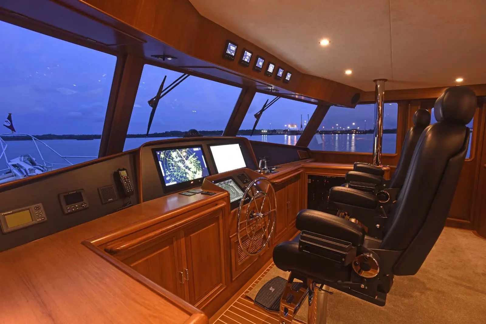 The spacious Fleming 78 pilothouse has the feel of a bridge of a much larger vessel and is the nerve and social center of the boat. Gently curving stairs lead down to the accommodations and short companionways lead up to the flybridge and down to the salon. Sliding doors on either side give access to port and starboard bridge decks. Throughout there are ample handrails for security.