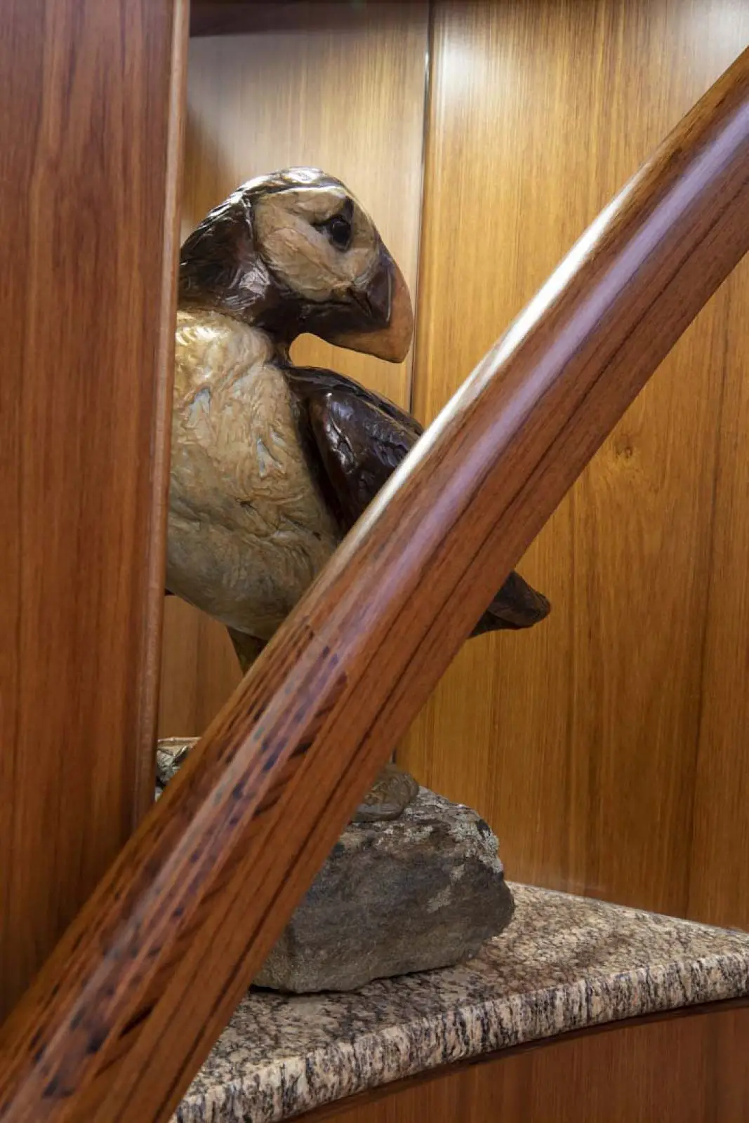 Access to the crew's quarters and the engine room are from the port side deck, via an access door and stairs, which lead down to the aft lobby. This location allows the crew to come and go from their quarters, and the engine room, without disturbing the guests enjoying the amenities of the California deck.