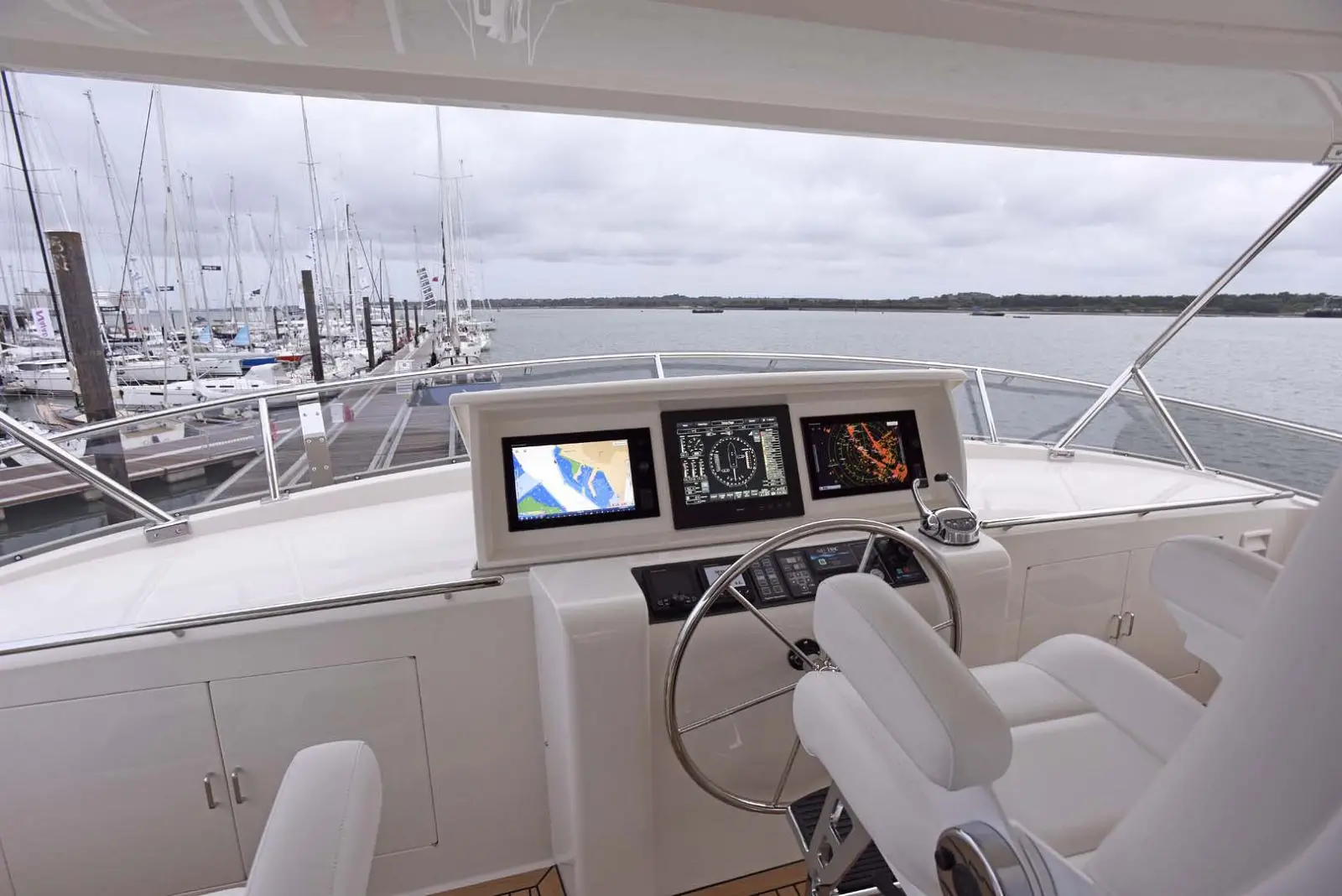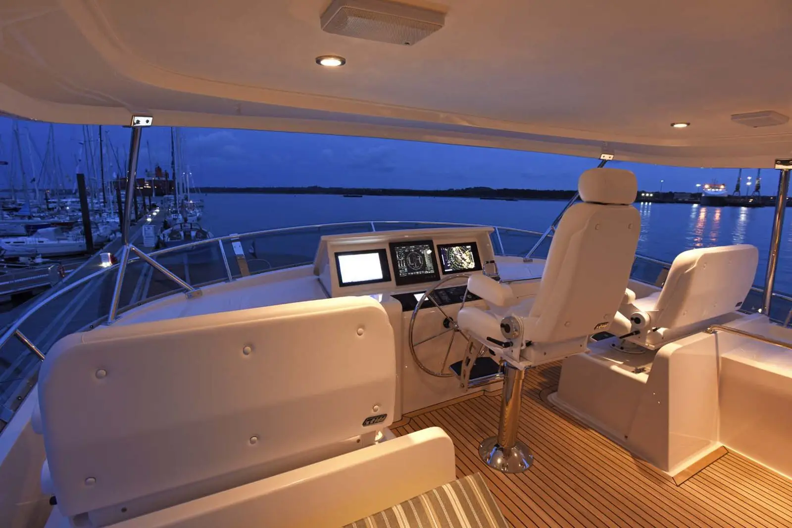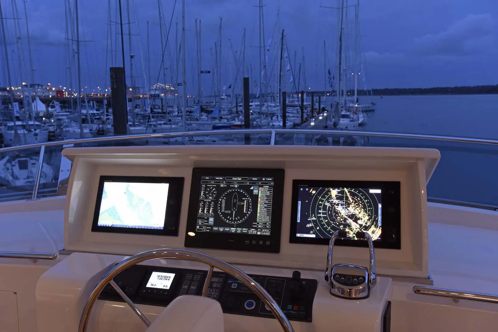 An L-shaped settee, raised up for enhanced visibility, is set around a teak table with storage built into the leg. Wood window blinds slot into retainers. An optional, hydraulically operated pilot-berth can be recessed into the aft bulkhead. To port is a chart table and flexible chart light. Of course, the main function of the pilothouse is to provide a dedicated area for piloting free from distractions. The Fleming 78 has achieved this with style and luxury. There is space for a full range of electronics in full-width upper and lower consoles. Engine instrumentation and controls as well as the bow & stern thruster joysticks are grouped at the helm station. One Stidd helmseat is standard but there is space for two additional chairs. There are separate swing-out, back-lit switch panels.