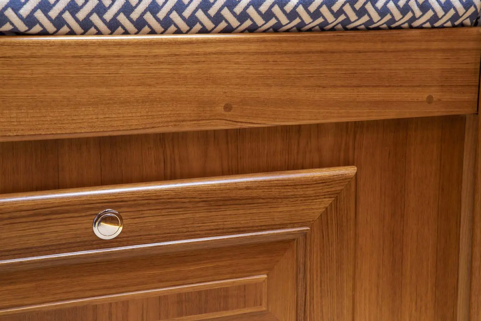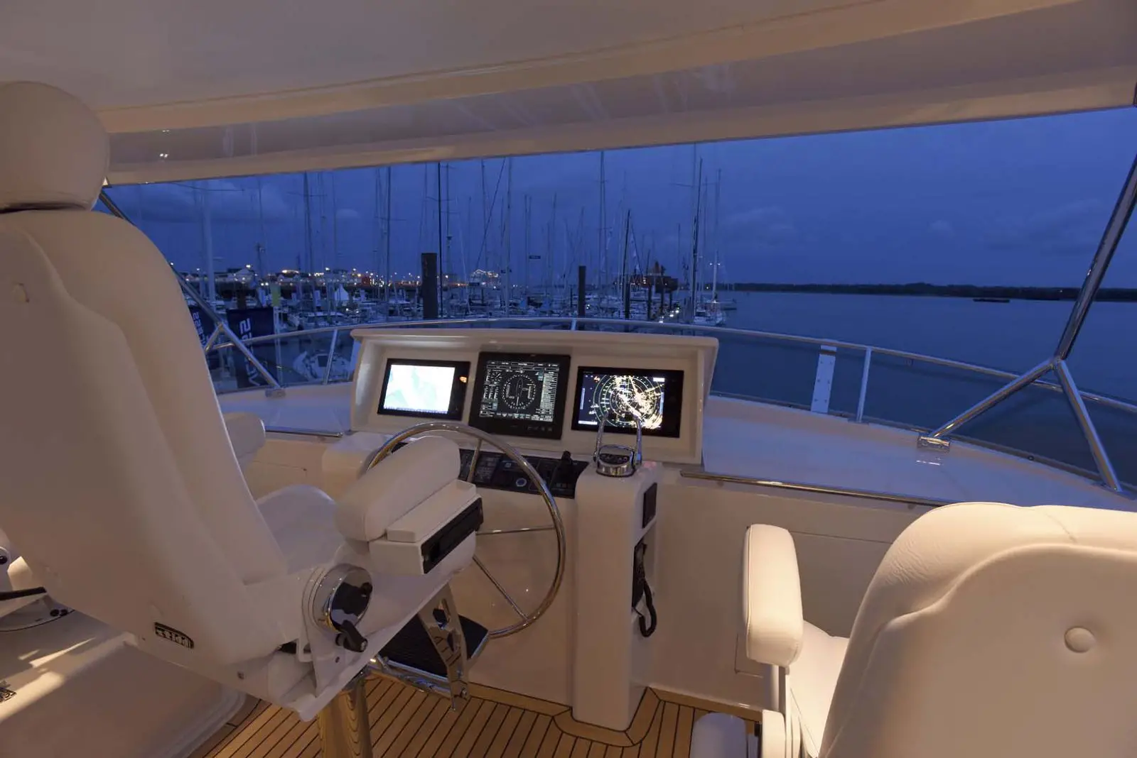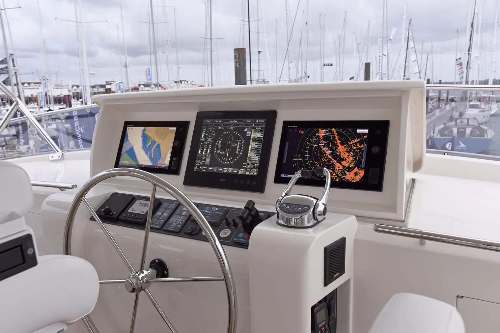 An L-shaped settee, raised up for enhanced visibility, is set around a teak table with storage built into the leg. Wood window blinds slot into retainers. An optional, hydraulically operated pilot-berth can be recessed into the aft bulkhead. To port is a chart table and flexible chart light. Of course, the main function of the pilothouse is to provide a dedicated area for piloting free from distractions. The Fleming 78 has achieved this with style and luxury. There is space for a full range of electronics in full-width upper and lower consoles. Engine instrumentation and controls as well as the bow & stern thruster joysticks are grouped at the helm station. One Stidd helmseat is standard but there is space for two additional chairs. There are separate swing-out, back-lit switch panels.