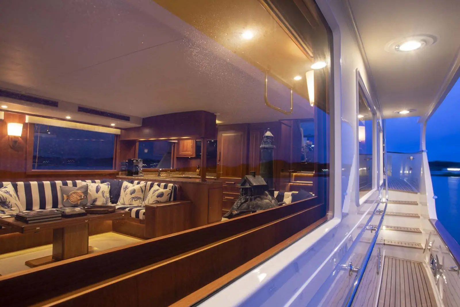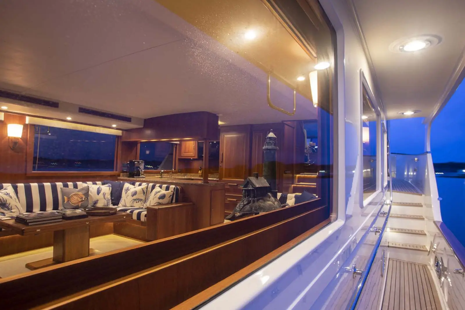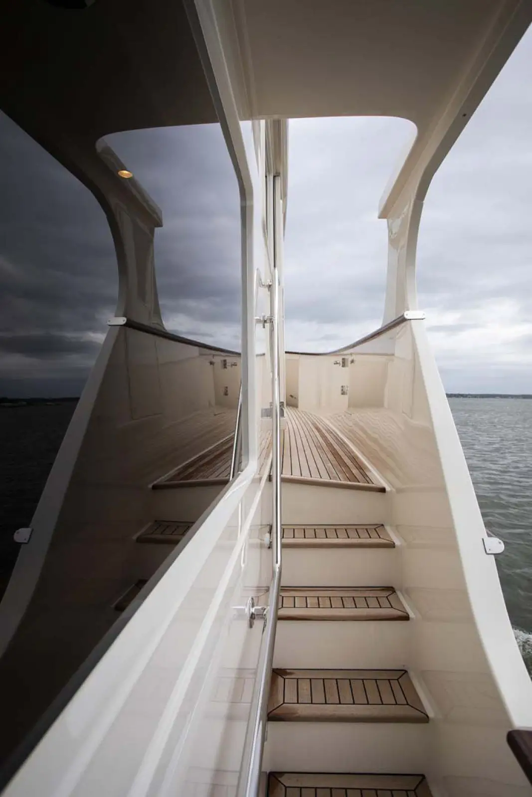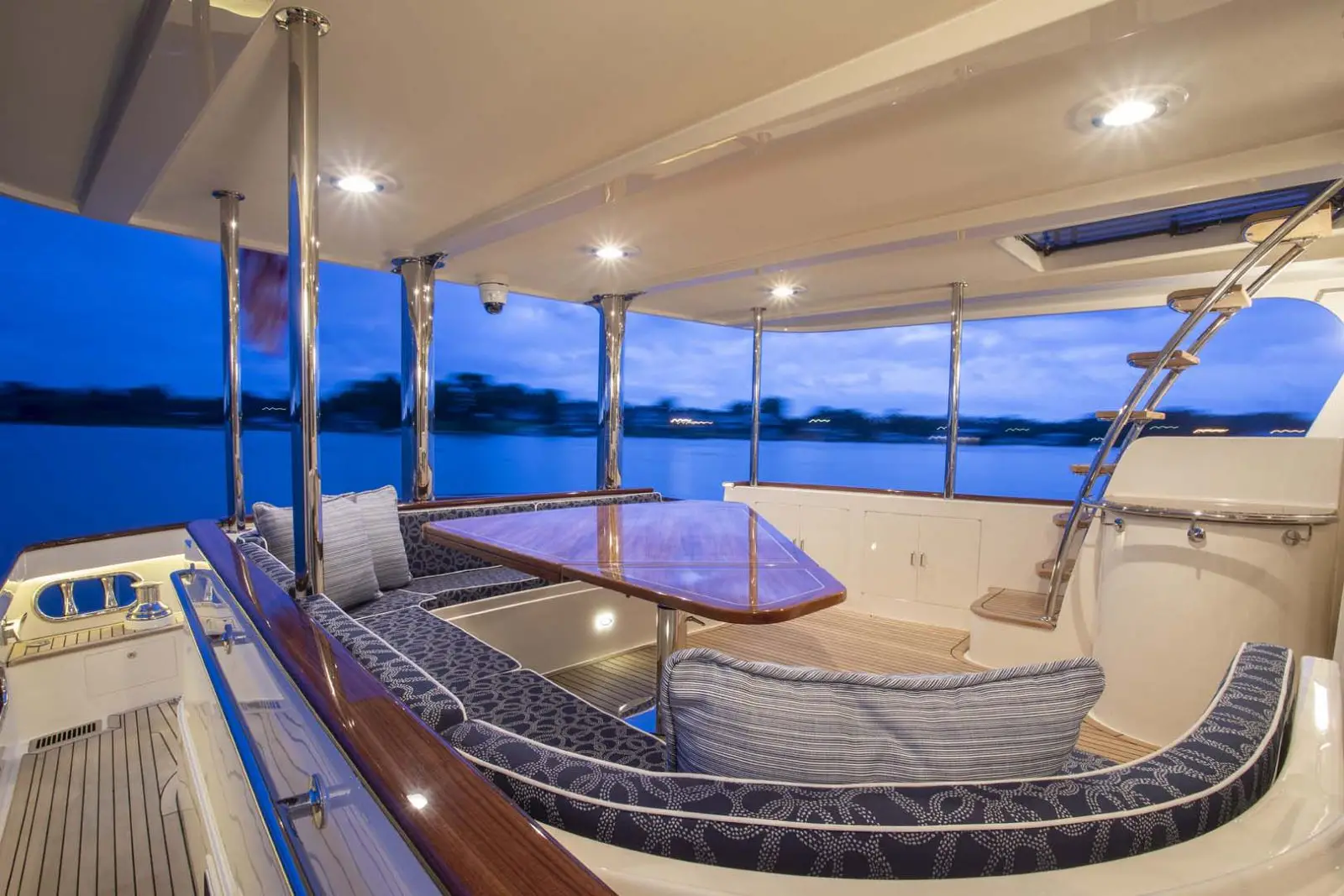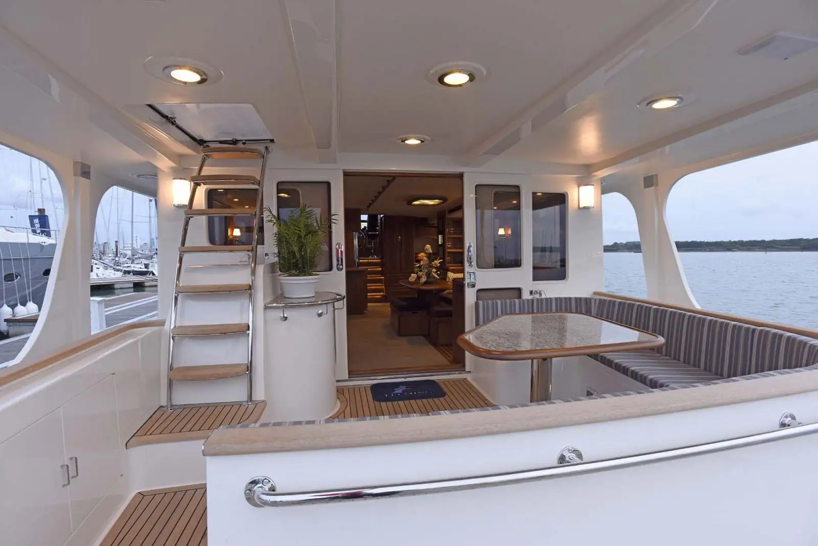 The California Deck features a fixed settee around a teak-topped table. To port is a serving area with a stainless rail. There is overhead lighting as well as courtesy lights and custom lights on the aft face of the deckhouse. Access to the boat deck is provided by a curved ladder with radiused teak treads and oval section stainless tubes.